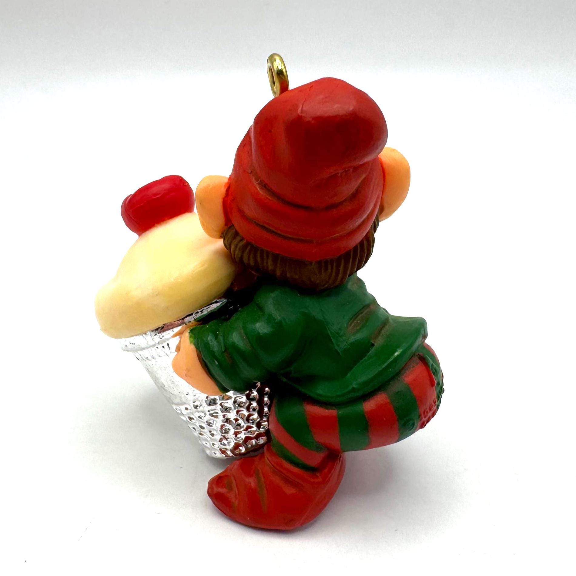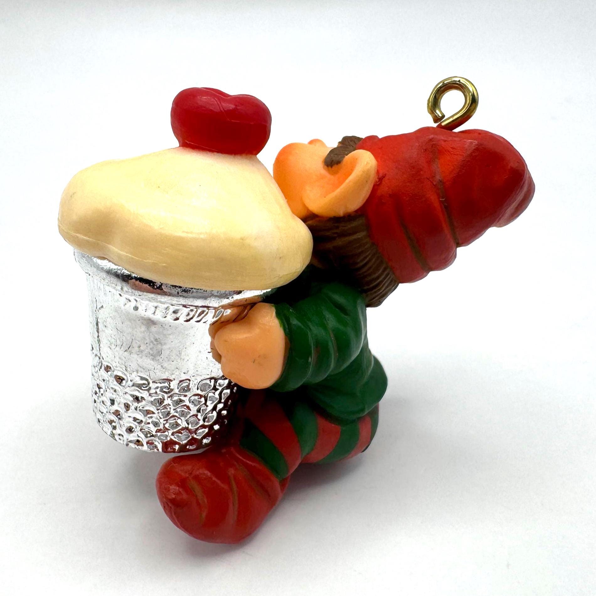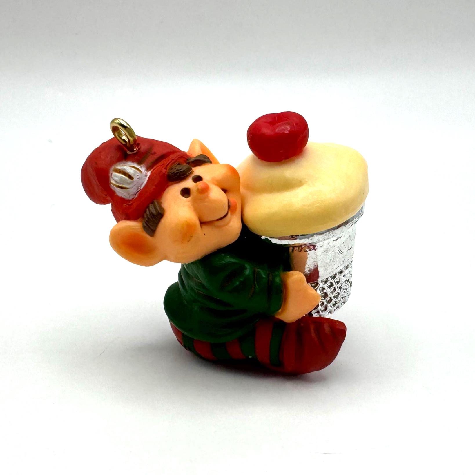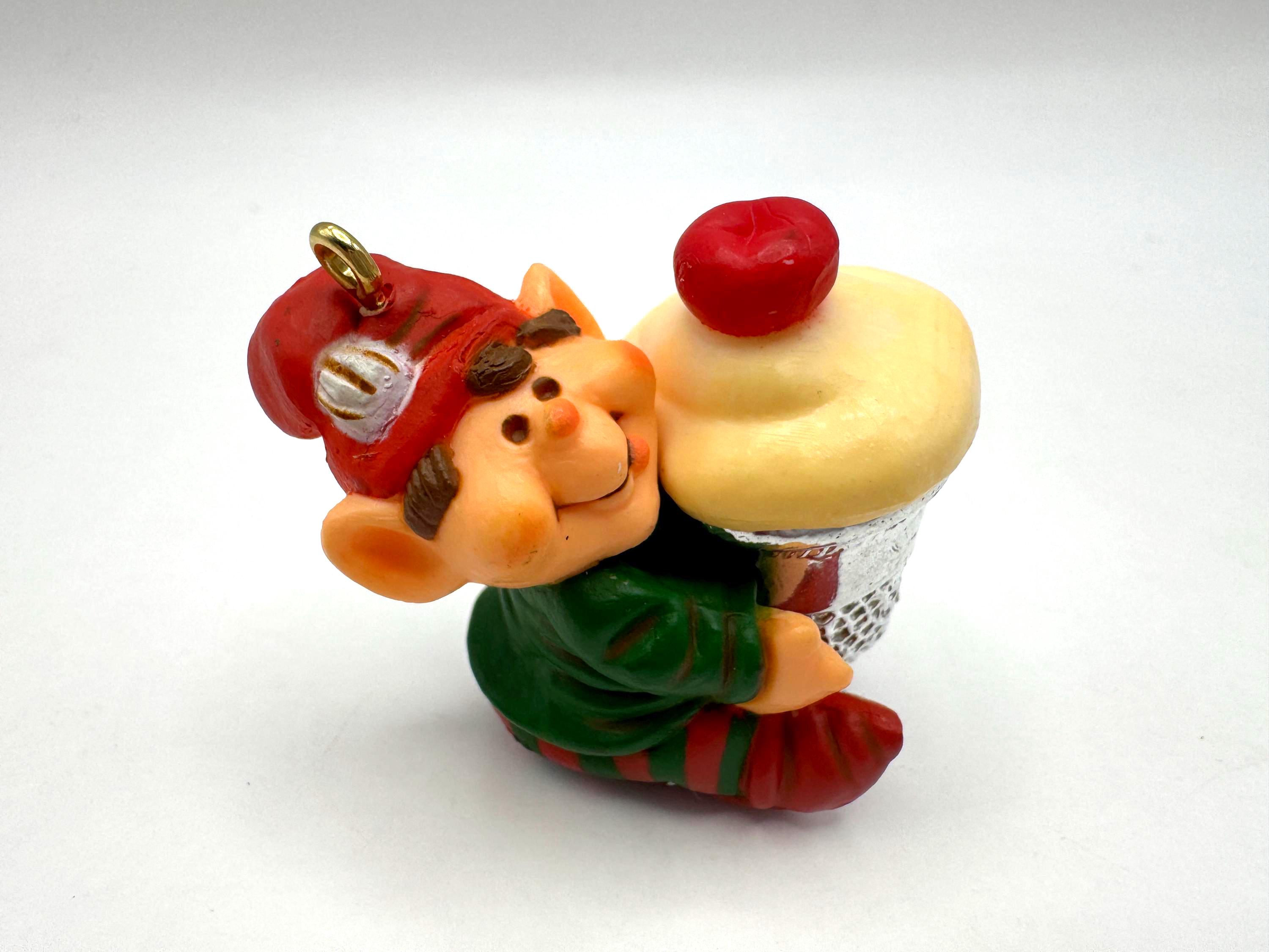 Add a dose of whimsical charm to your holiday décor with this vintage 1983 Hallmark Cards elf ornament. This cheerful little elf is all bundled up in red-and-green stripes and proudly carrying a cupcake tucked inside a silver sewing thimble — a playful nod to crafting and baking that makes this piece extra unique.