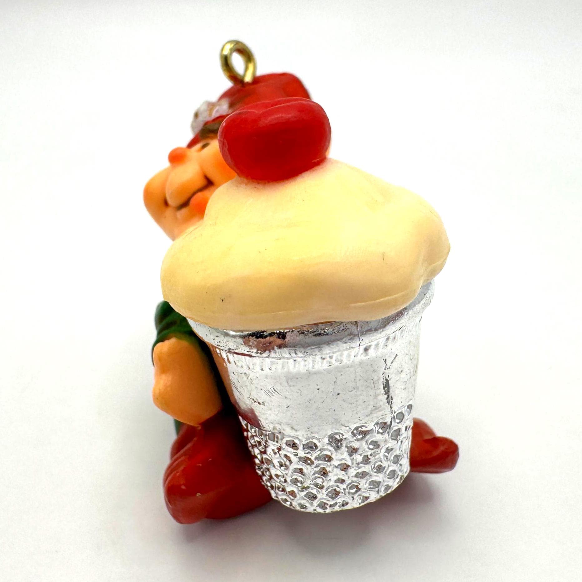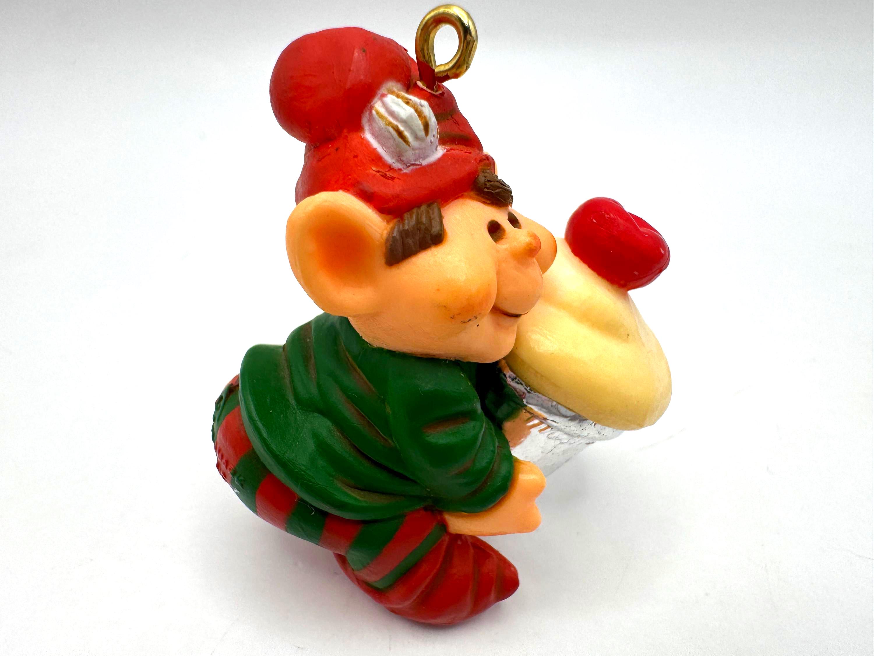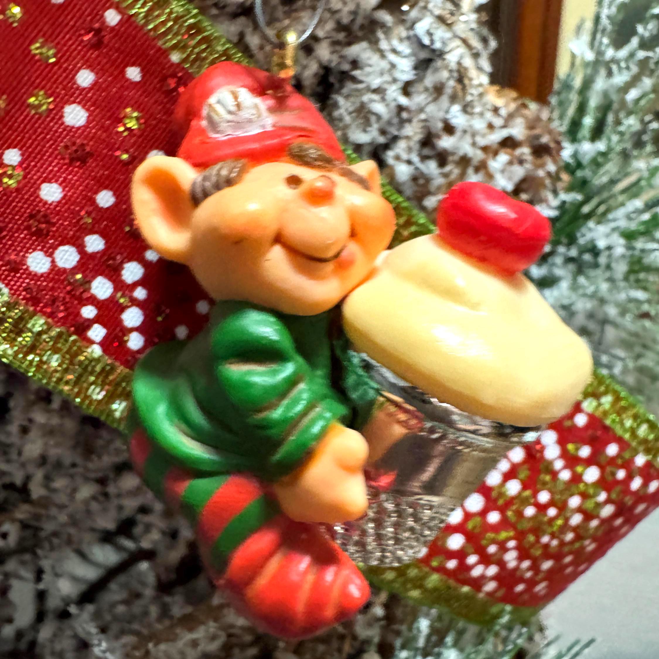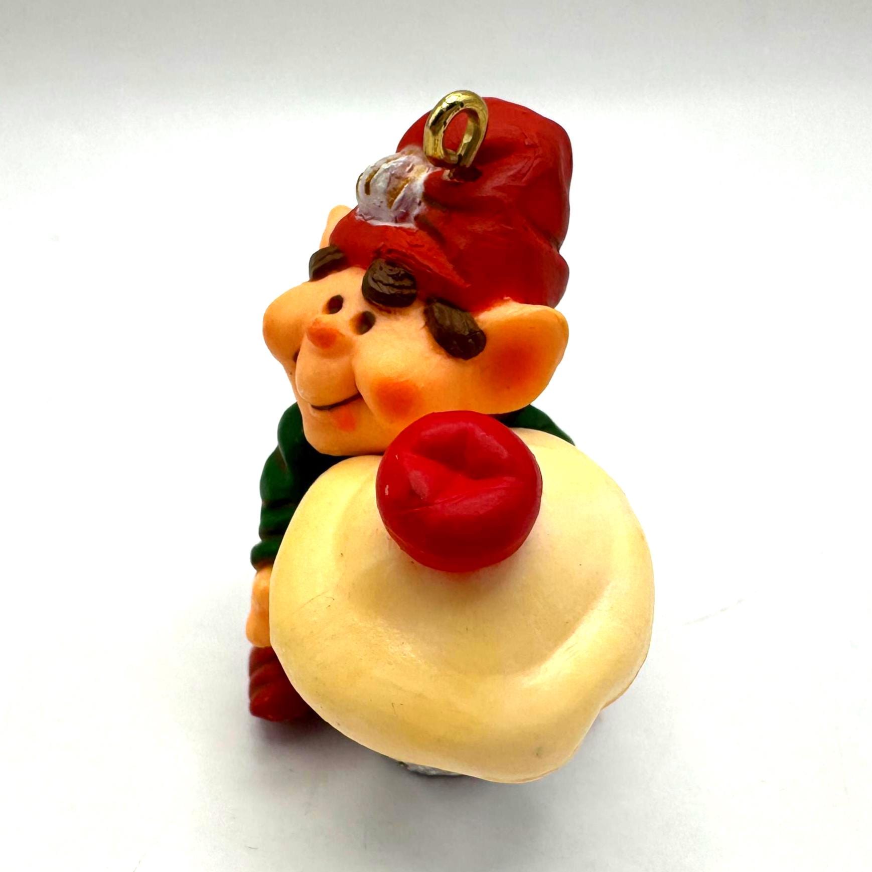 Add a dose of whimsical charm to your holiday décor with this vintage 1983 Hallmark Cards elf ornament. This cheerful little elf is all bundled up in red-and-green stripes and proudly carrying a cupcake tucked inside a silver sewing thimble — a playful nod to crafting and baking that makes this piece extra unique.