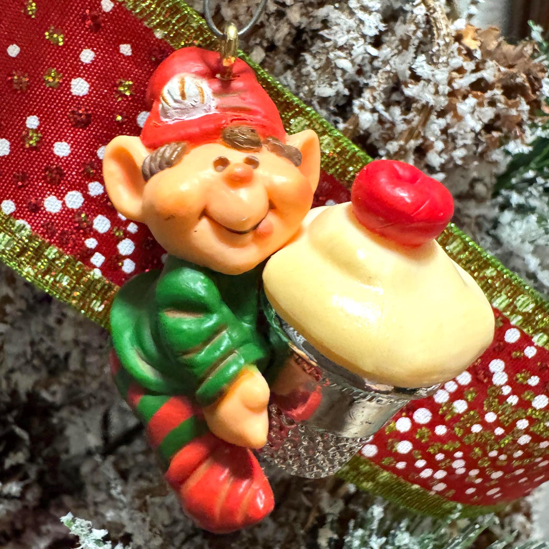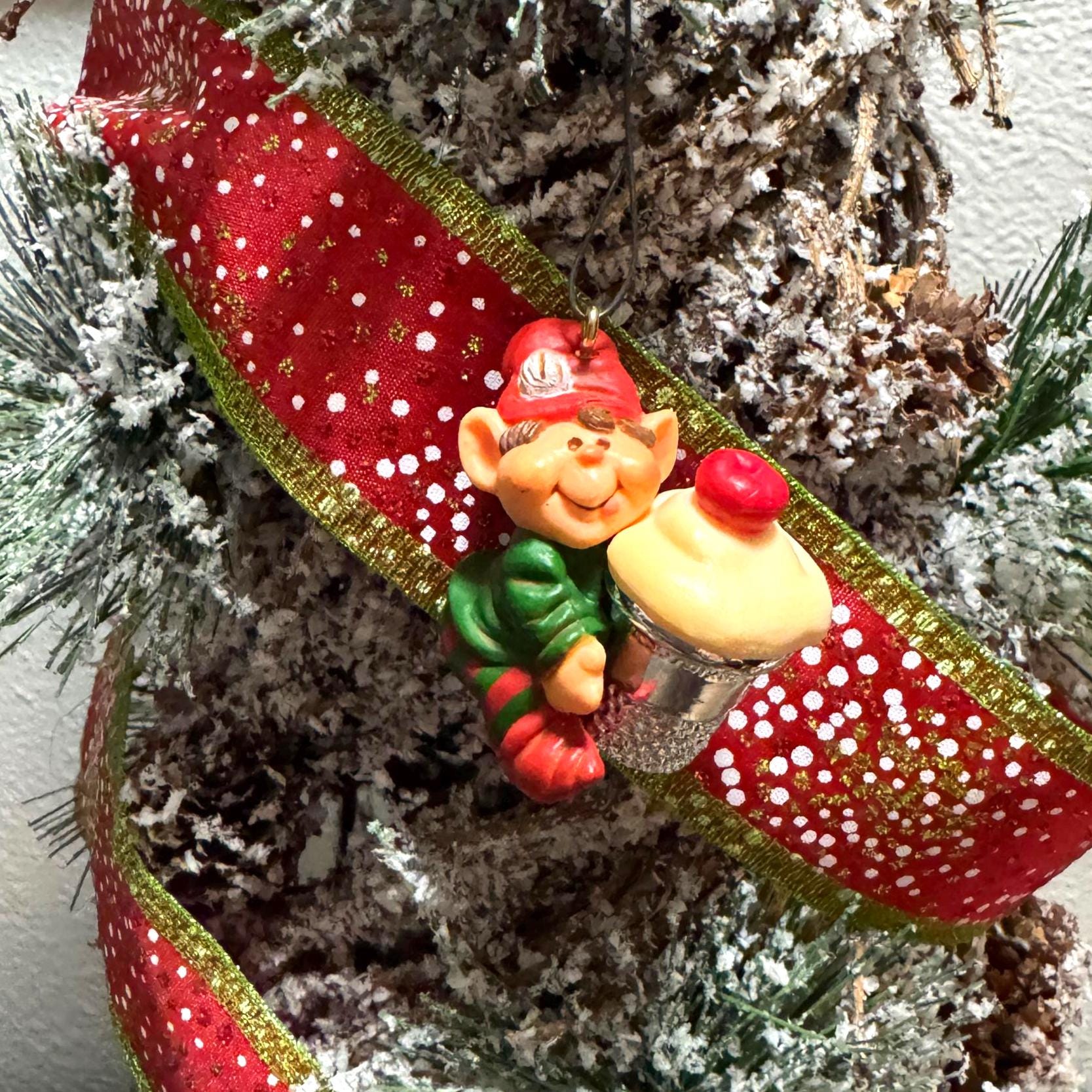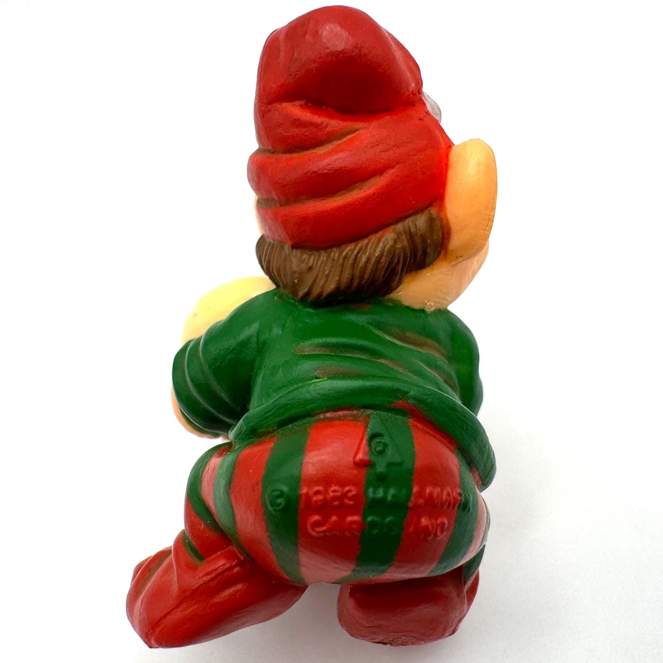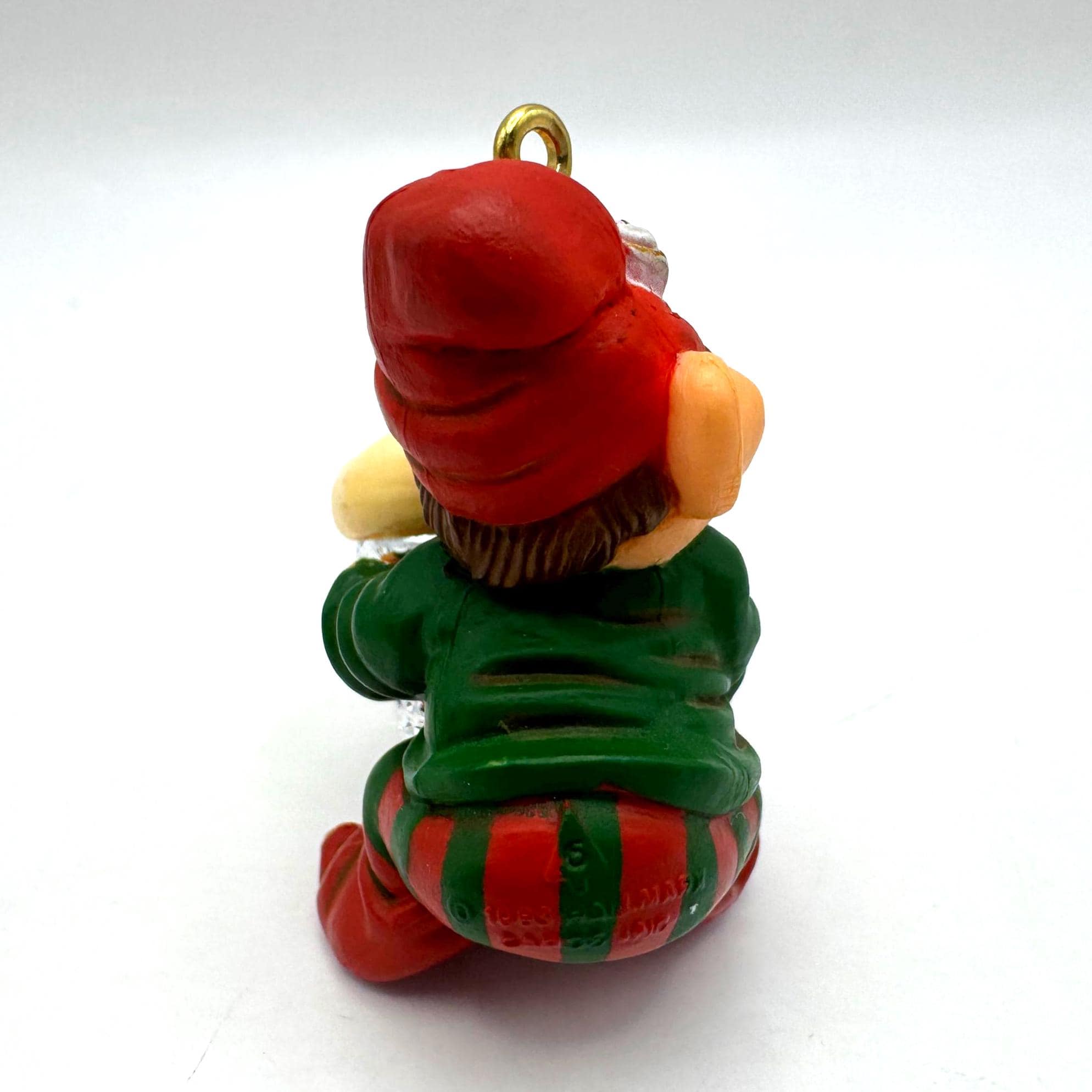 Add a dose of whimsical charm to your holiday décor with this vintage 1983 Hallmark Cards elf ornament. This cheerful little elf is all bundled up in red-and-green stripes and proudly carrying a cupcake tucked inside a silver sewing thimble — a playful nod to crafting and baking that makes this piece extra unique.