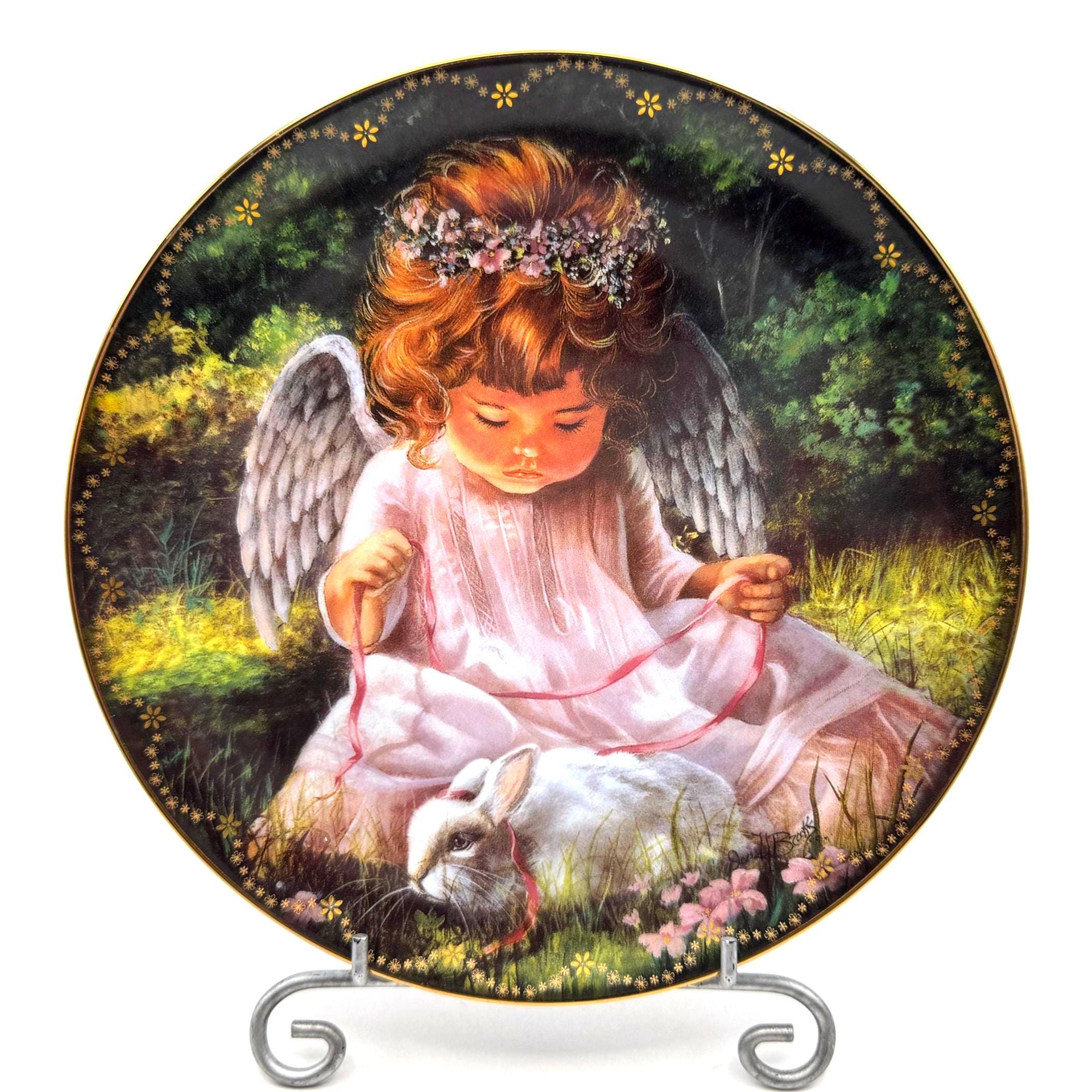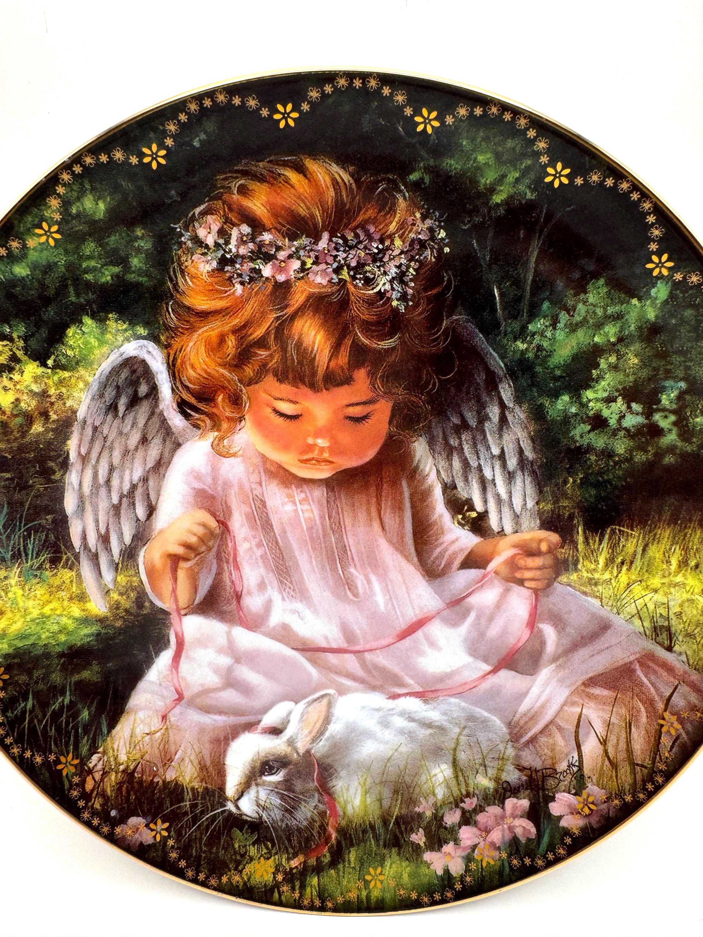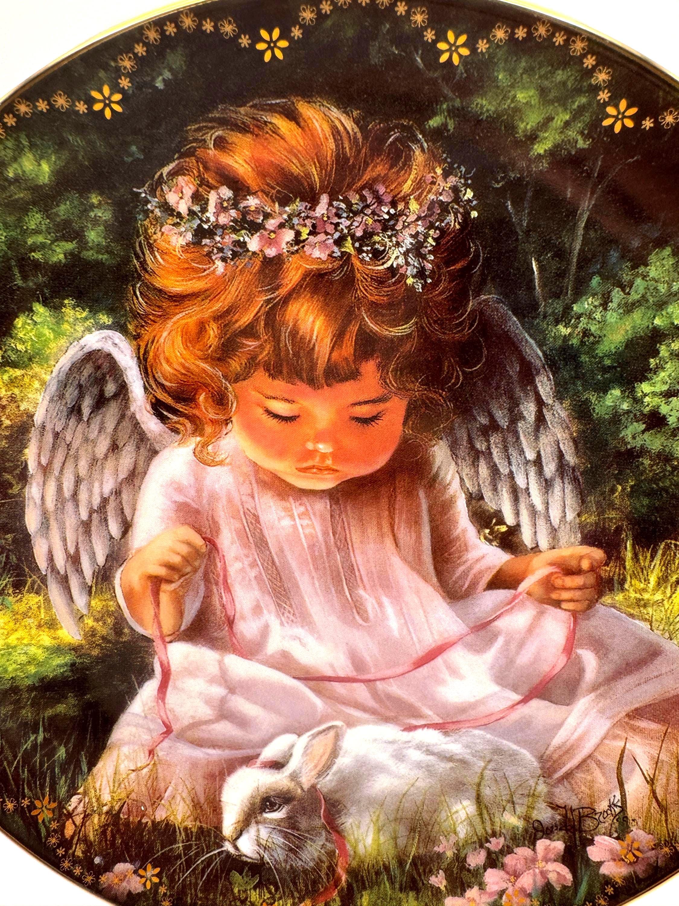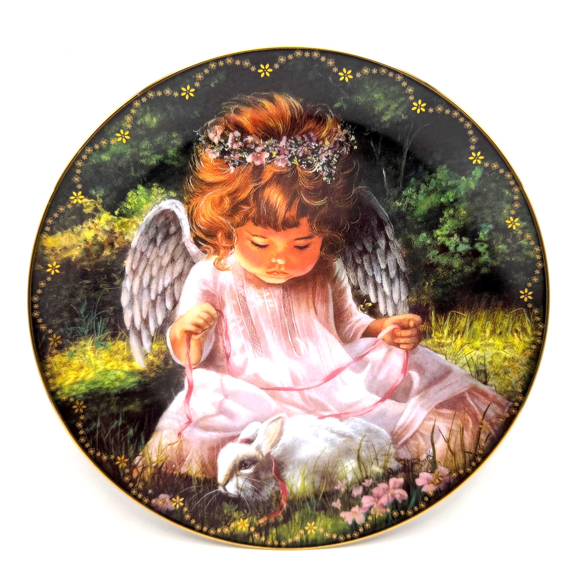 Add a sweet, peaceful touch to your décor with this 1996 Donna Brooks collector plate, titled “An Angel’s Kindness.” This beautiful porcelain plate features a gentle young angel in a soft pink gown, sitting in a meadow with a white bunny nestled beside her. With delicate wings, floral crown, and warm light tones, it makes a charming display piece for any room.