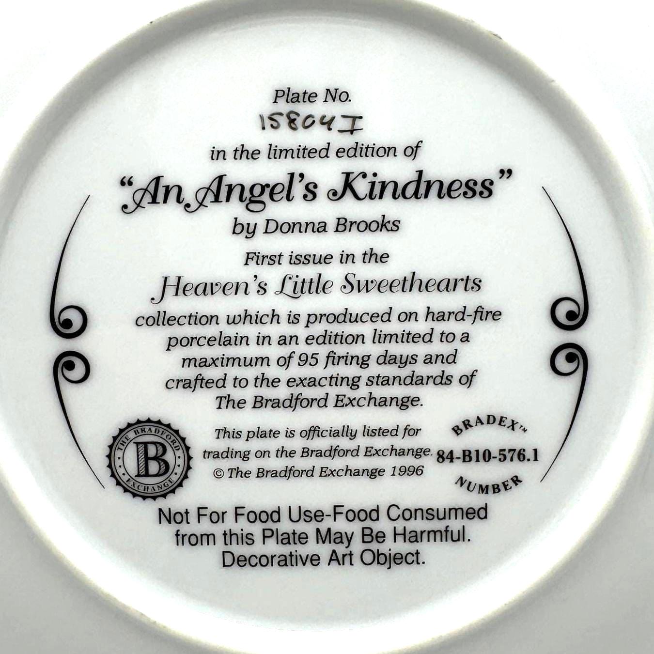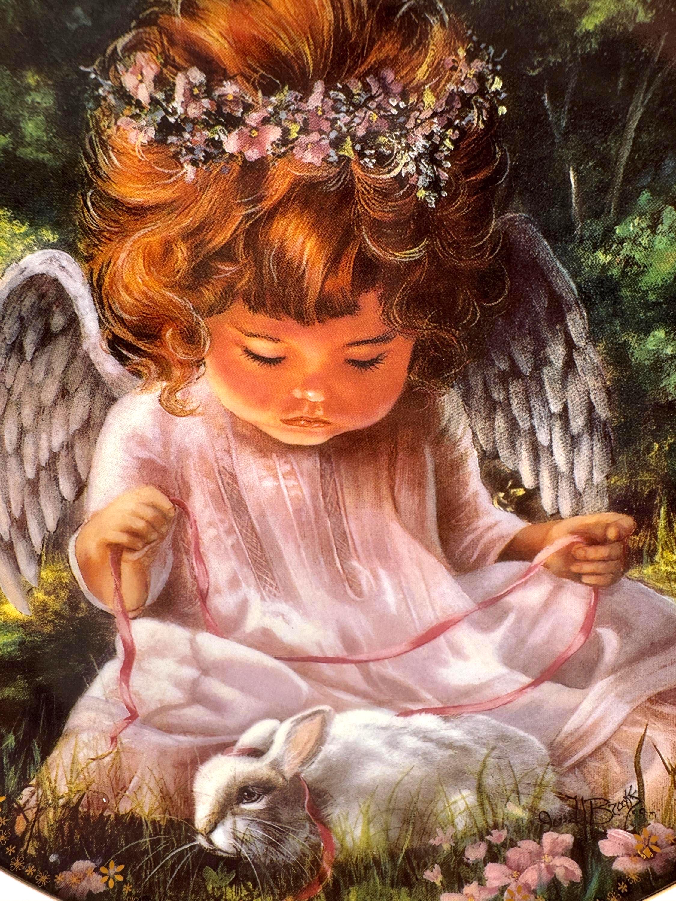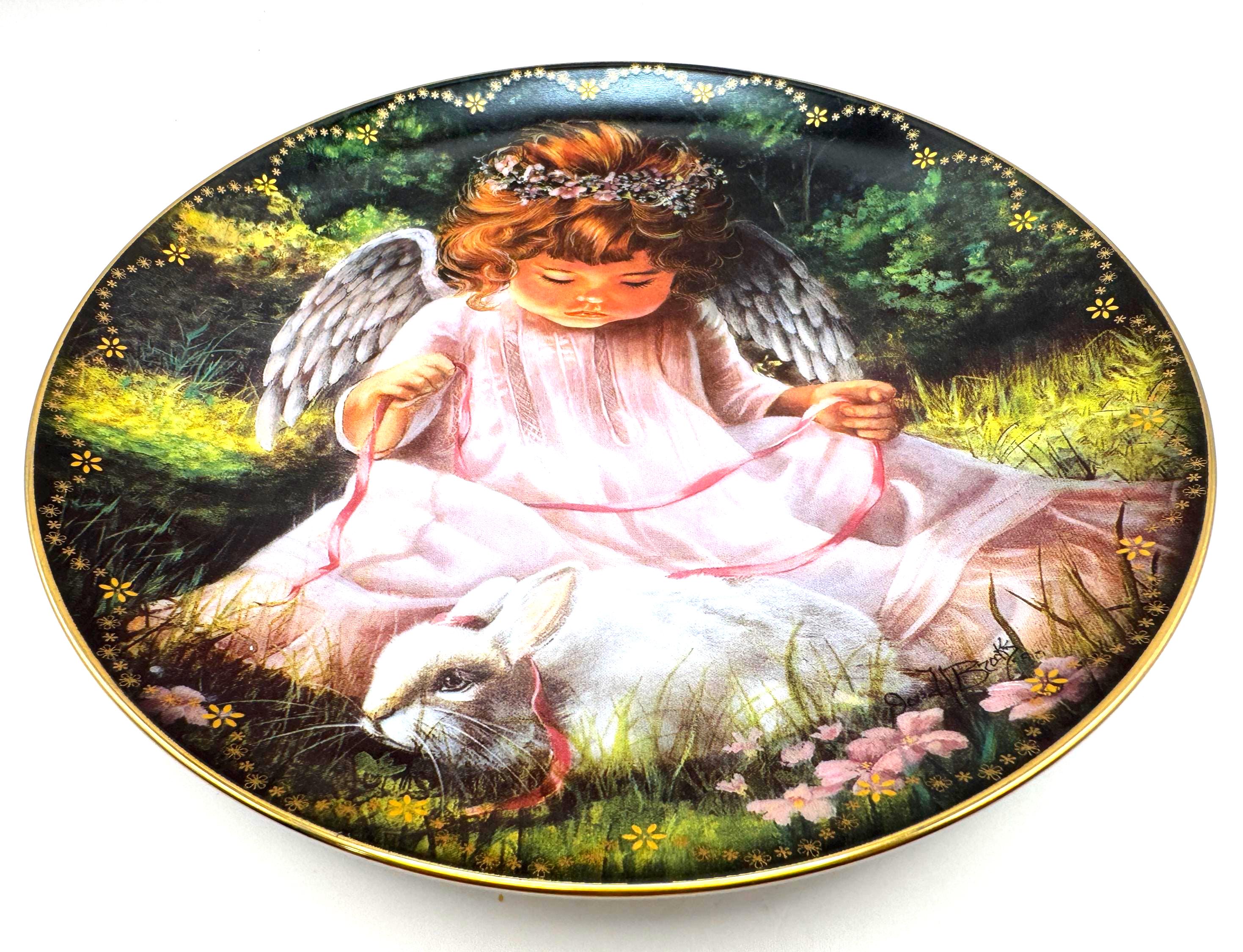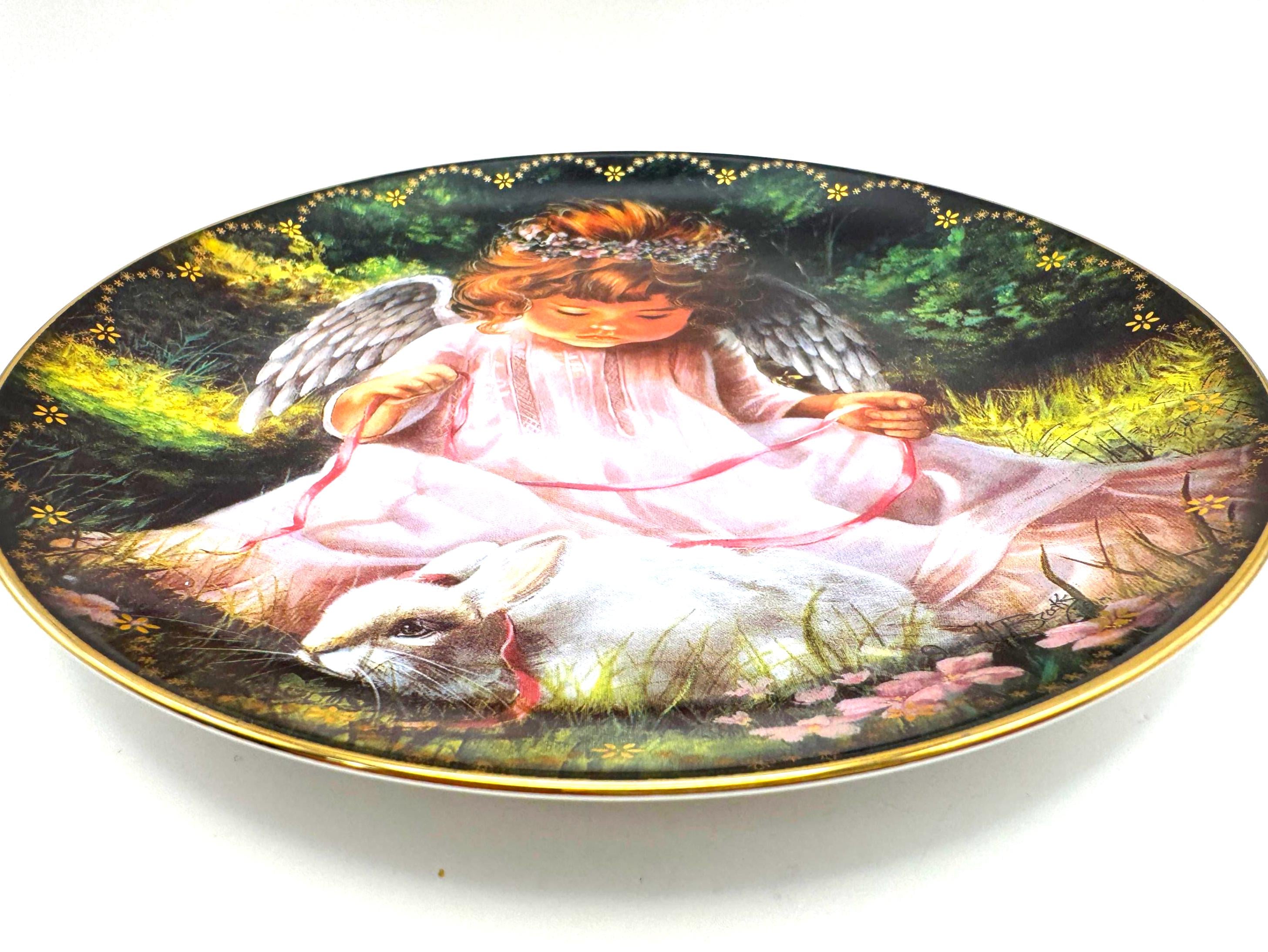 Add a sweet, peaceful touch to your décor with this 1996 Donna Brooks collector plate, titled “An Angel’s Kindness.” This beautiful porcelain plate features a gentle young angel in a soft pink gown, sitting in a meadow with a white bunny nestled beside her. With delicate wings, floral crown, and warm light tones, it makes a charming display piece for any room.
