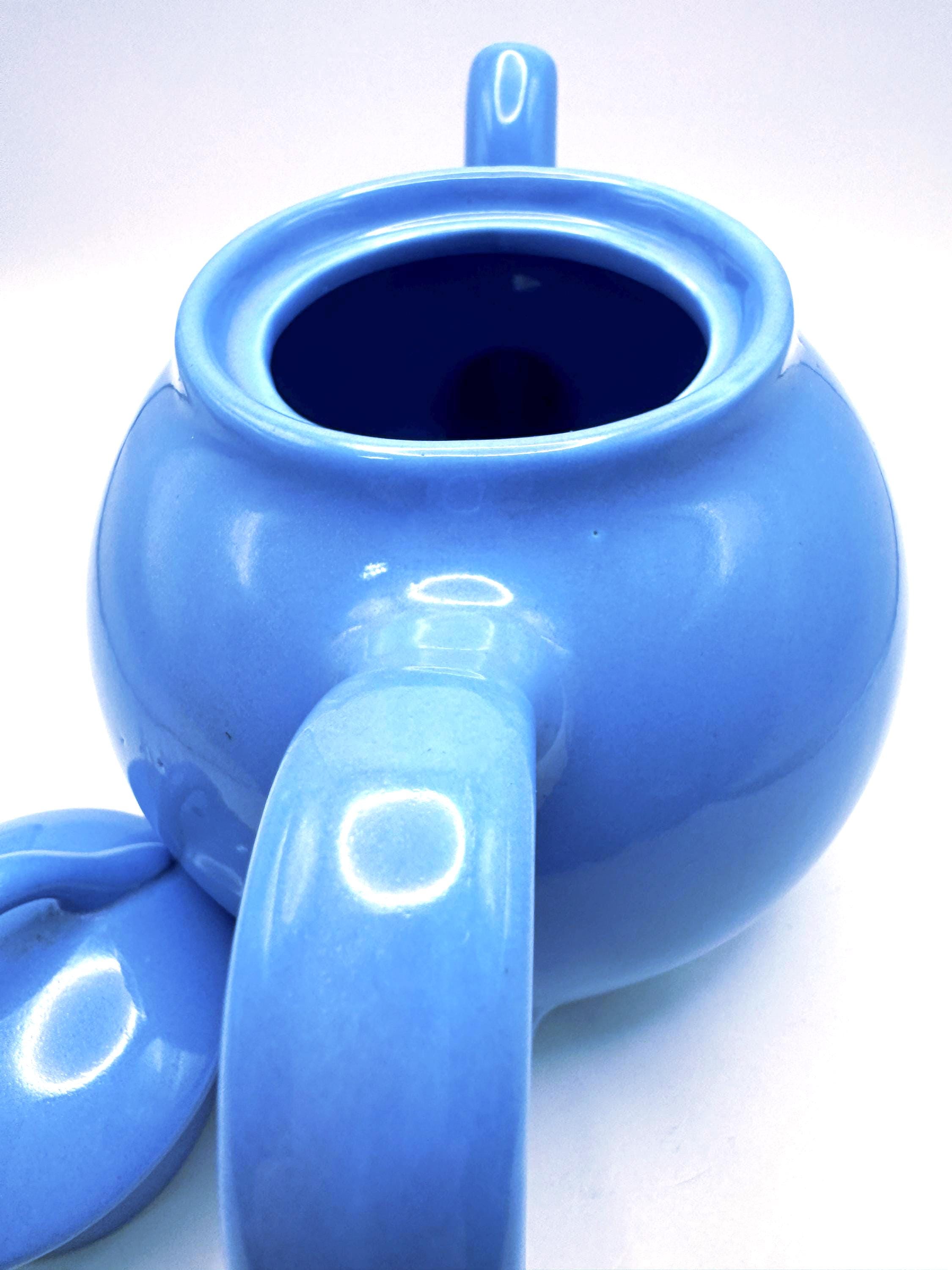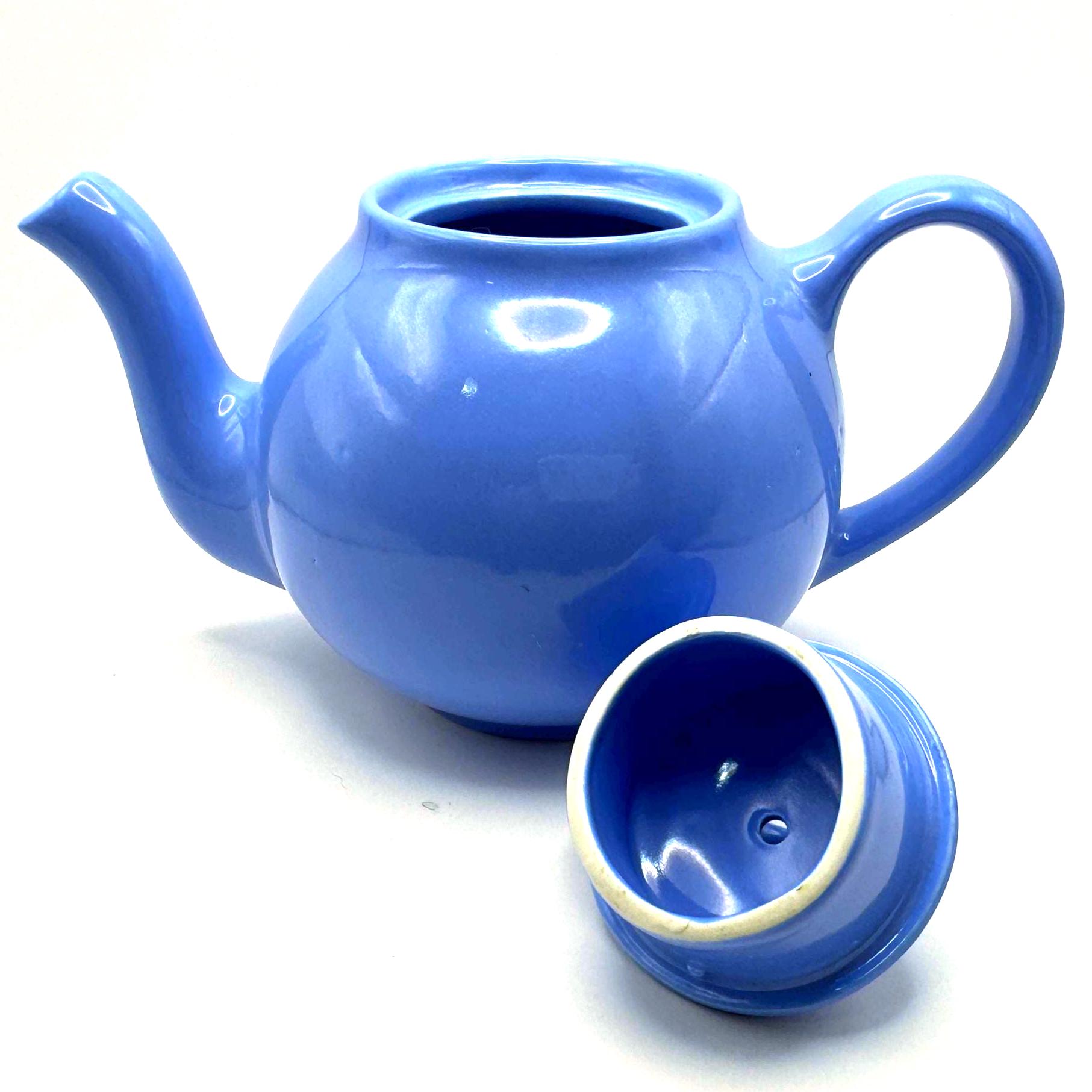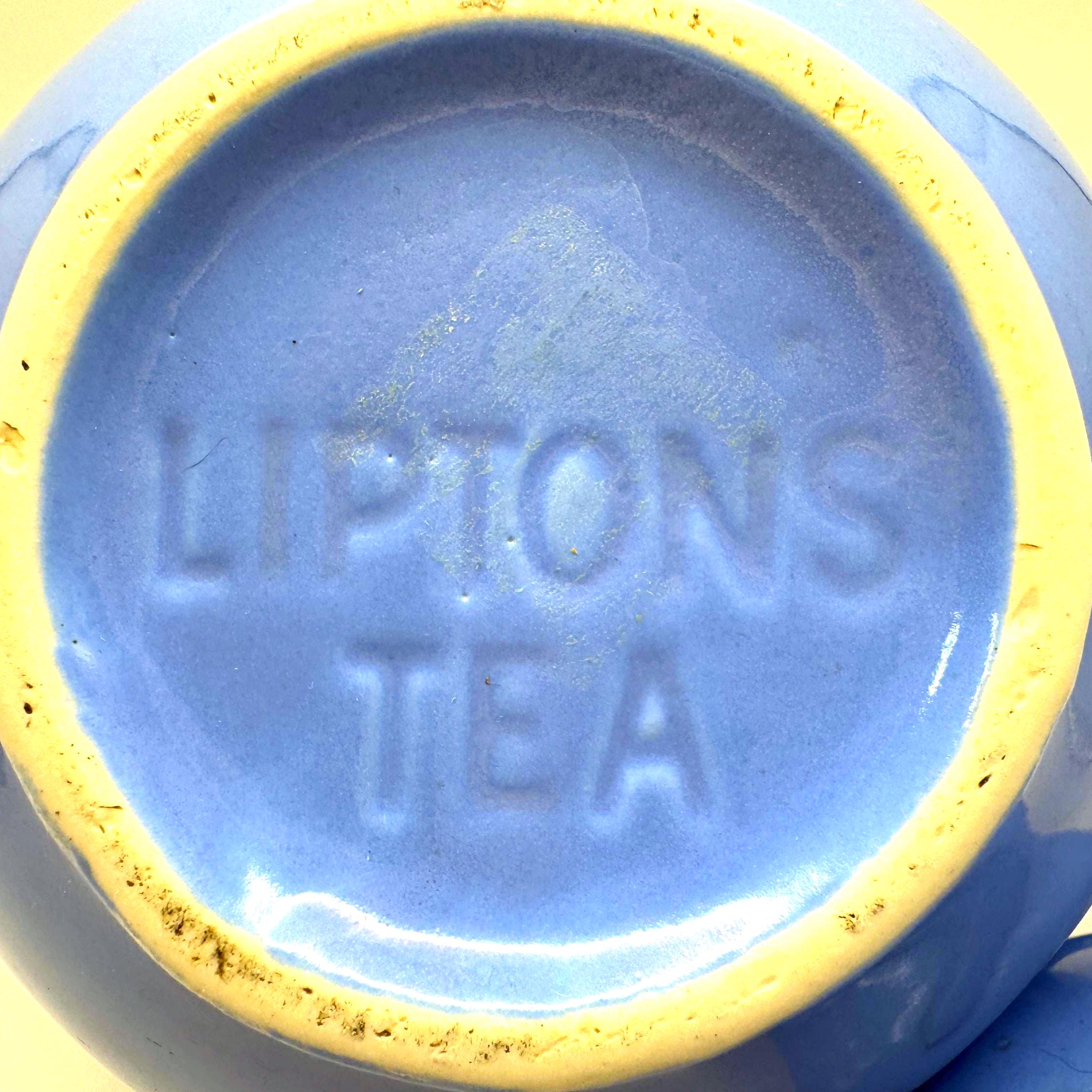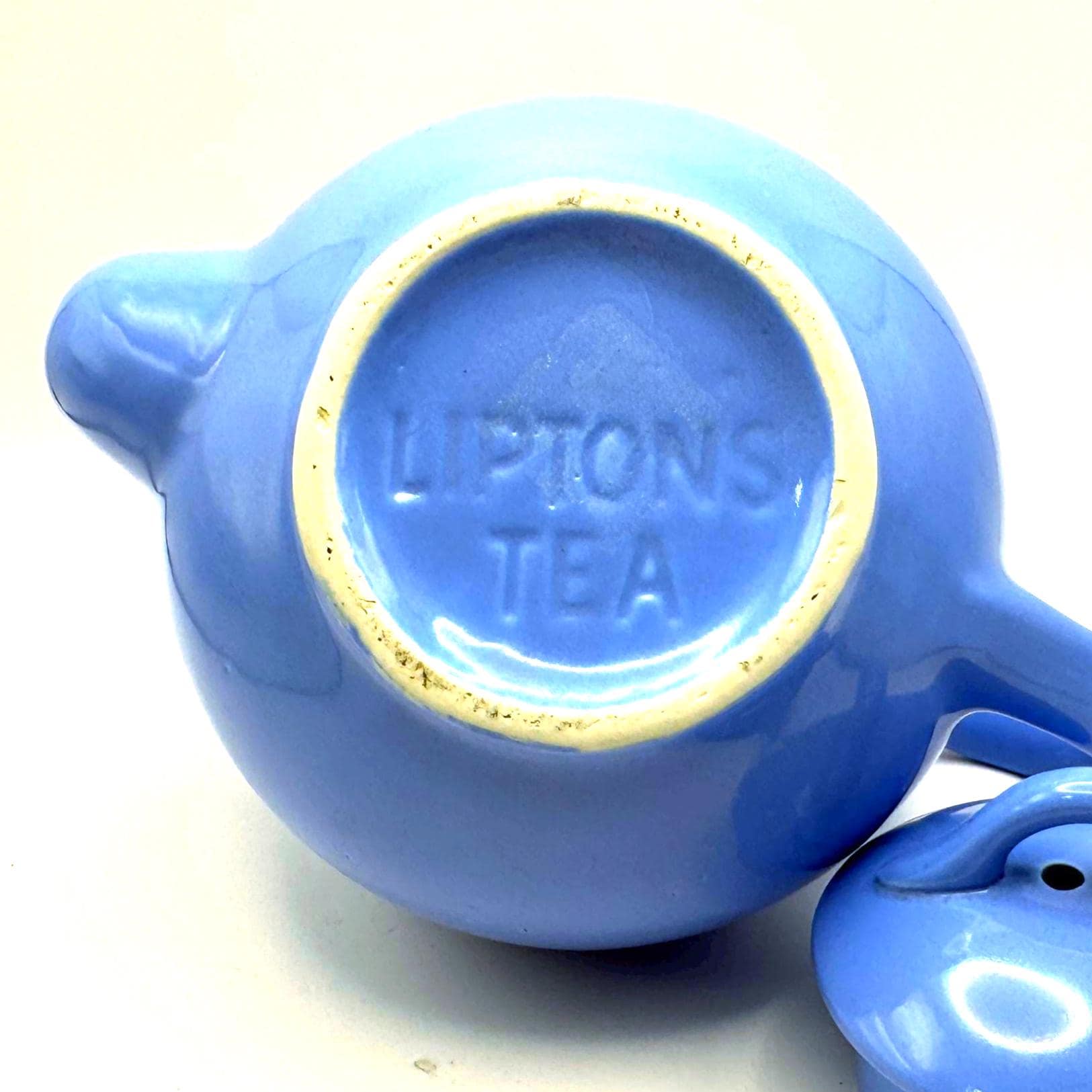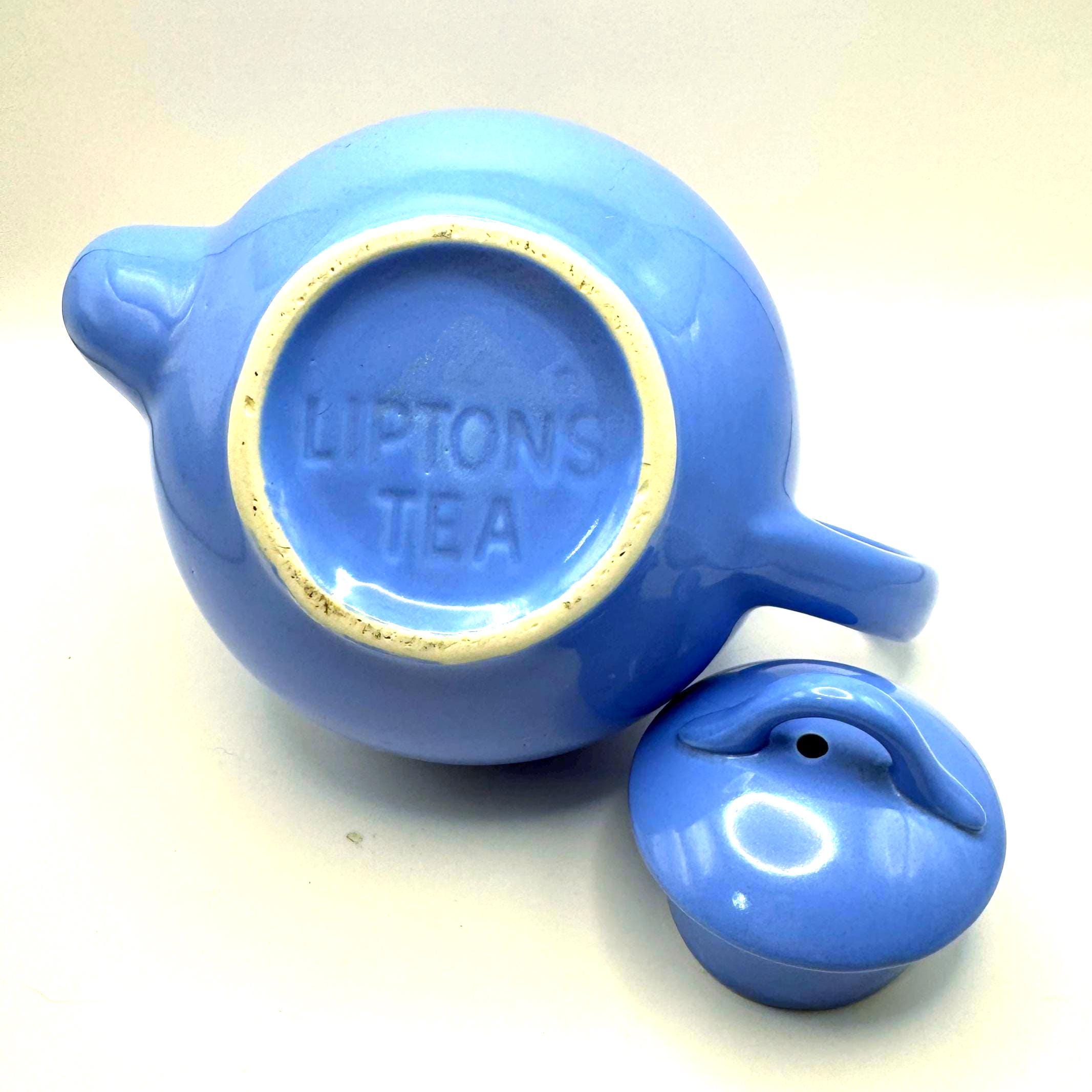 This teapot features the cornflower blue glaze, a rounded midcentury shape, and the original matching lid. The underside is molded “LIPTONS TEA”, confirming it as an authentic Lipton promotional piece.