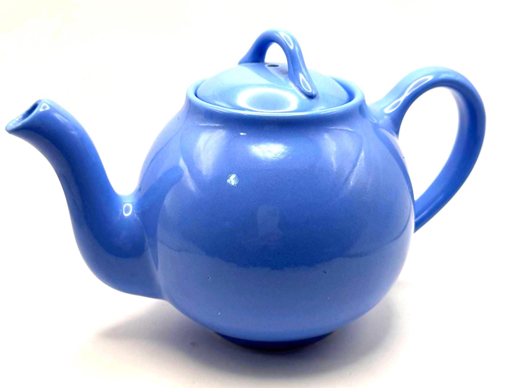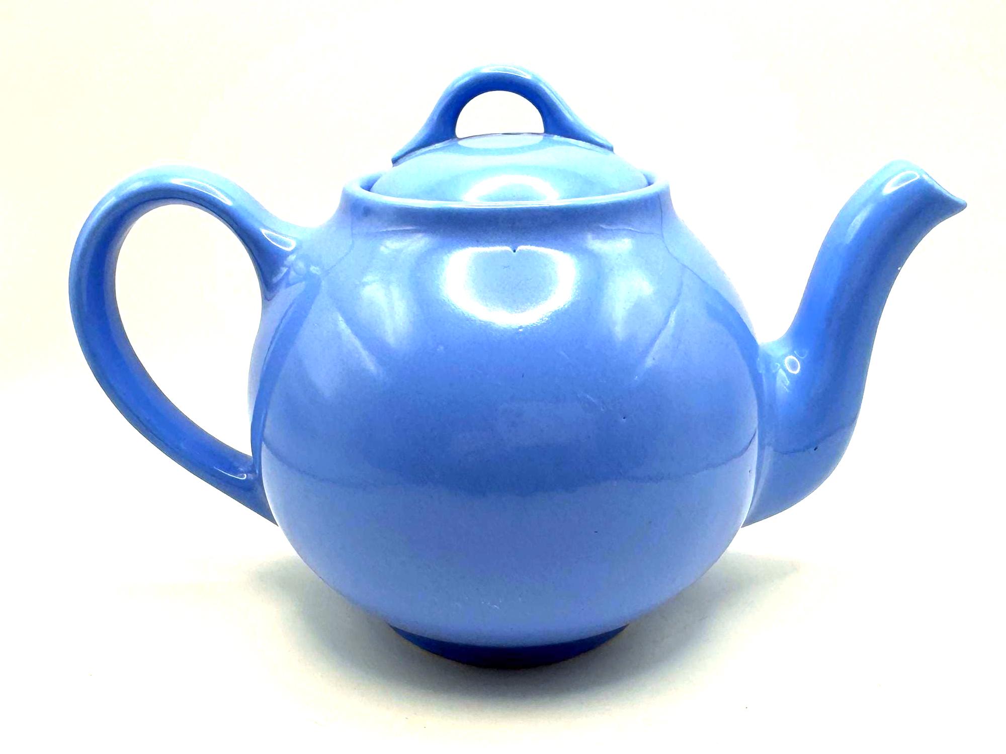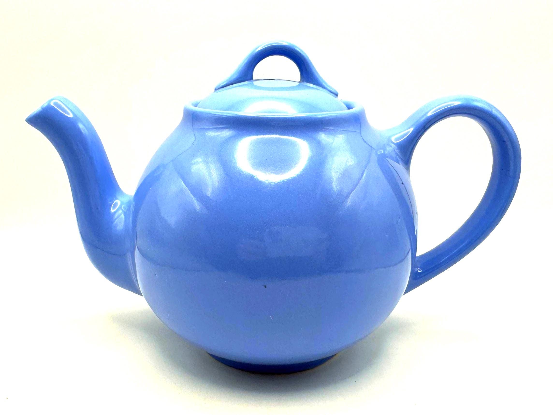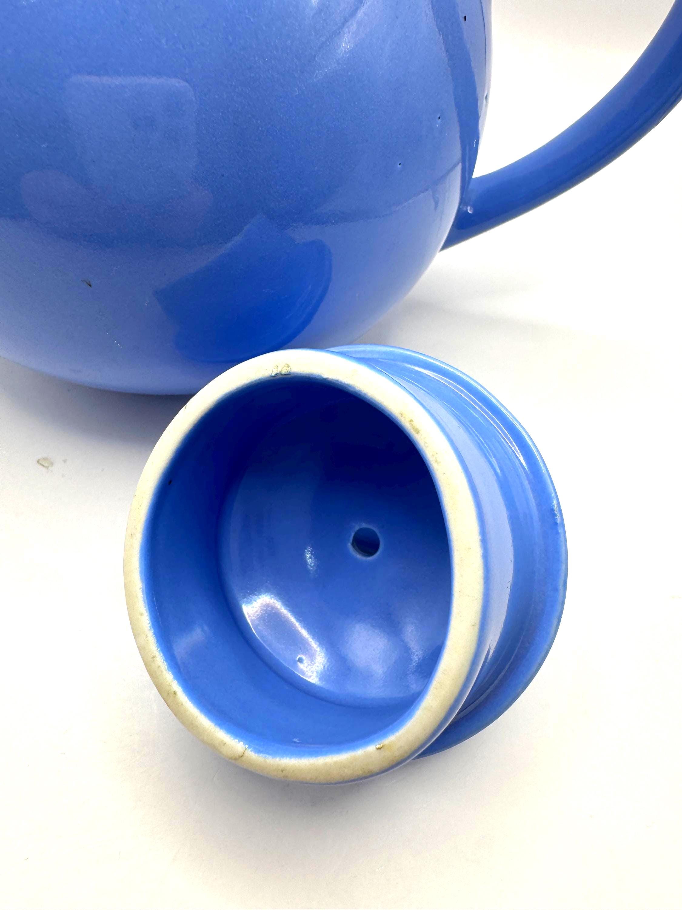This teapot features the cornflower blue glaze, a rounded midcentury shape, and the original matching lid. The underside is molded “LIPTONS TEA”, confirming it as an authentic Lipton promotional piece.