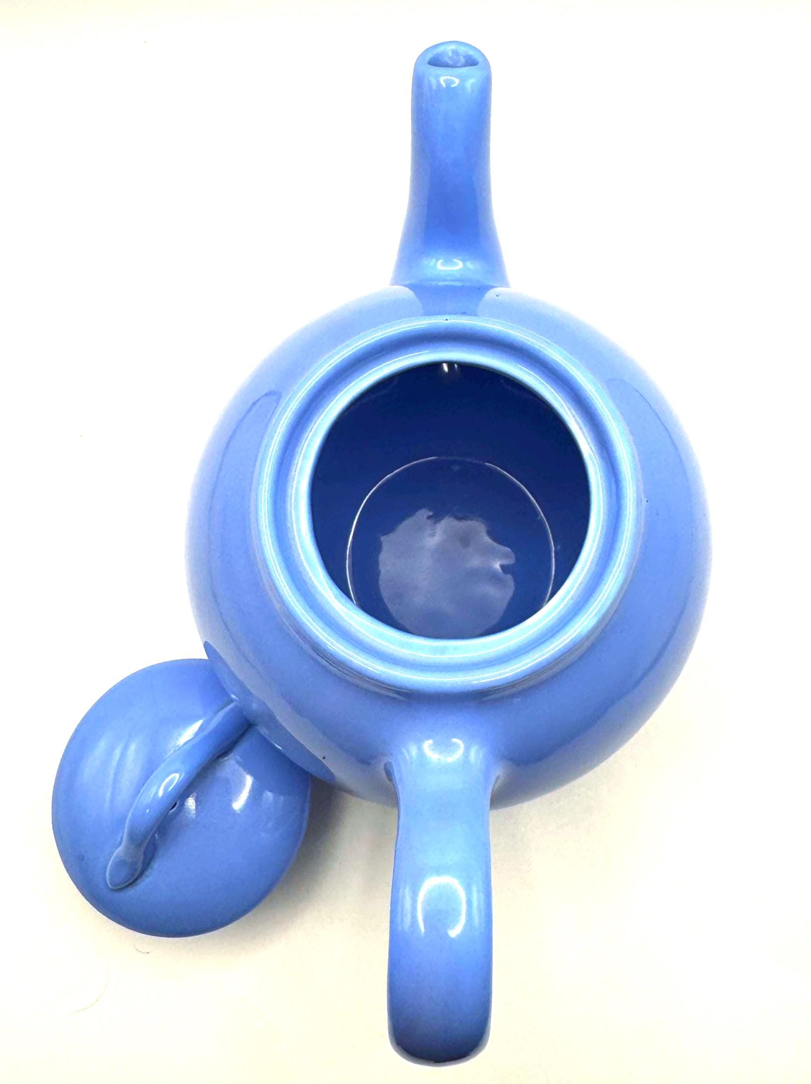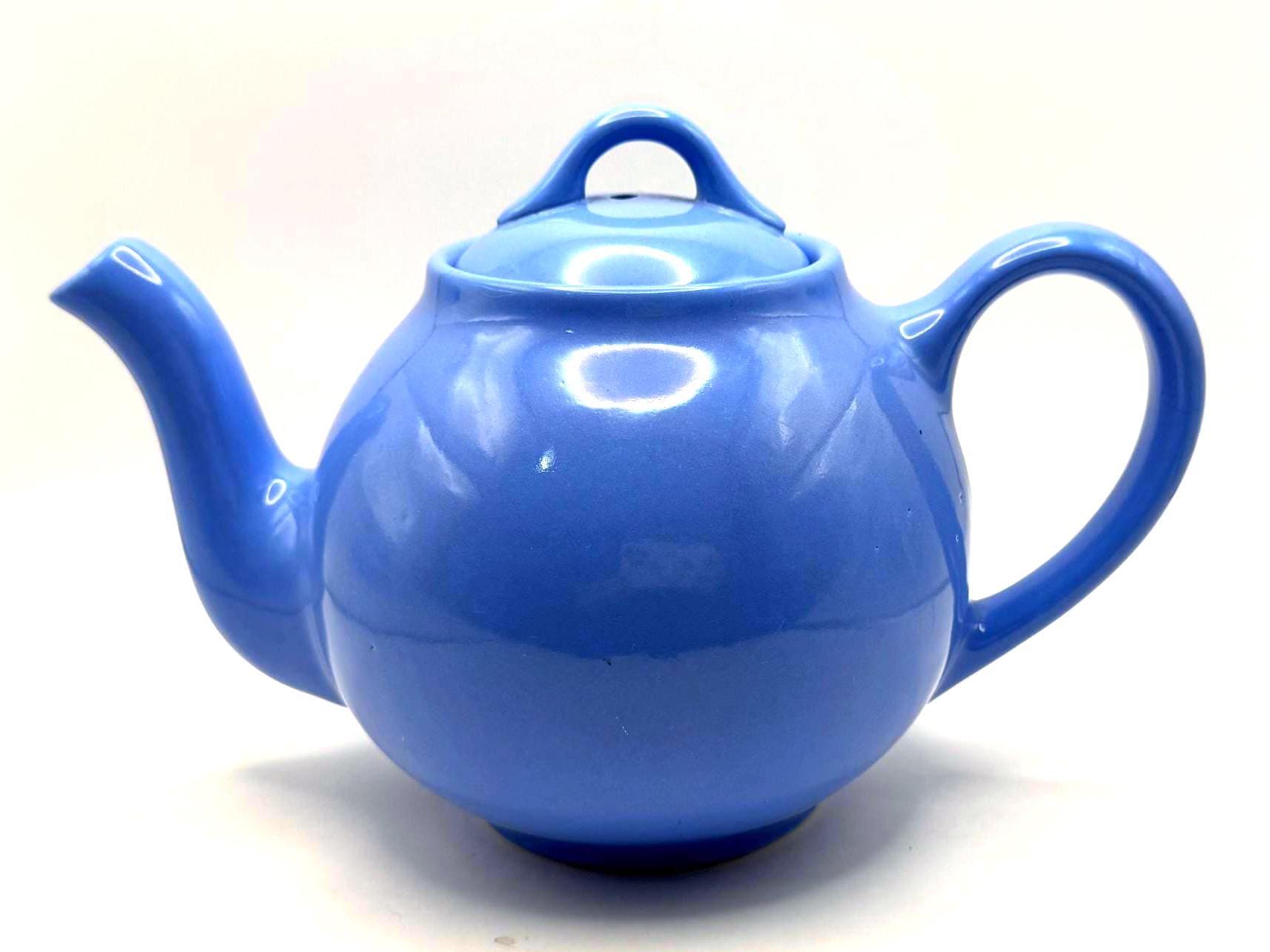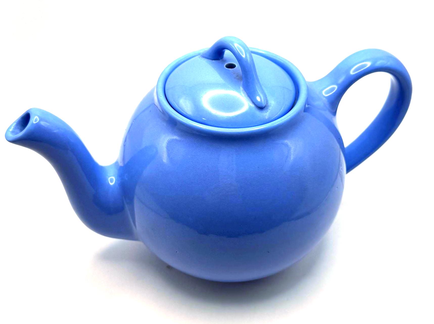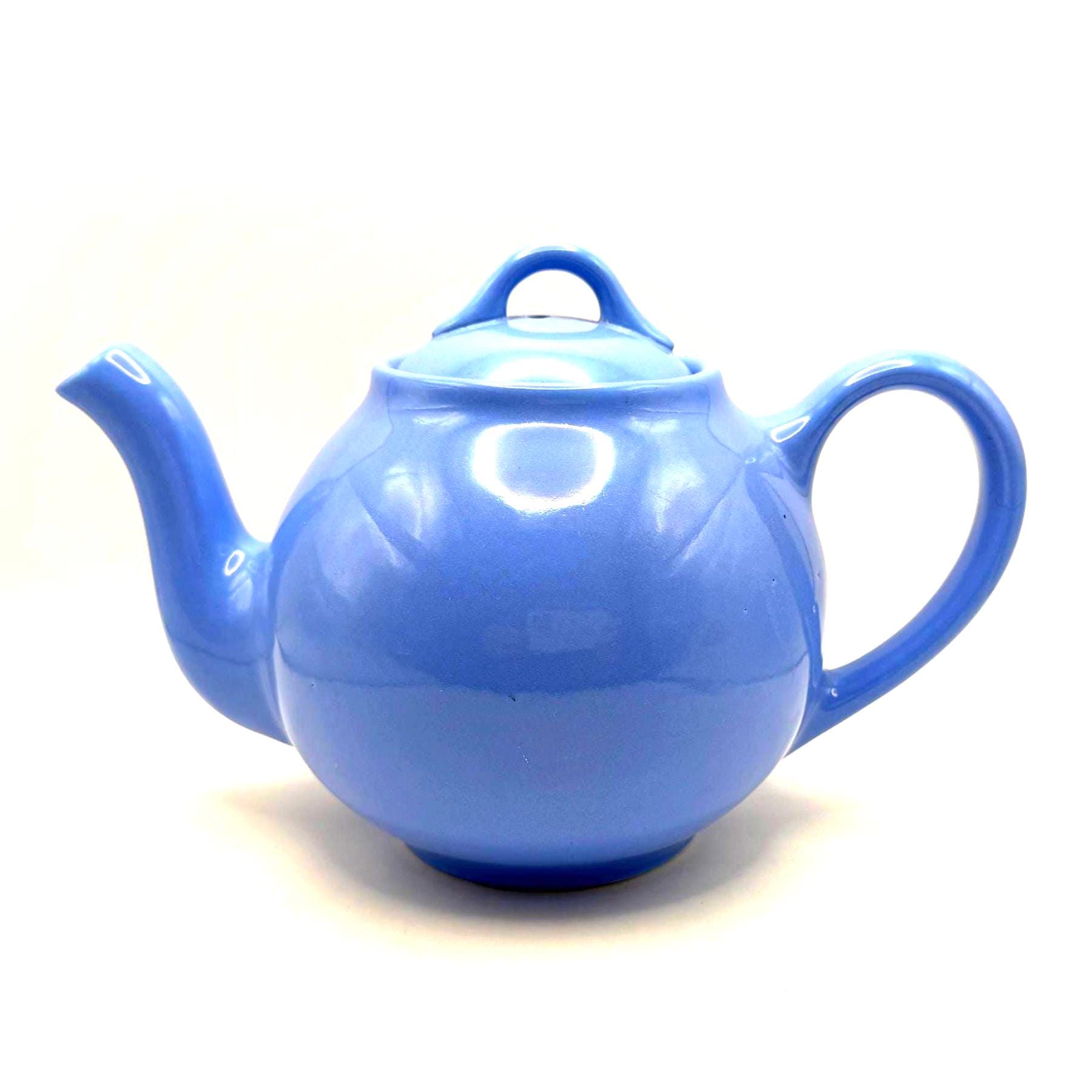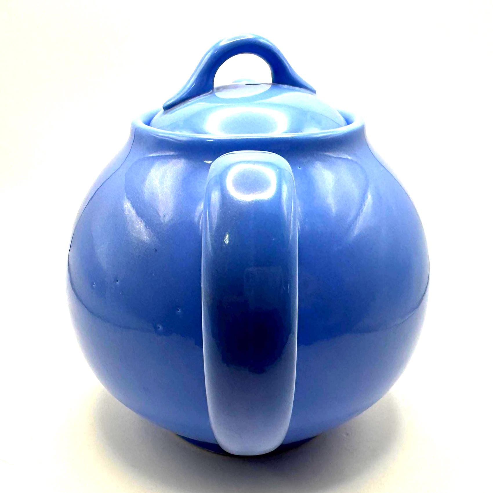 This teapot features the cornflower blue glaze, a rounded midcentury shape, and the original matching lid. The underside is molded “LIPTONS TEA”, confirming it as an authentic Lipton promotional piece.