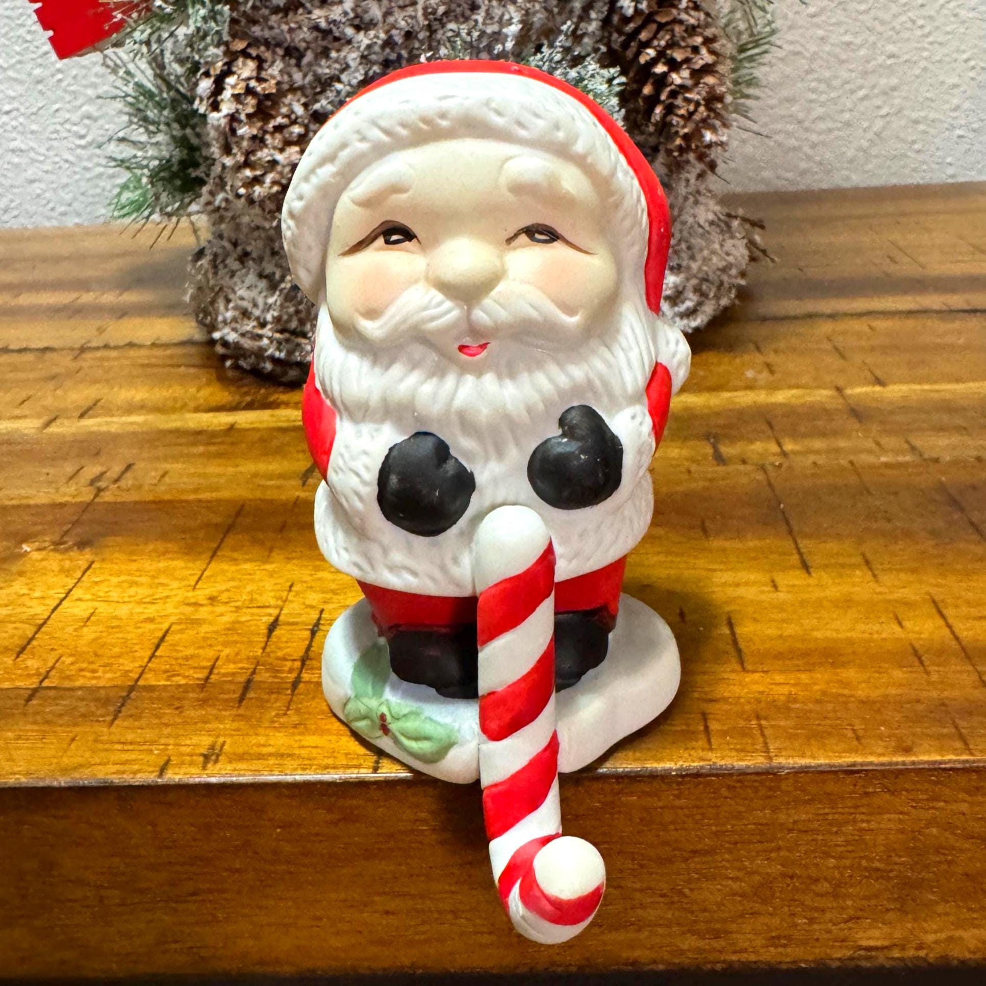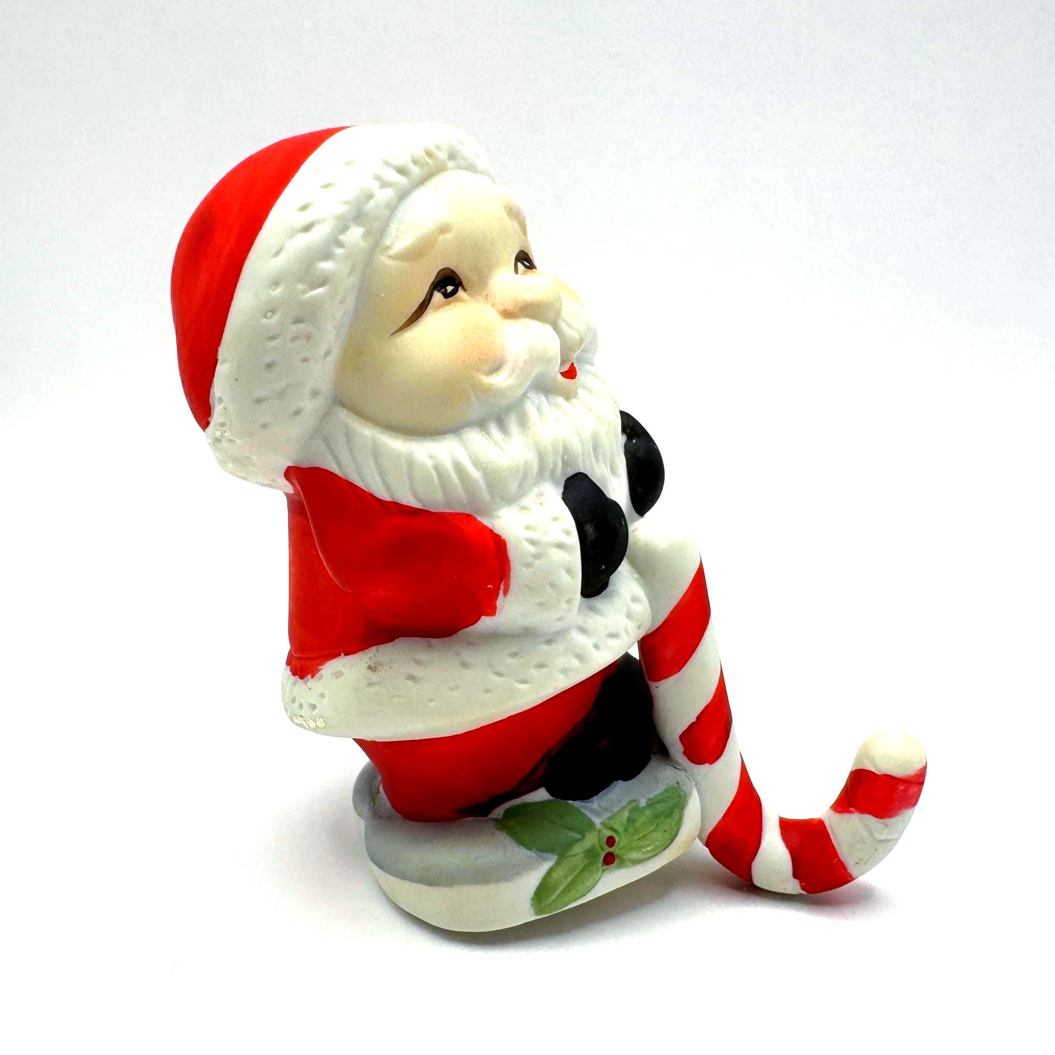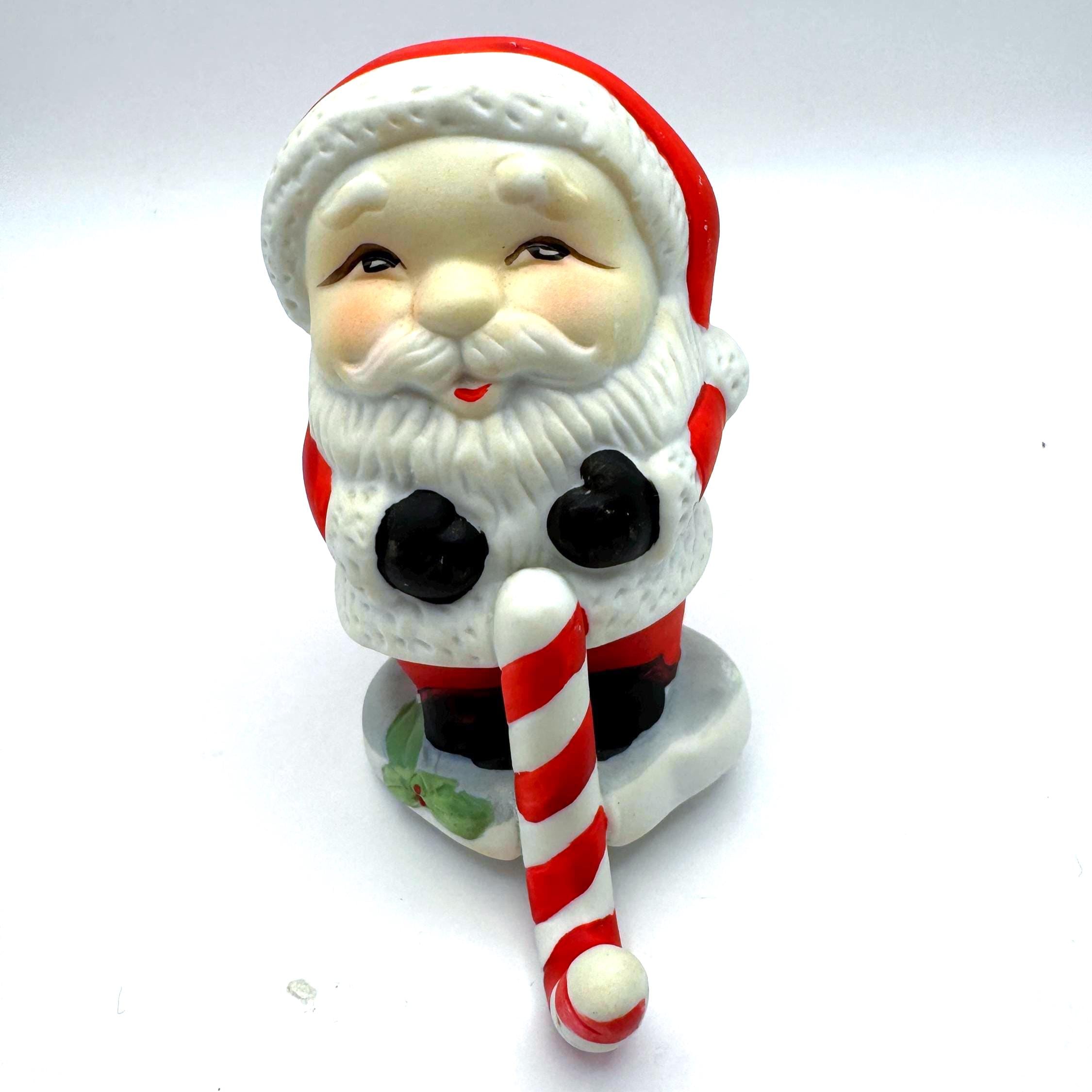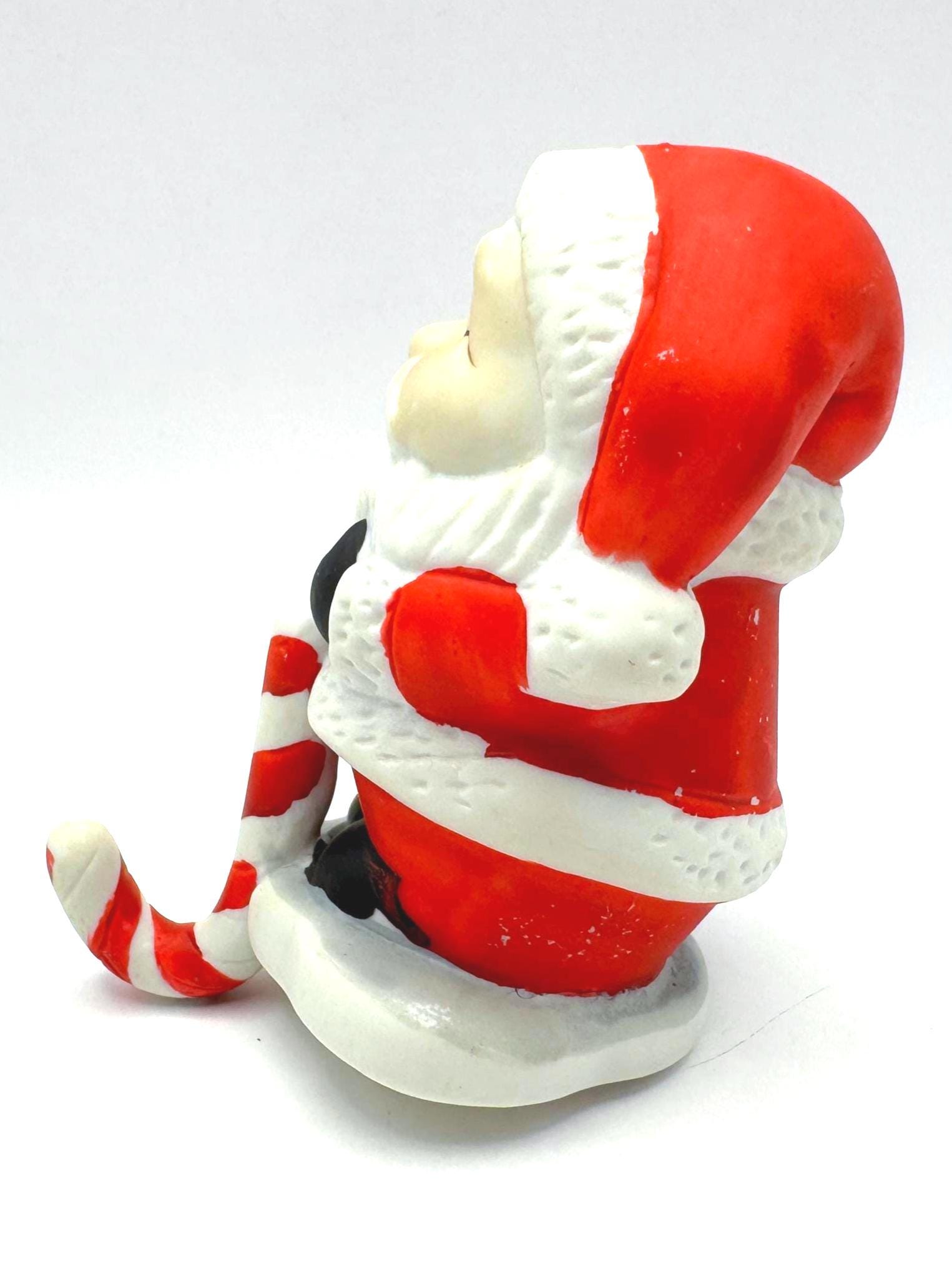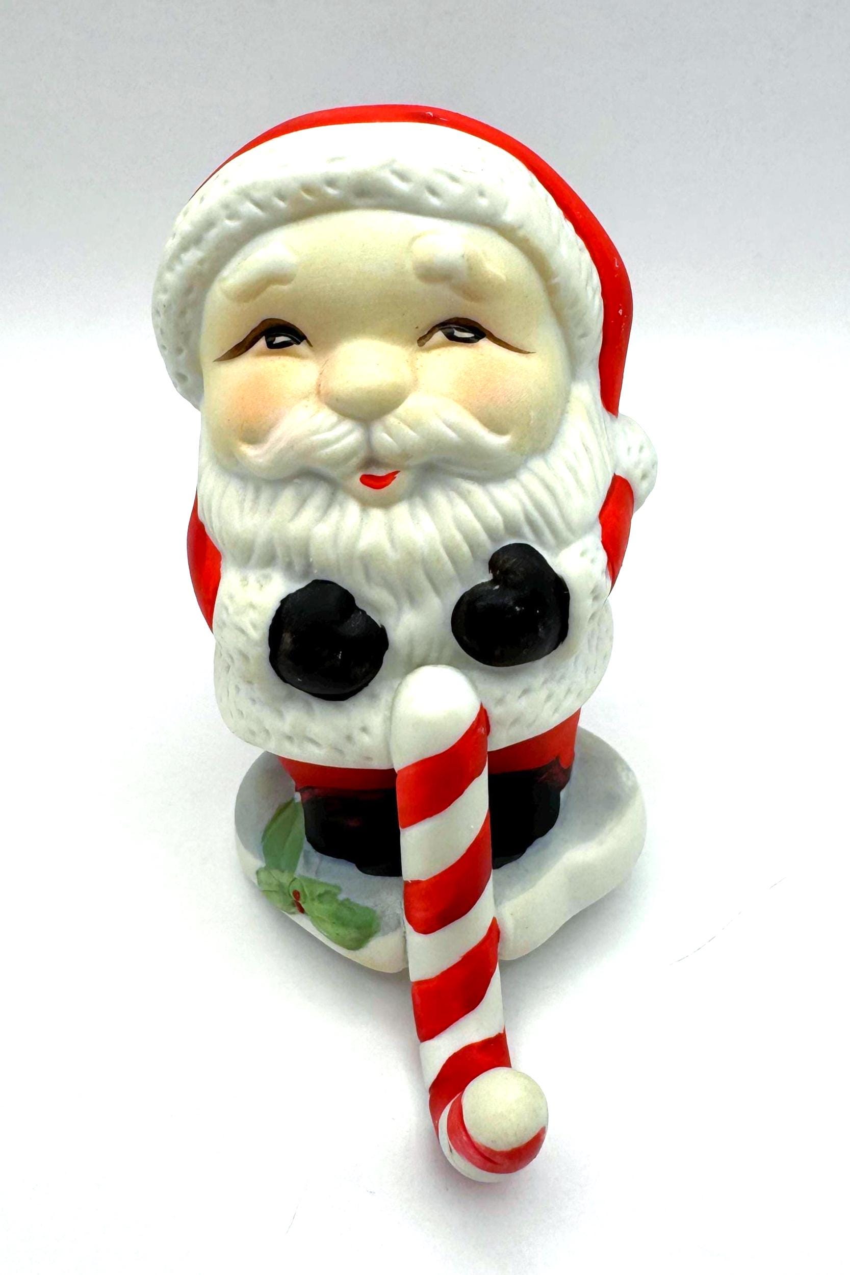 This cheerful Santa is designed to sit perfectly on the edge of a shelf, mantle, or tiered tray, with his long candy-cane “leg” hanging over the side. His sweet, shy little expression and hand-painted details give him tons of personality.