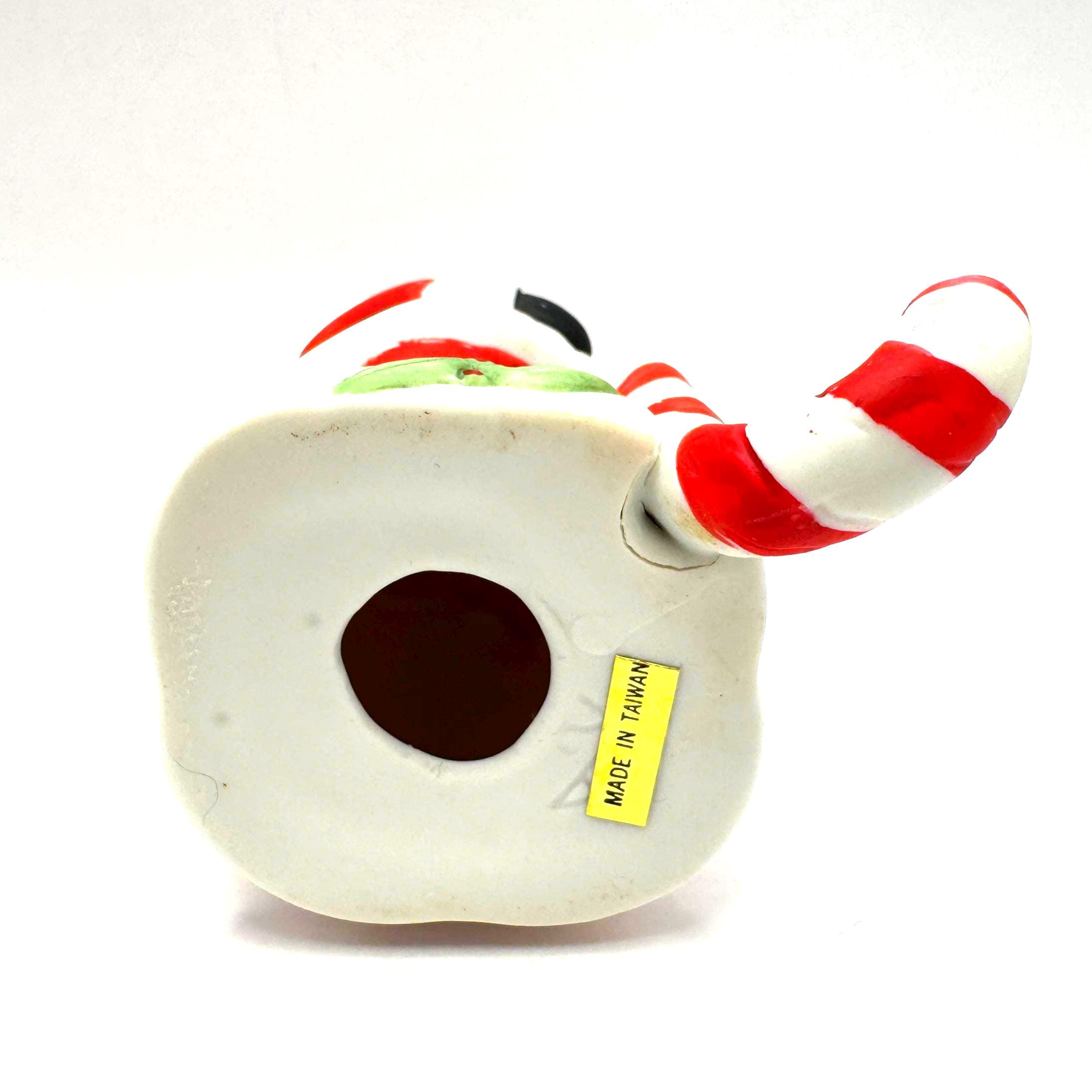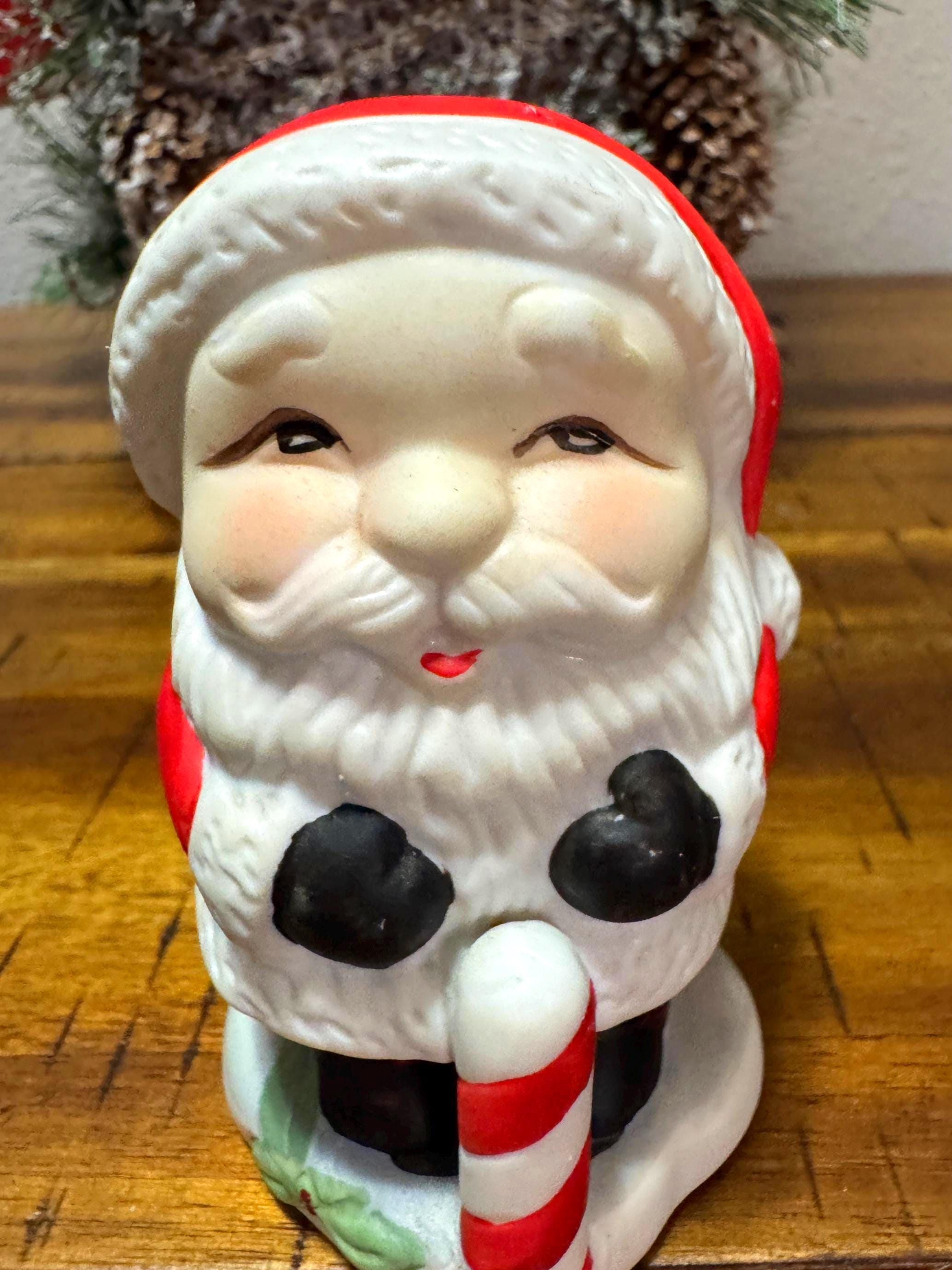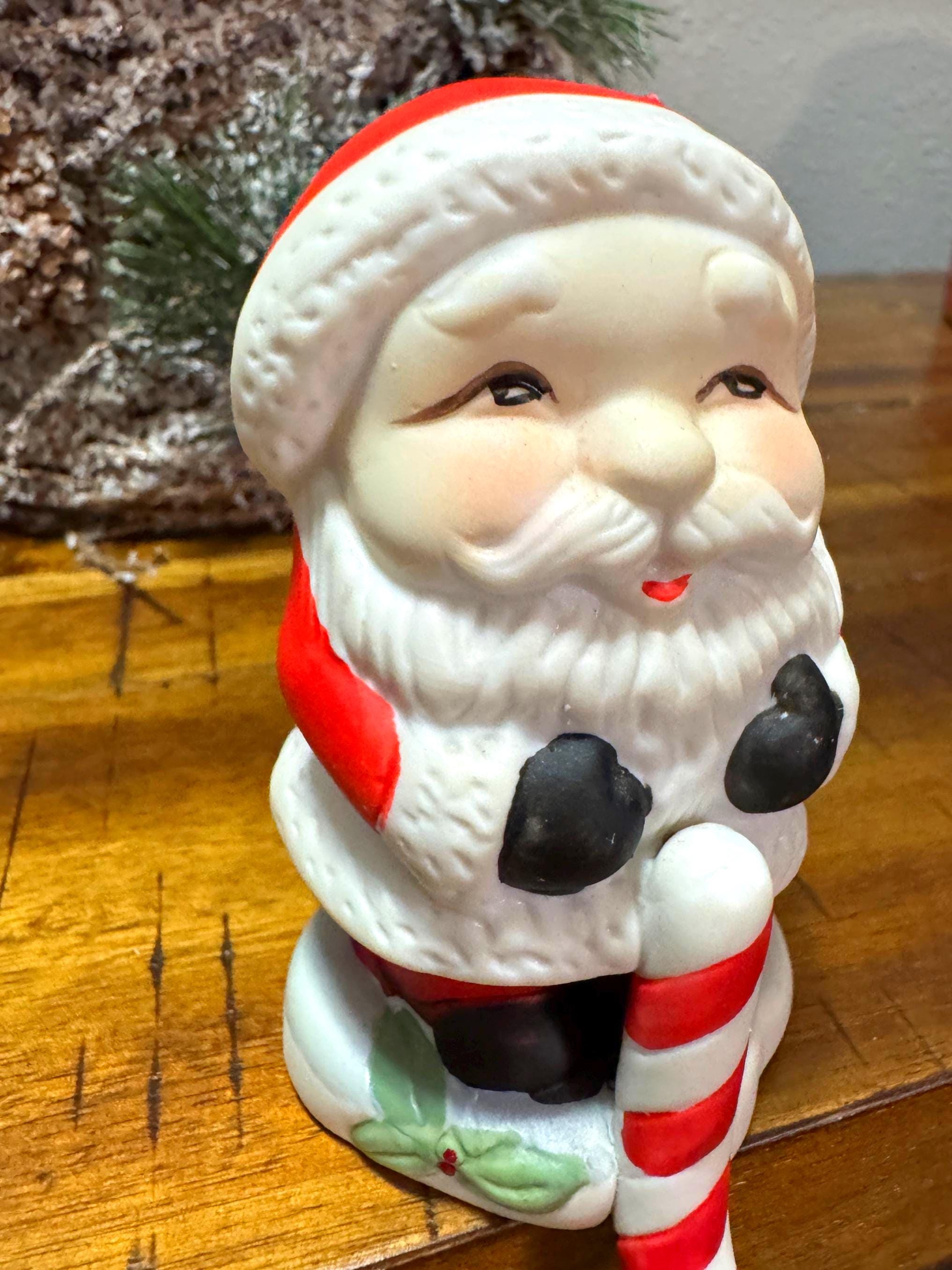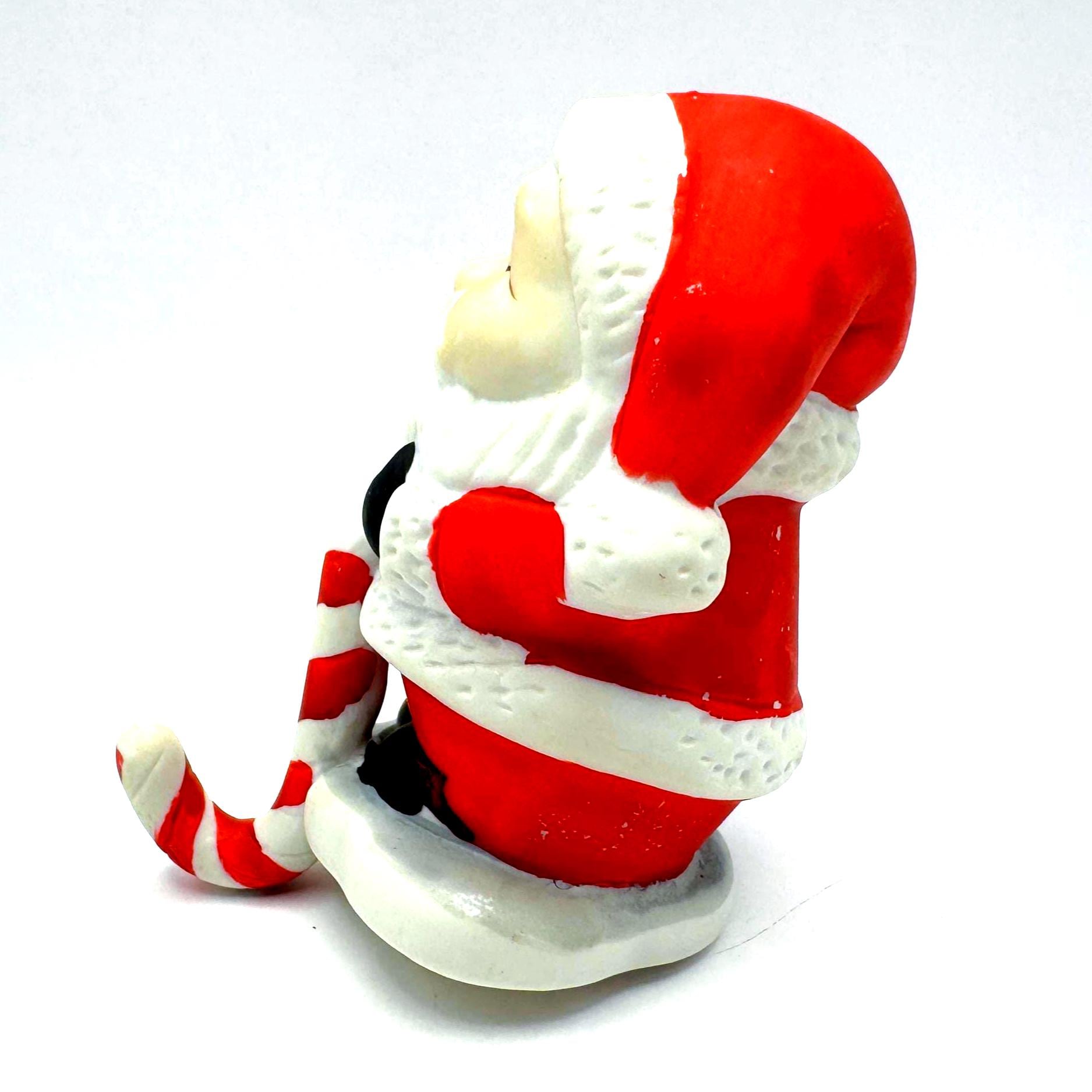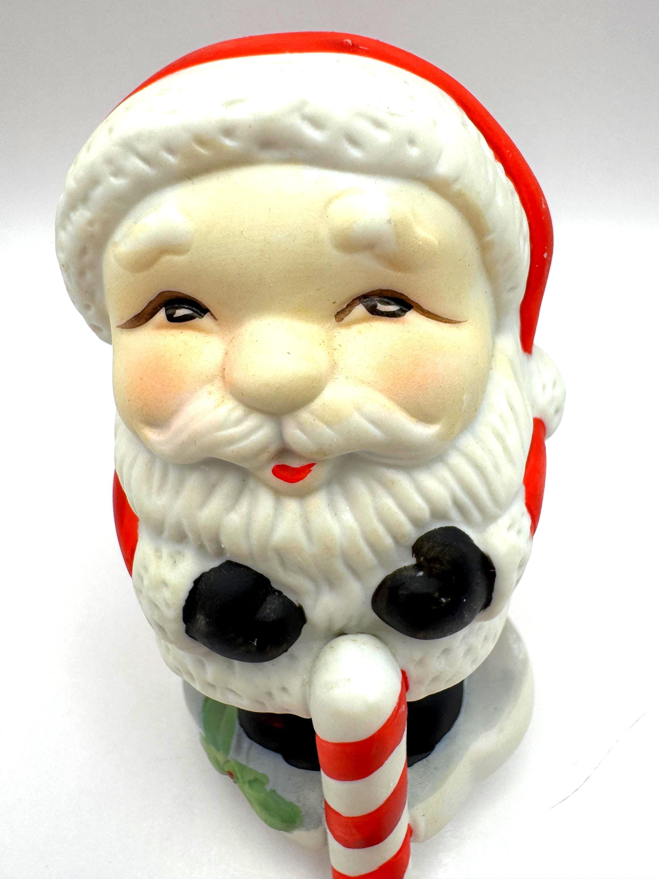 This cheerful Santa is designed to sit perfectly on the edge of a shelf, mantle, or tiered tray, with his long candy-cane “leg” hanging over the side. His sweet, shy little expression and hand-painted details give him tons of personality.