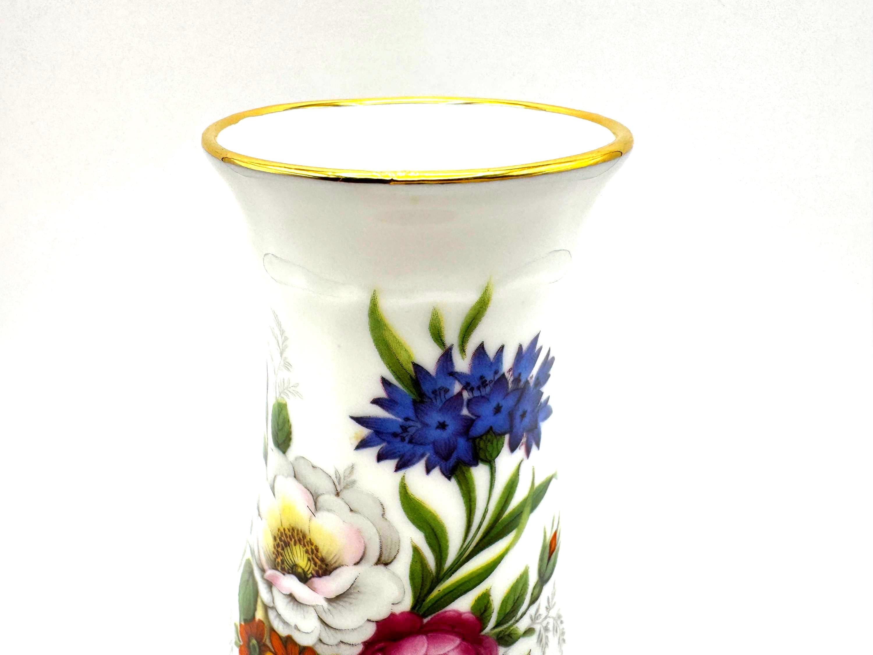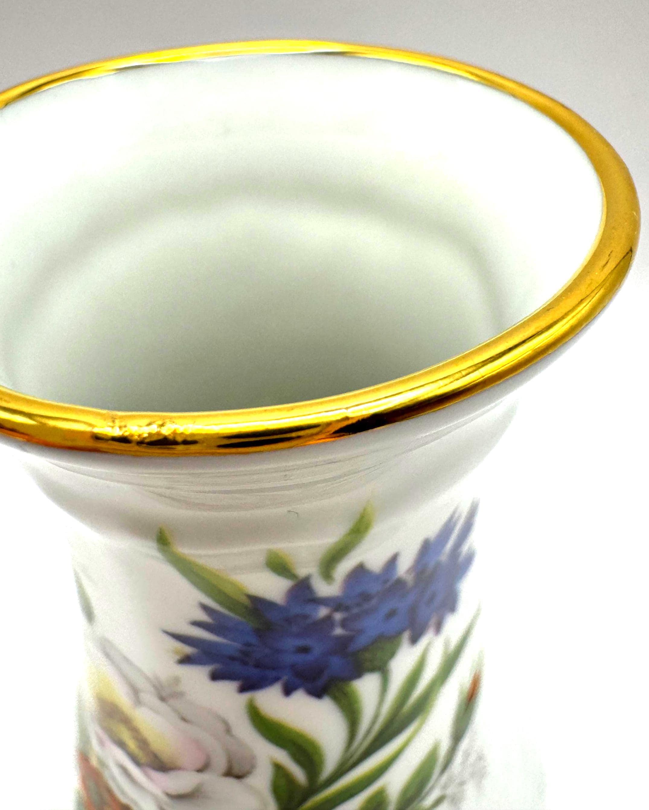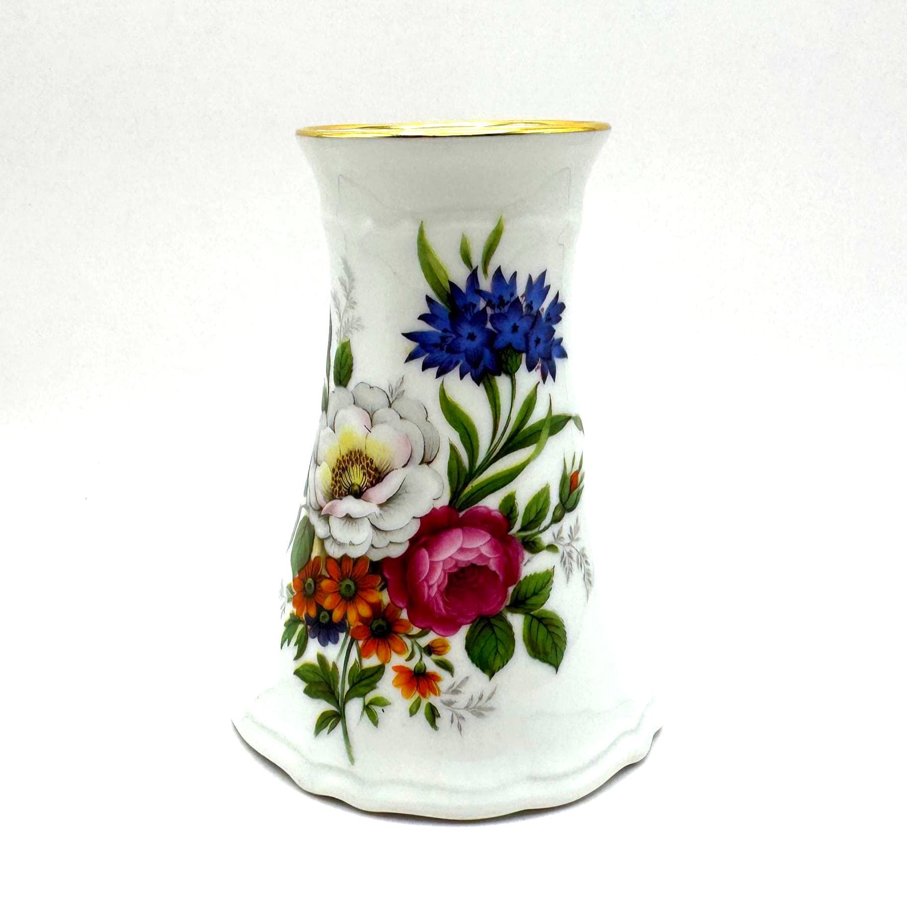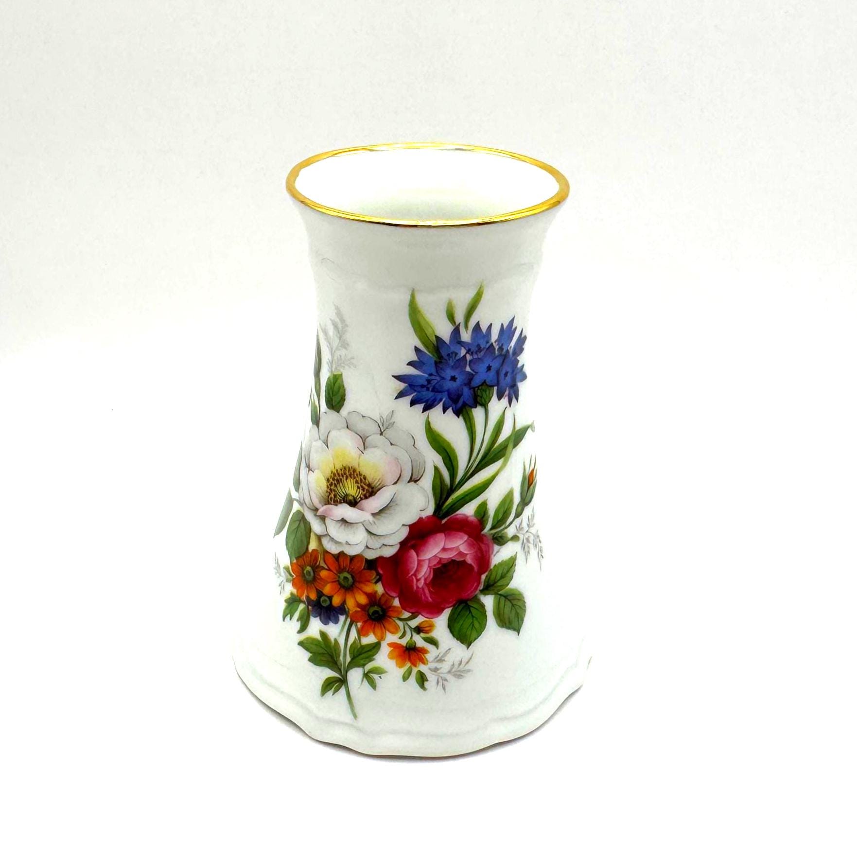 Vintage porcelain vase made in Bavaria, Germany by Kunst-Palette Regnitzlosau (K+T). Features a classic European floral design with blue cornflowers, pink and white blooms, and warm wildflower accents, finished with a bright gold gilt rim.