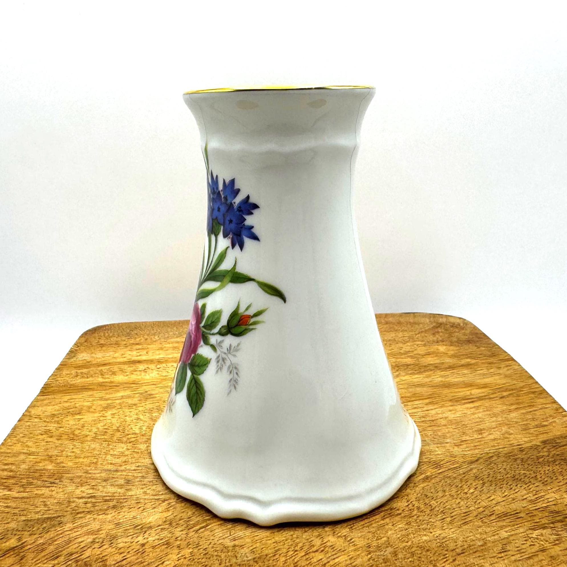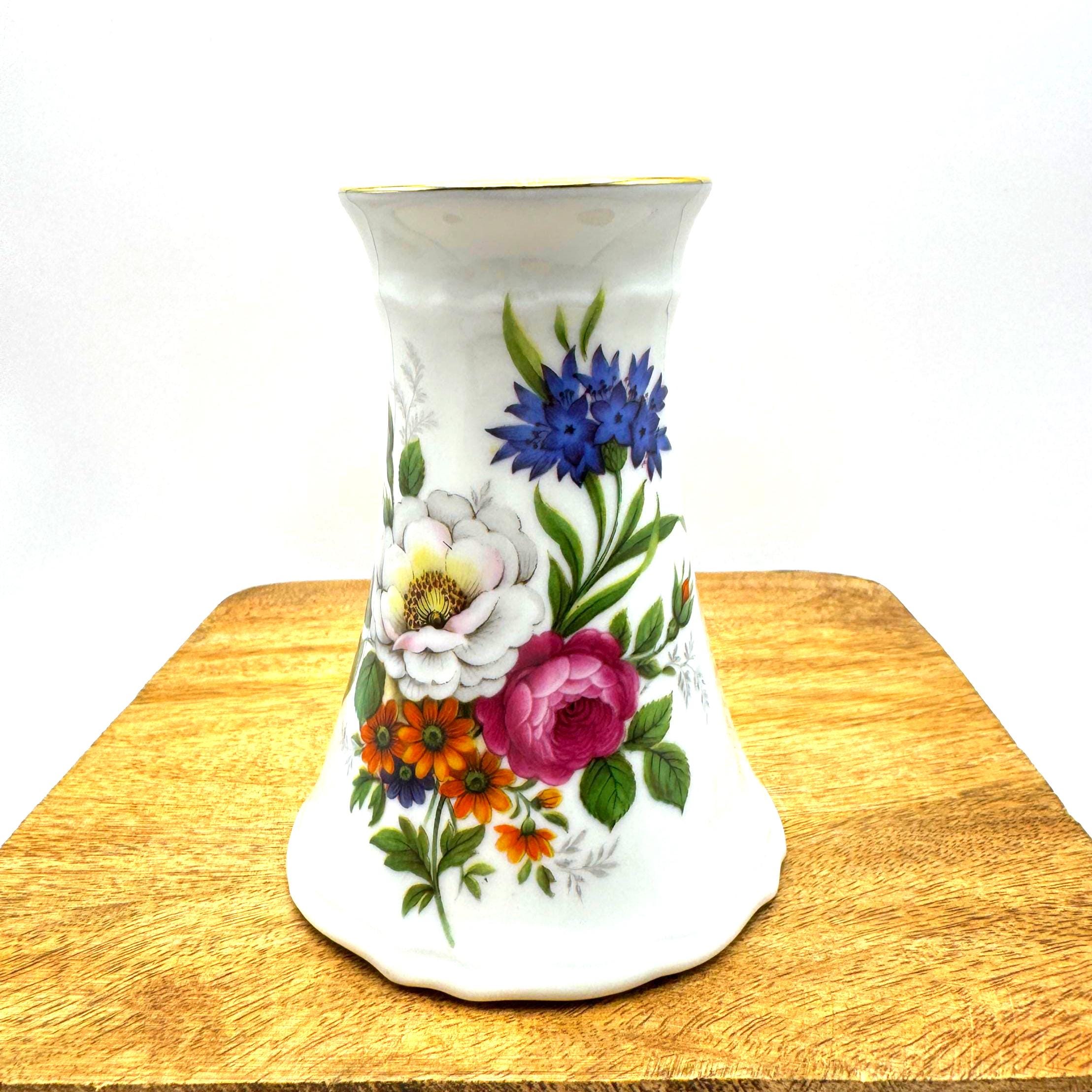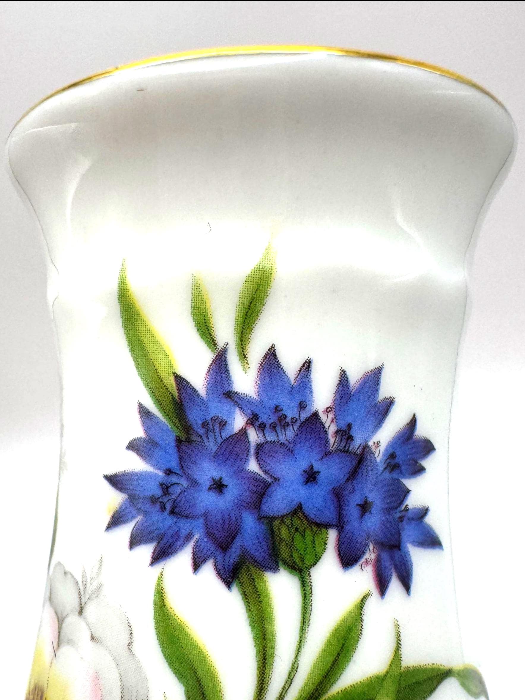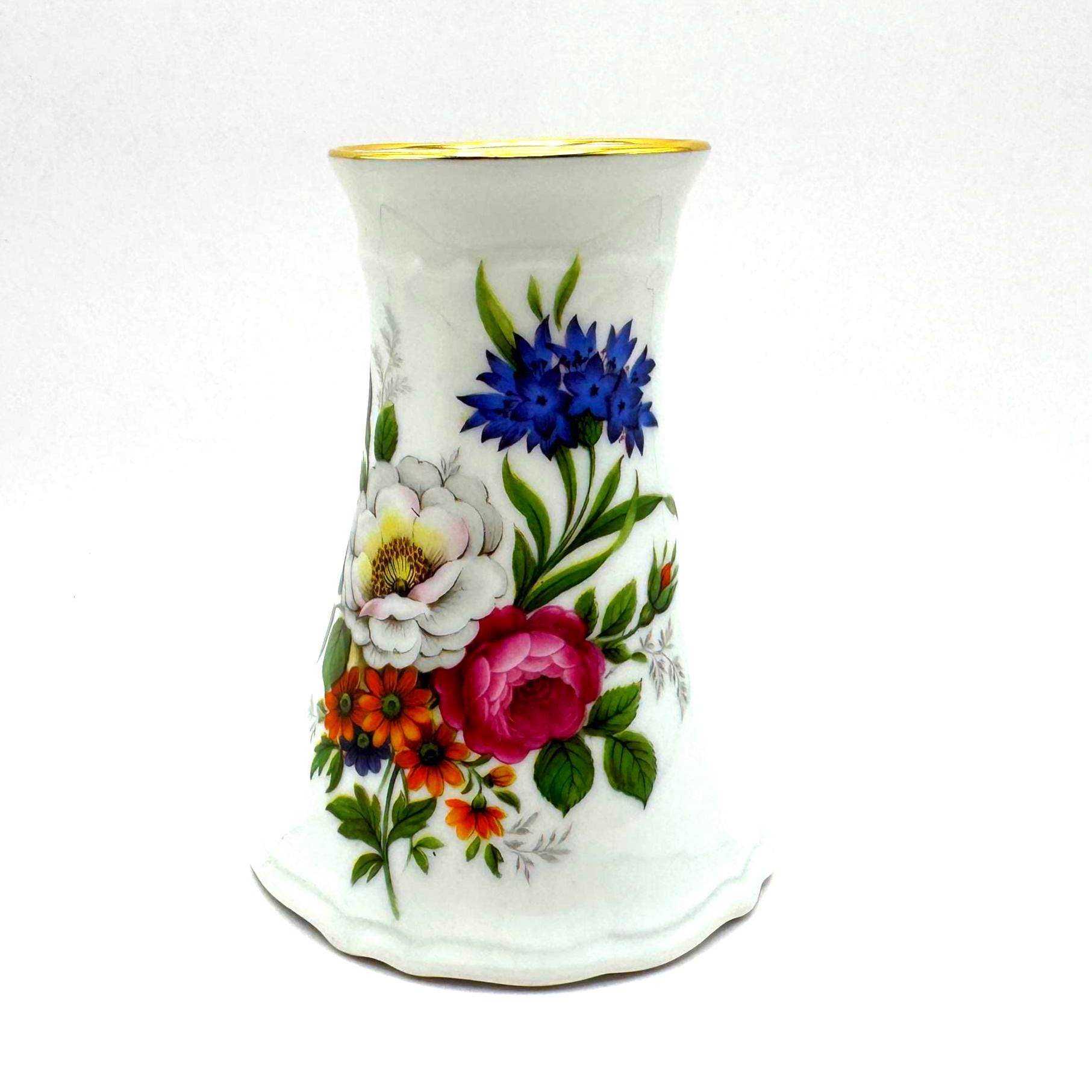 Vintage porcelain vase made in Bavaria, Germany by Kunst-Palette Regnitzlosau (K+T). Features a classic European floral design with blue cornflowers, pink and white blooms, and warm wildflower accents, finished with a bright gold gilt rim.