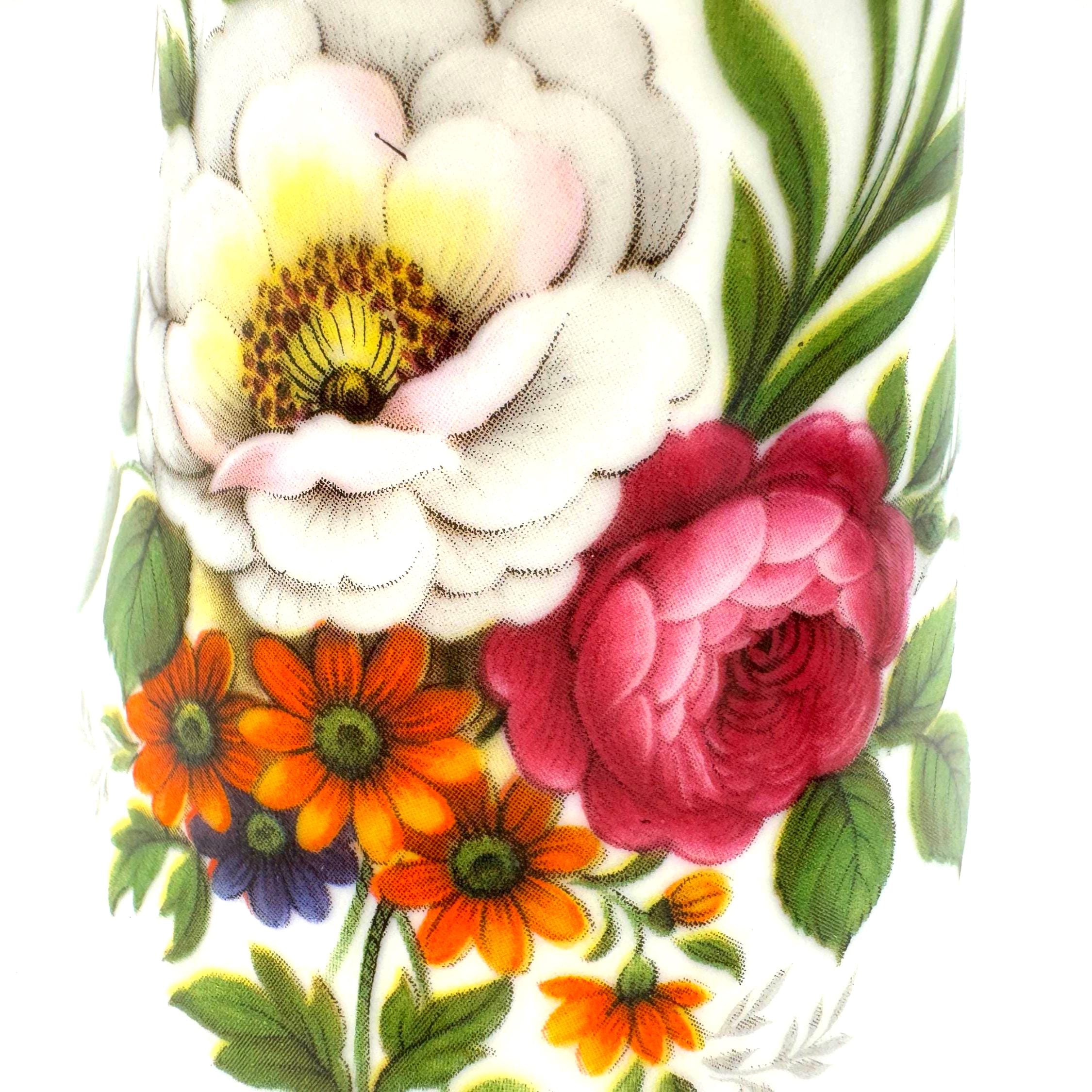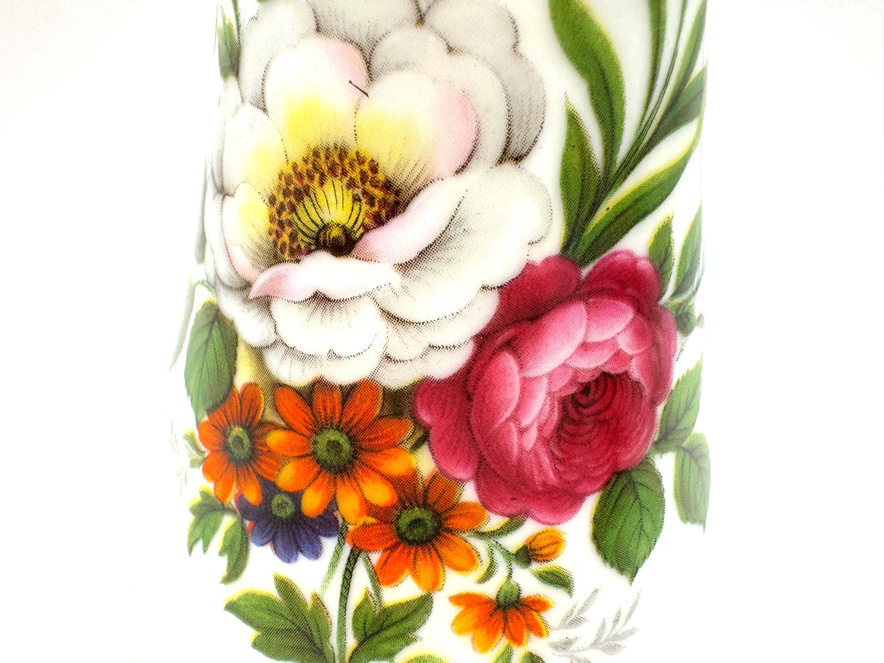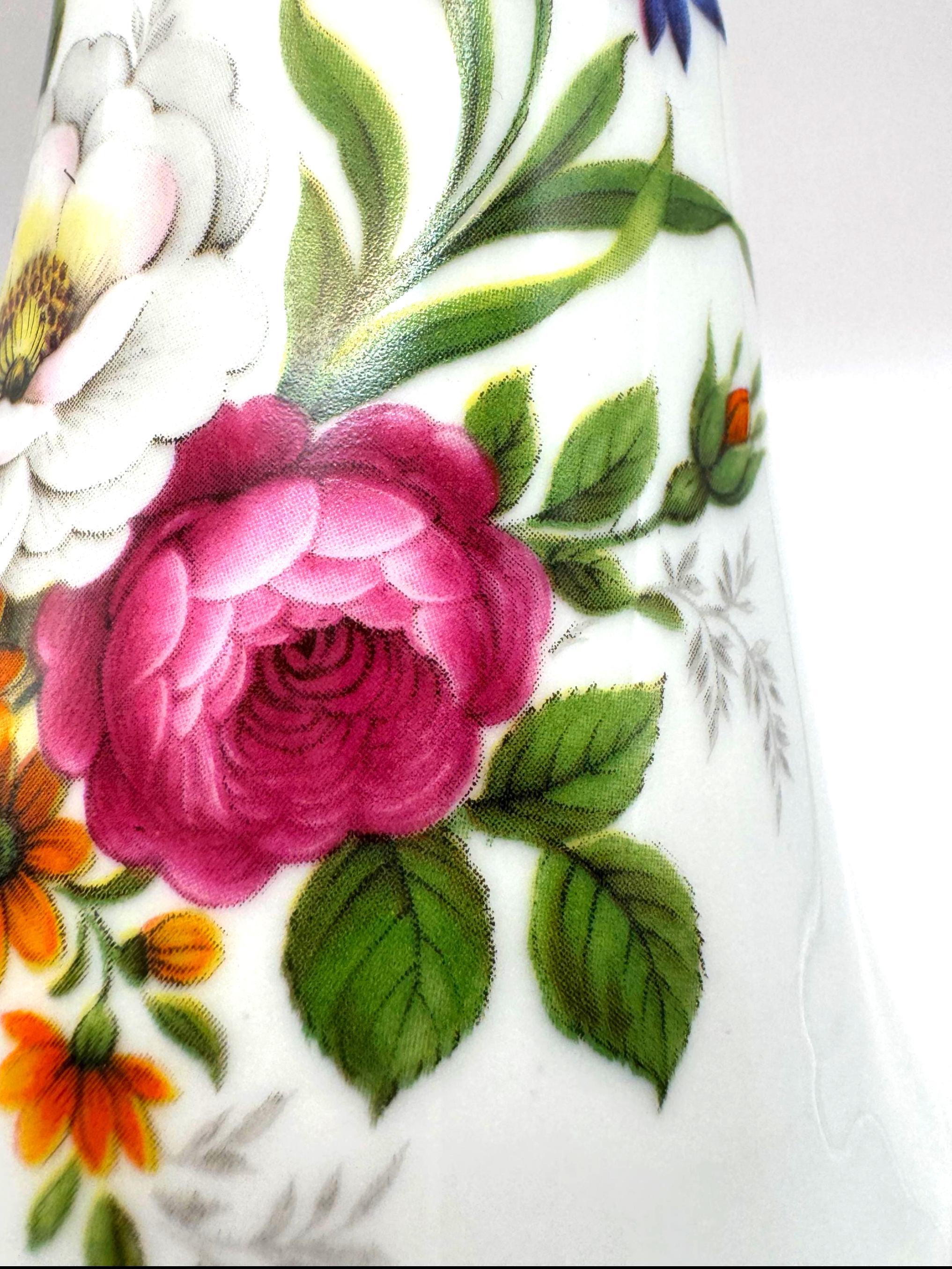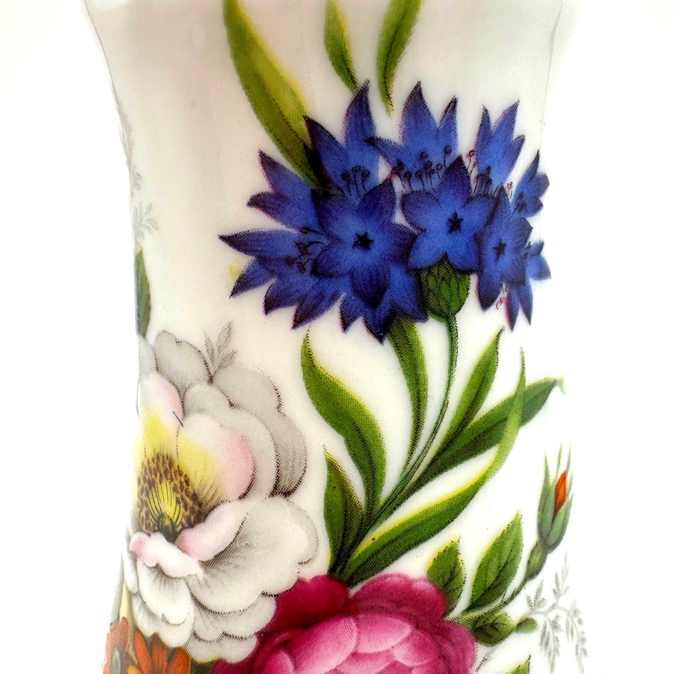 Vintage porcelain vase made in Bavaria, Germany by Kunst-Palette Regnitzlosau (K+T). Features a classic European floral design with blue cornflowers, pink and white blooms, and warm wildflower accents, finished with a bright gold gilt rim.