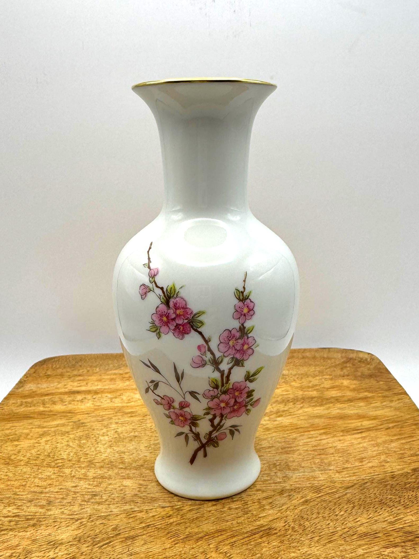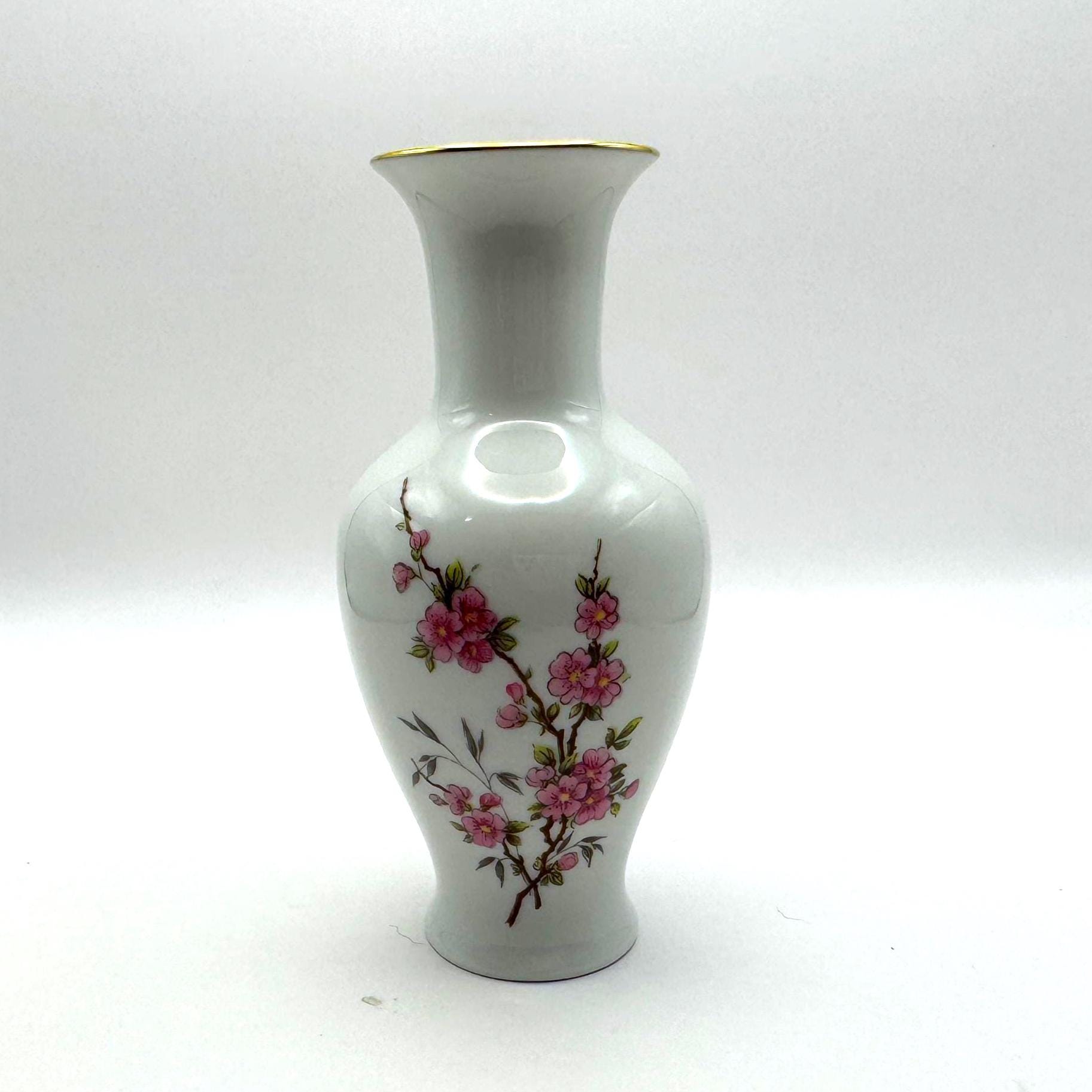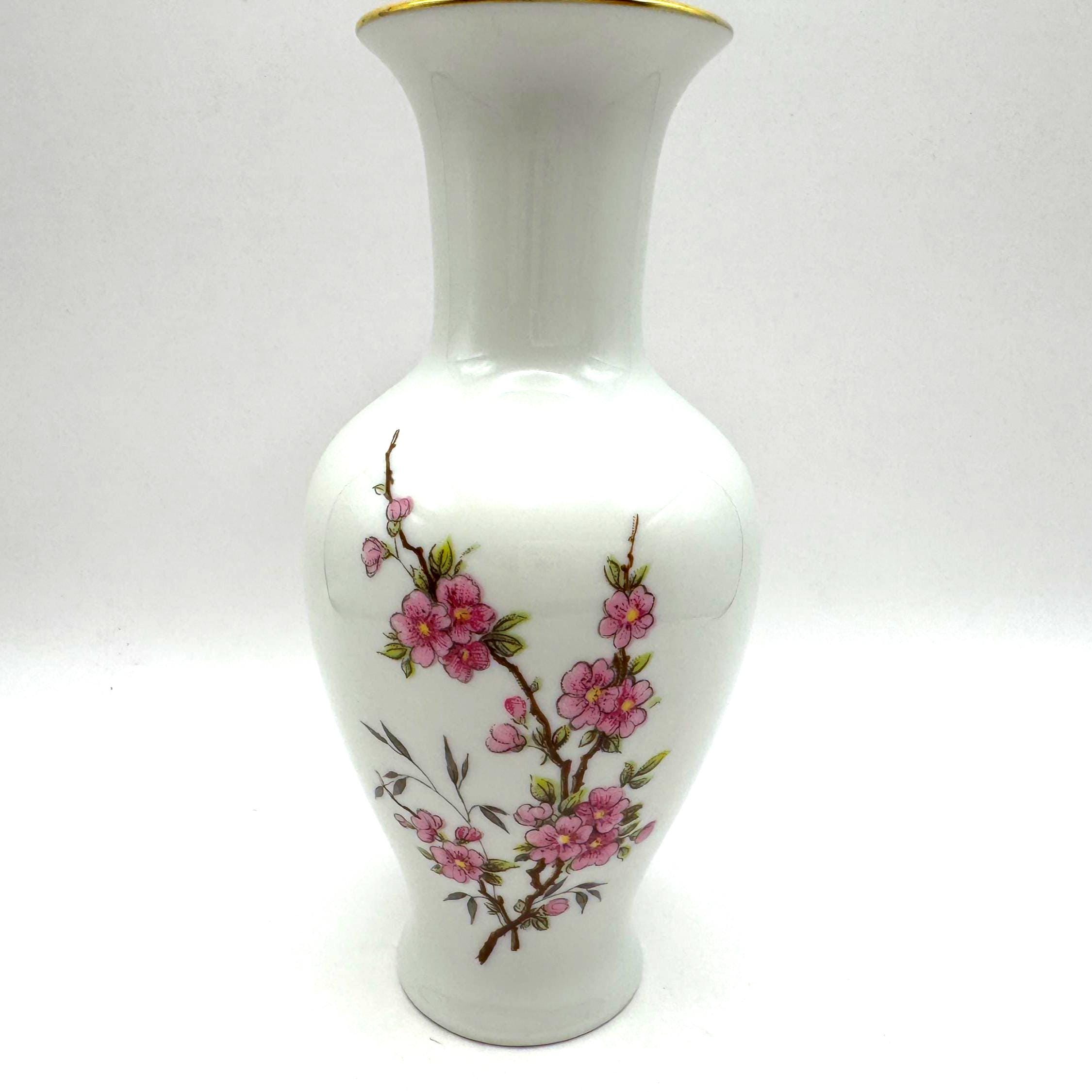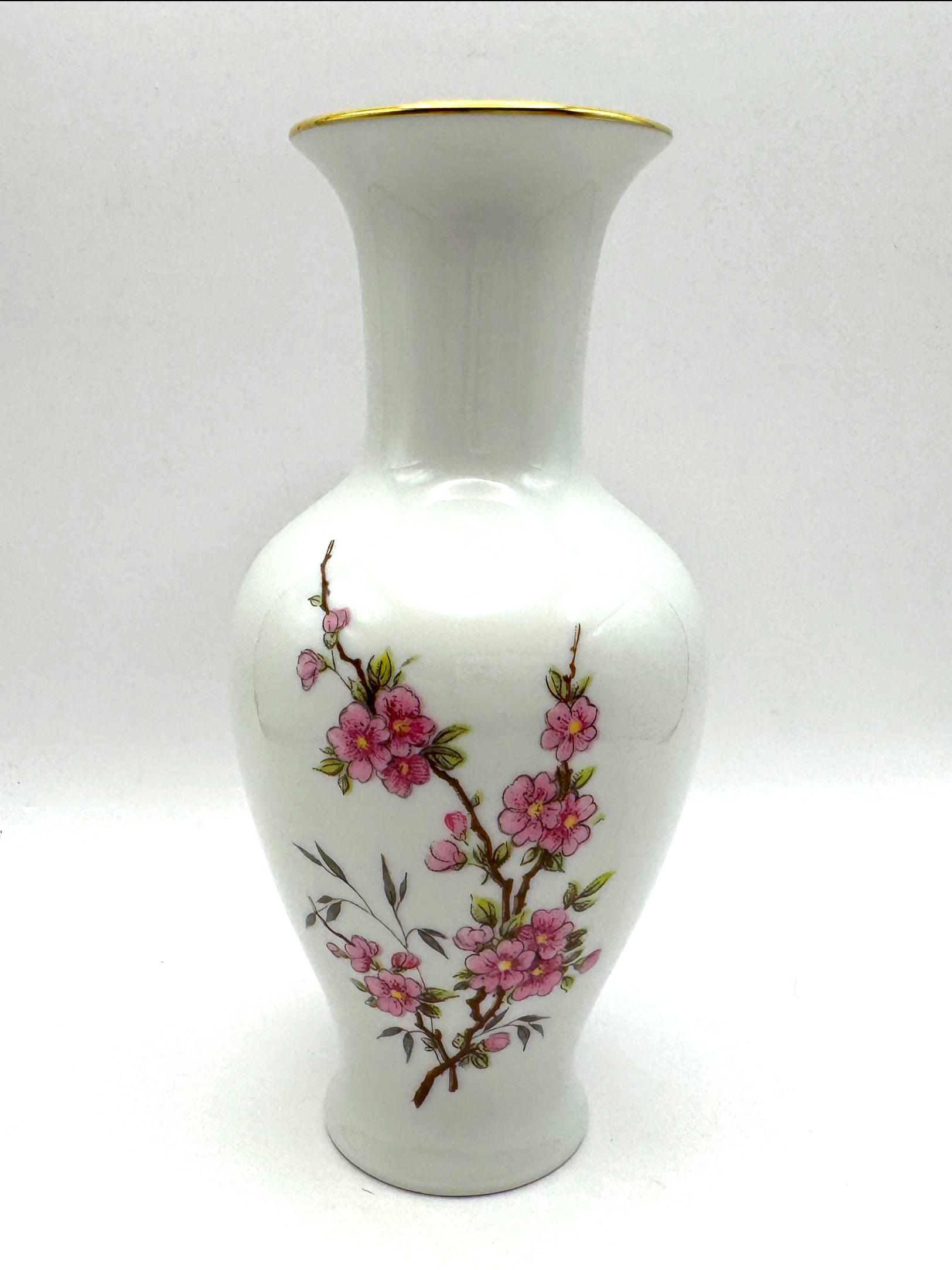 Elegant vintage porcelain vase made in Germany by Tirschenreuth, marked AT Tirschenreuth 1838 Germany on the base. This classic vase features delicate pink cherry blossom branches on a soft white porcelain body, finished with a bright gold gilt rim.