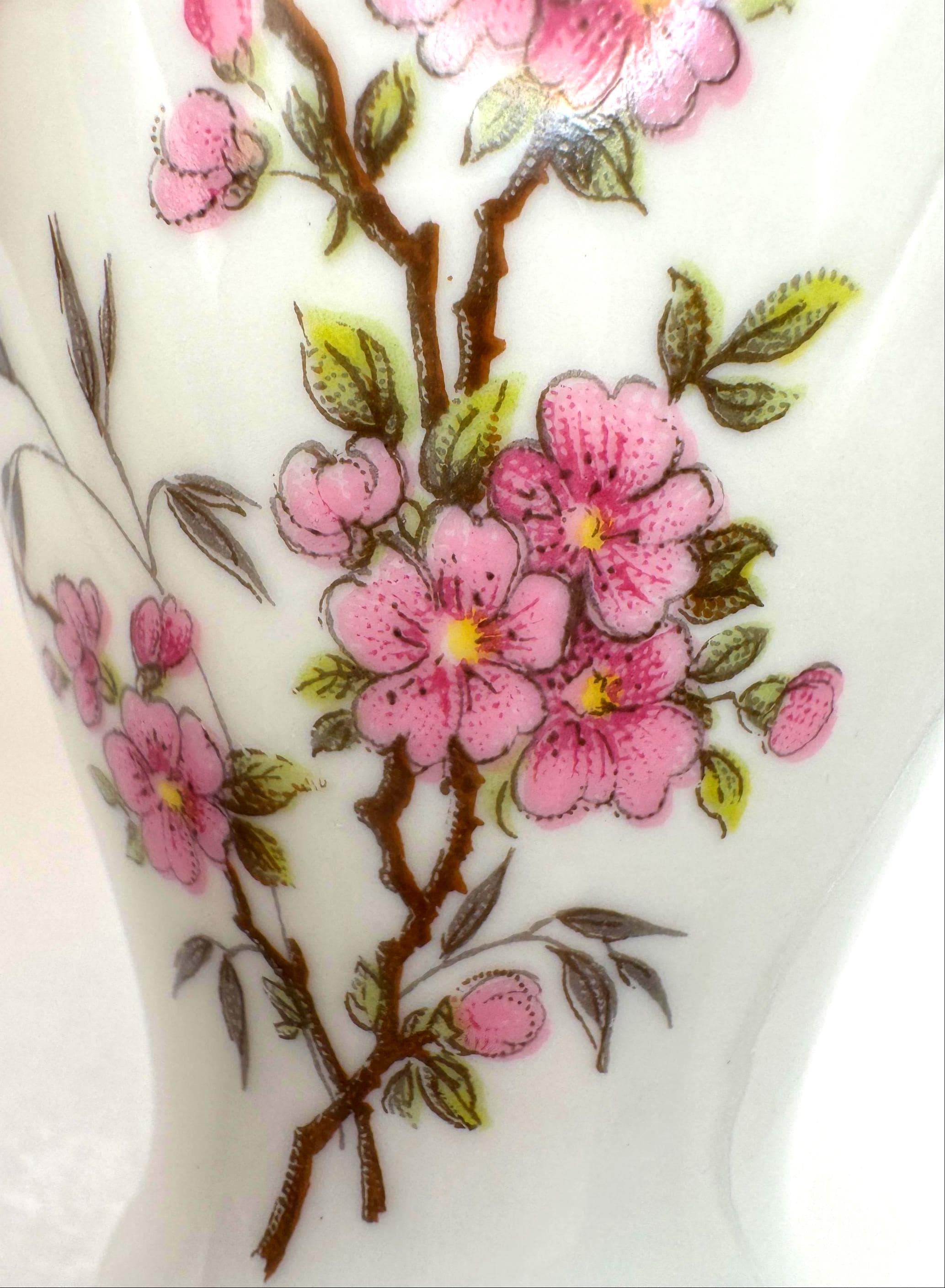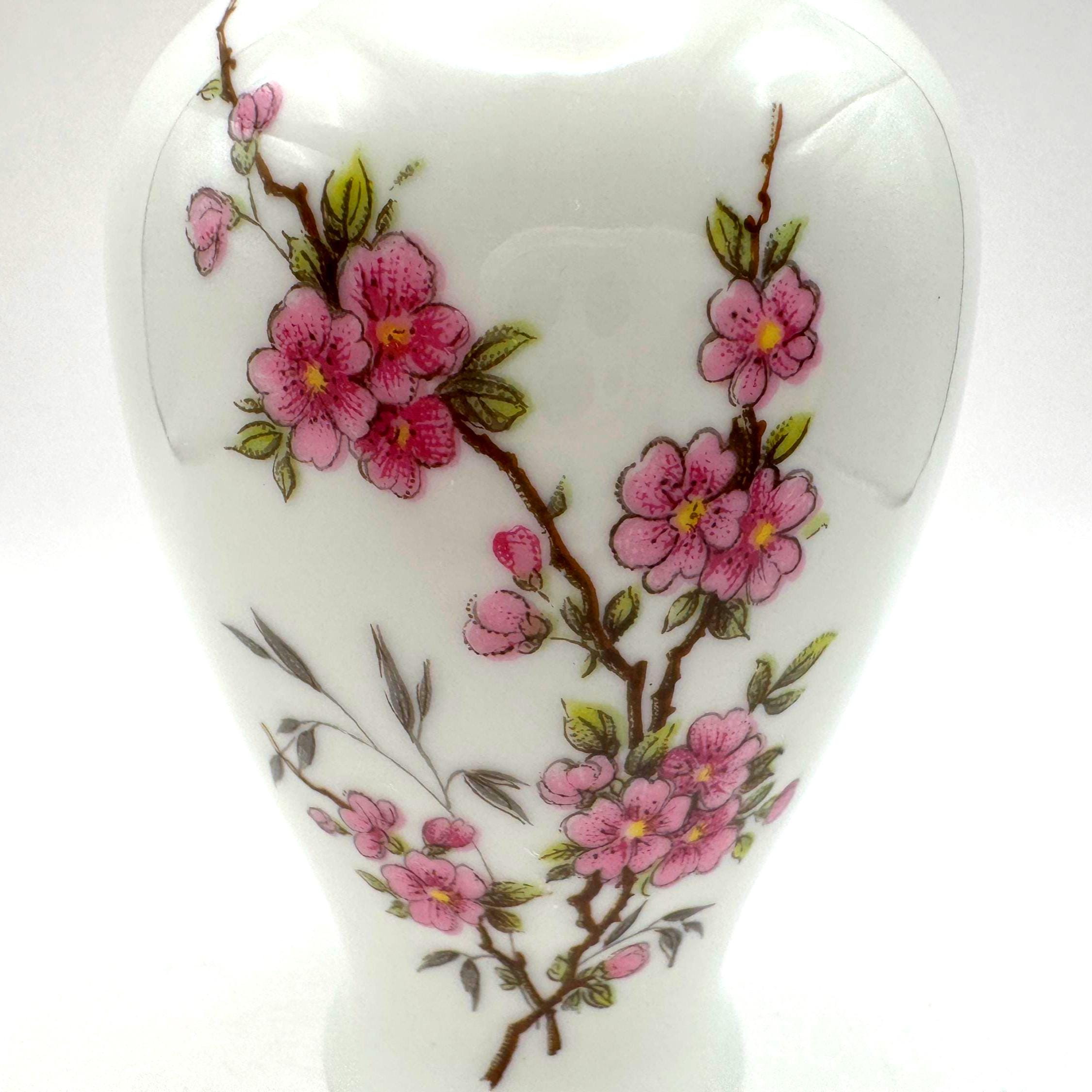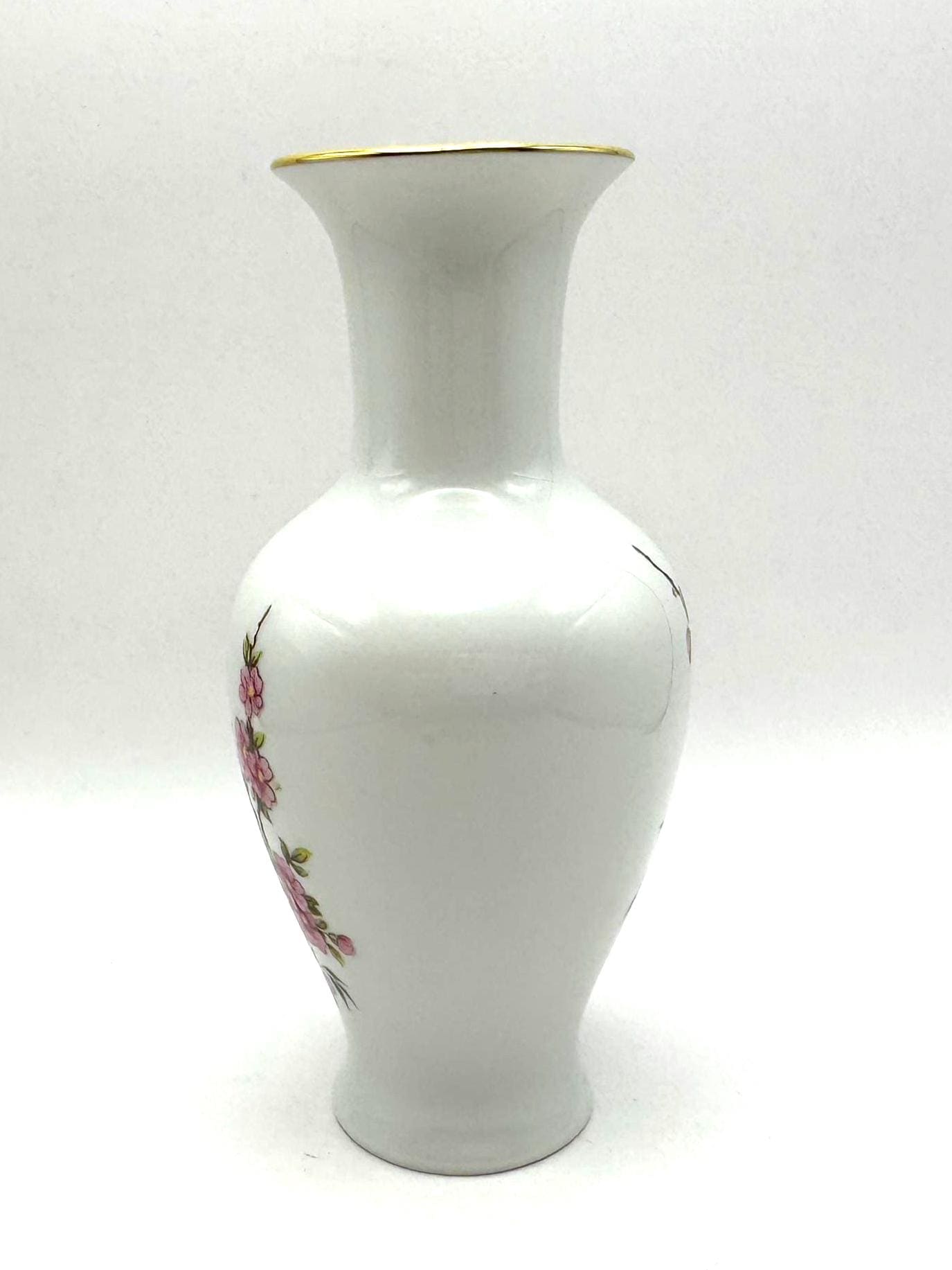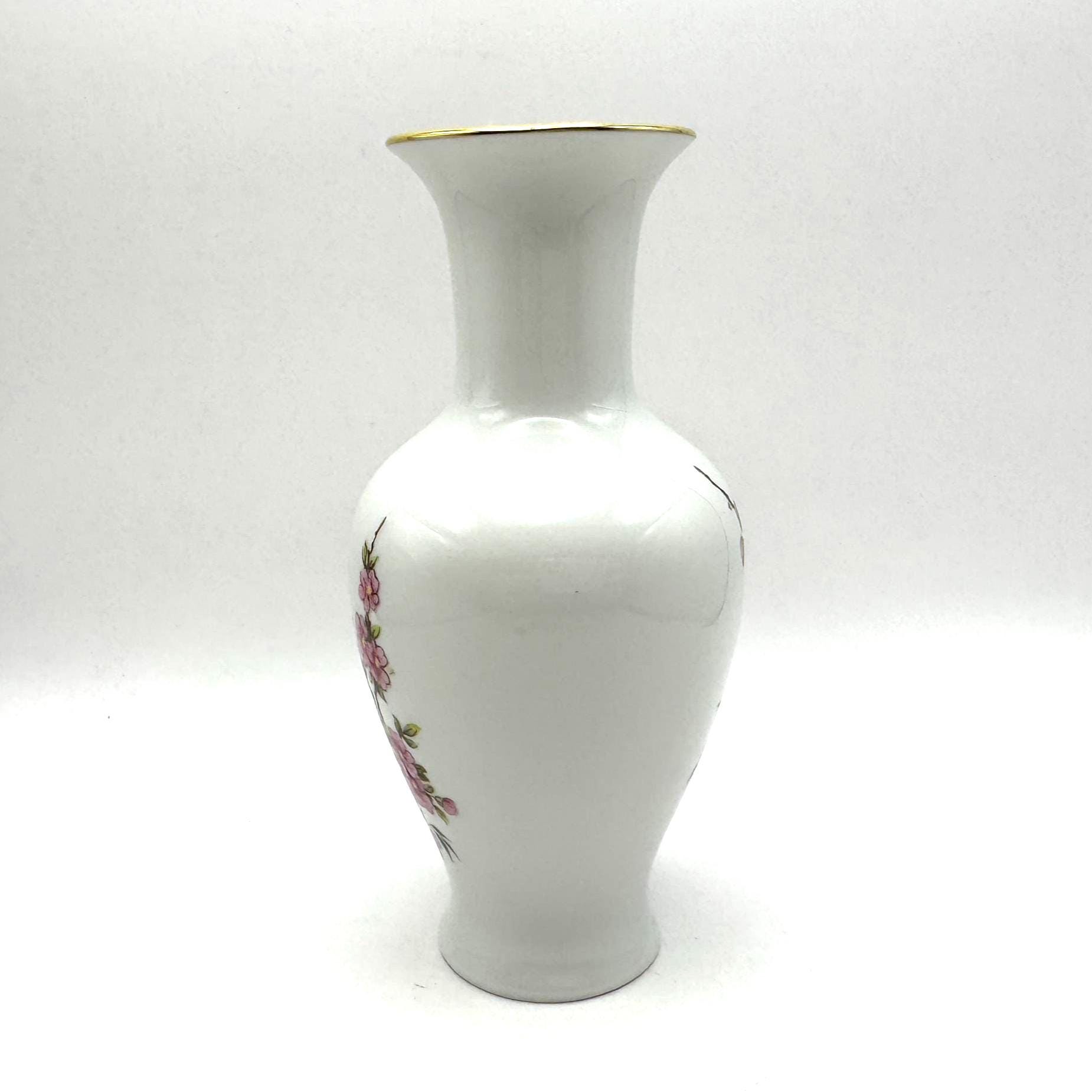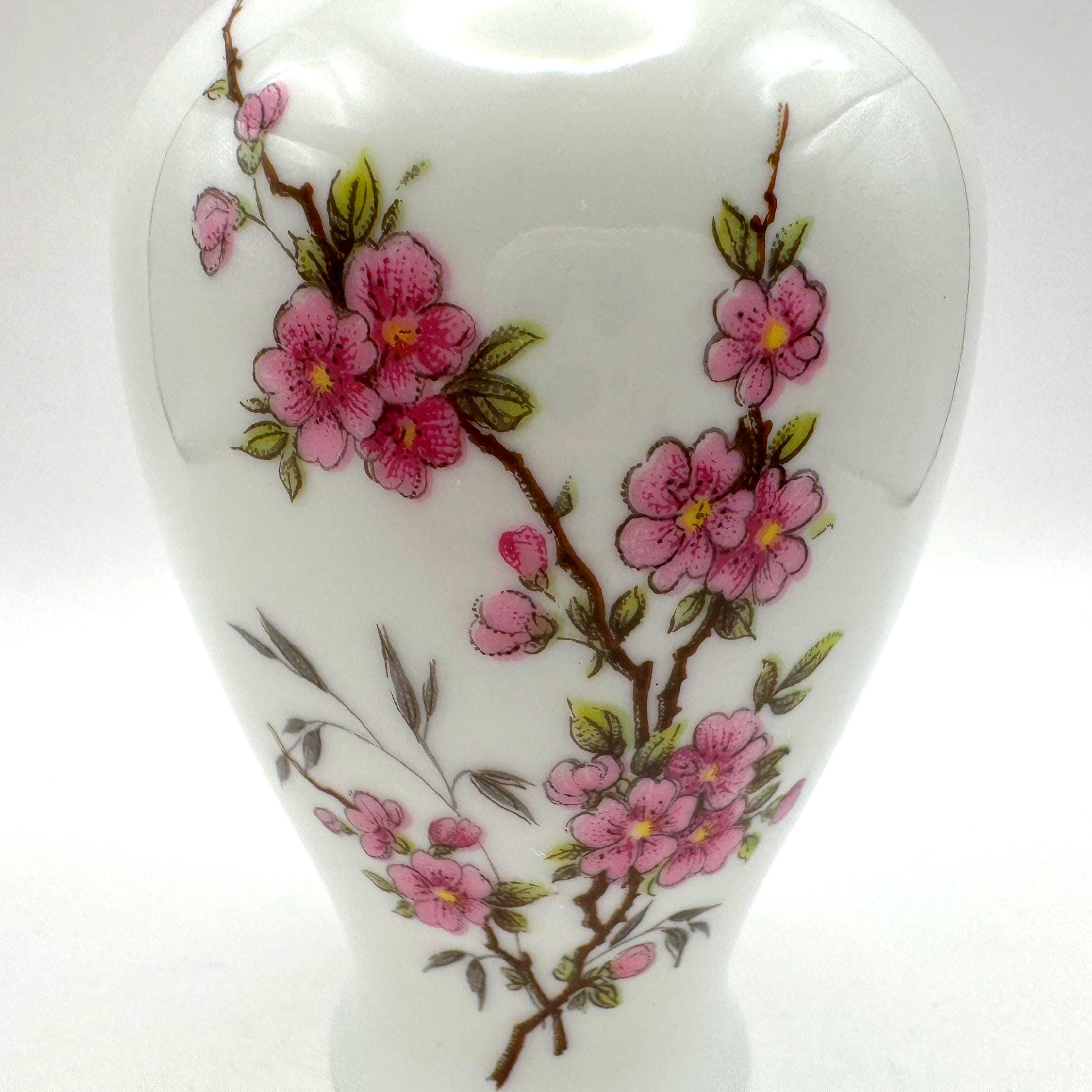 Elegant vintage porcelain vase made in Germany by Tirschenreuth, marked AT Tirschenreuth 1838 Germany on the base. This classic vase features delicate pink cherry blossom branches on a soft white porcelain body, finished with a bright gold gilt rim.