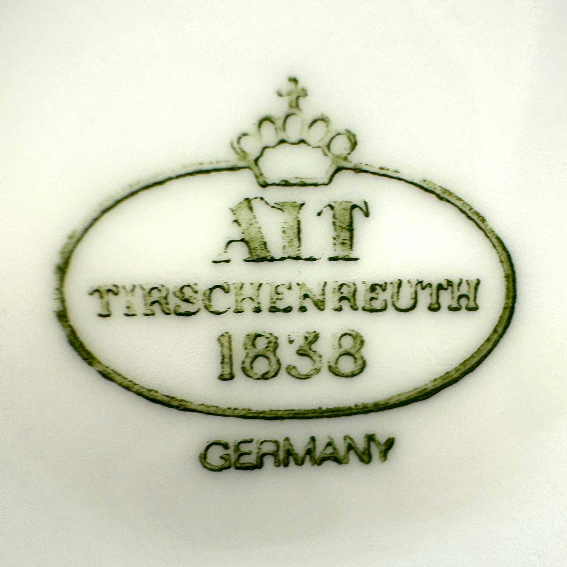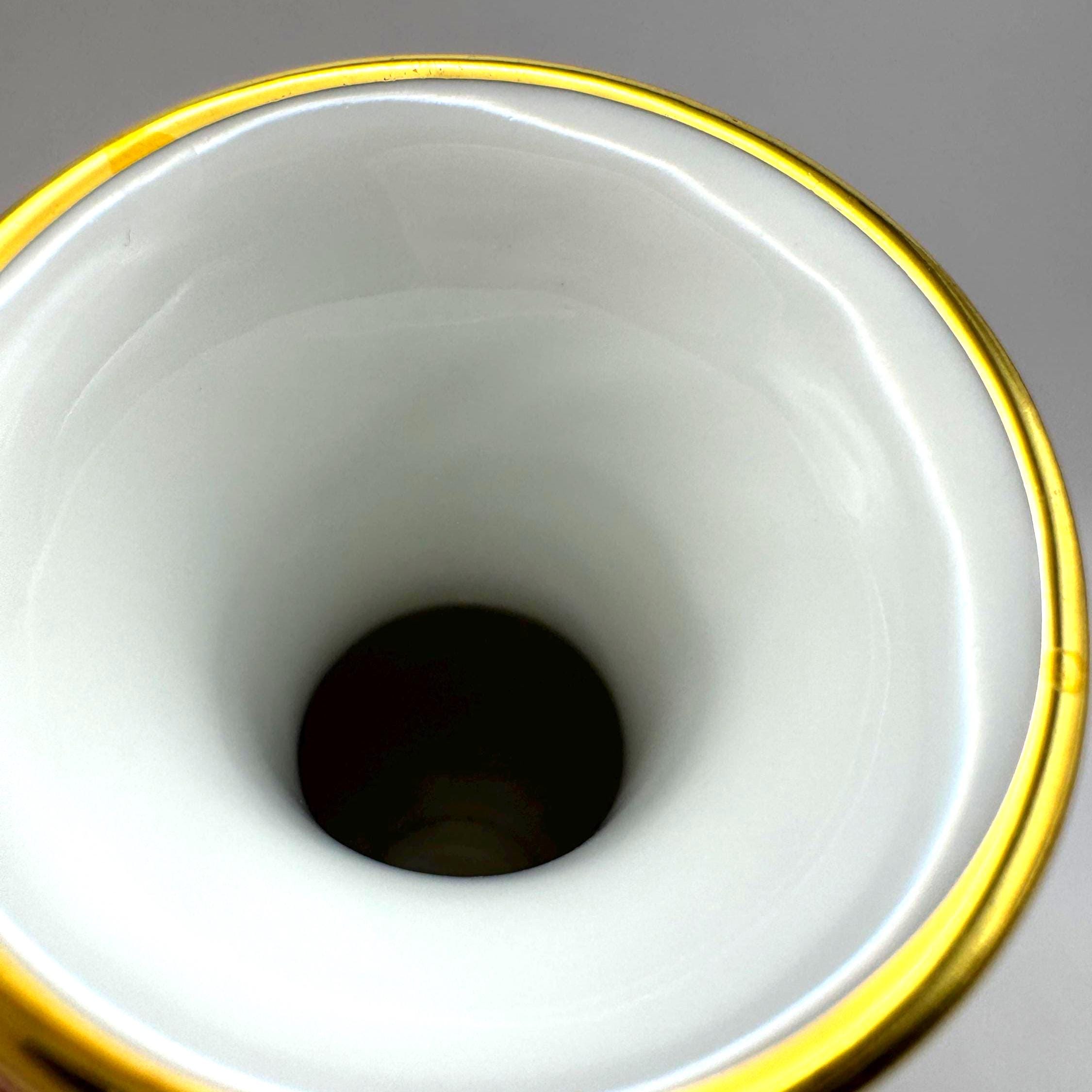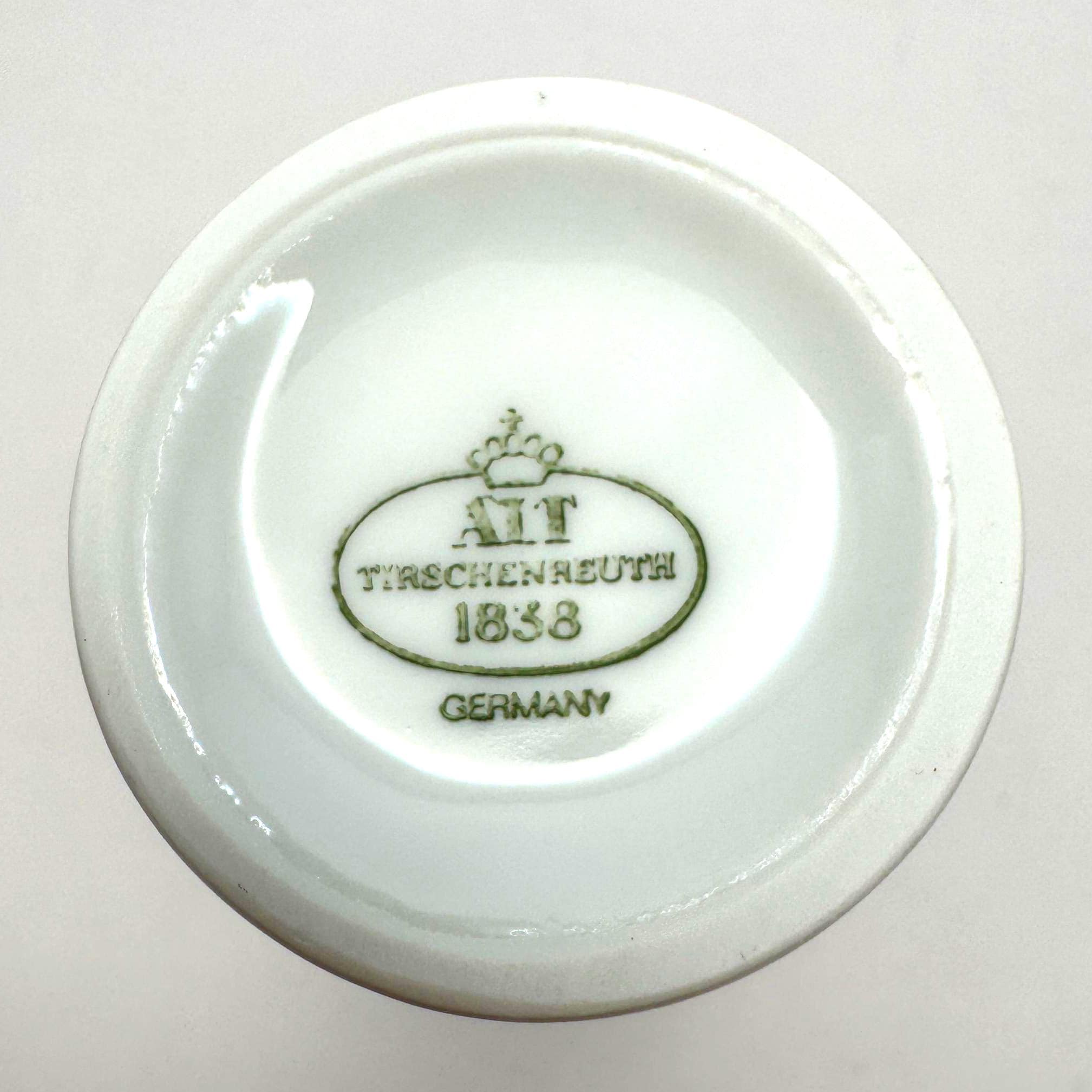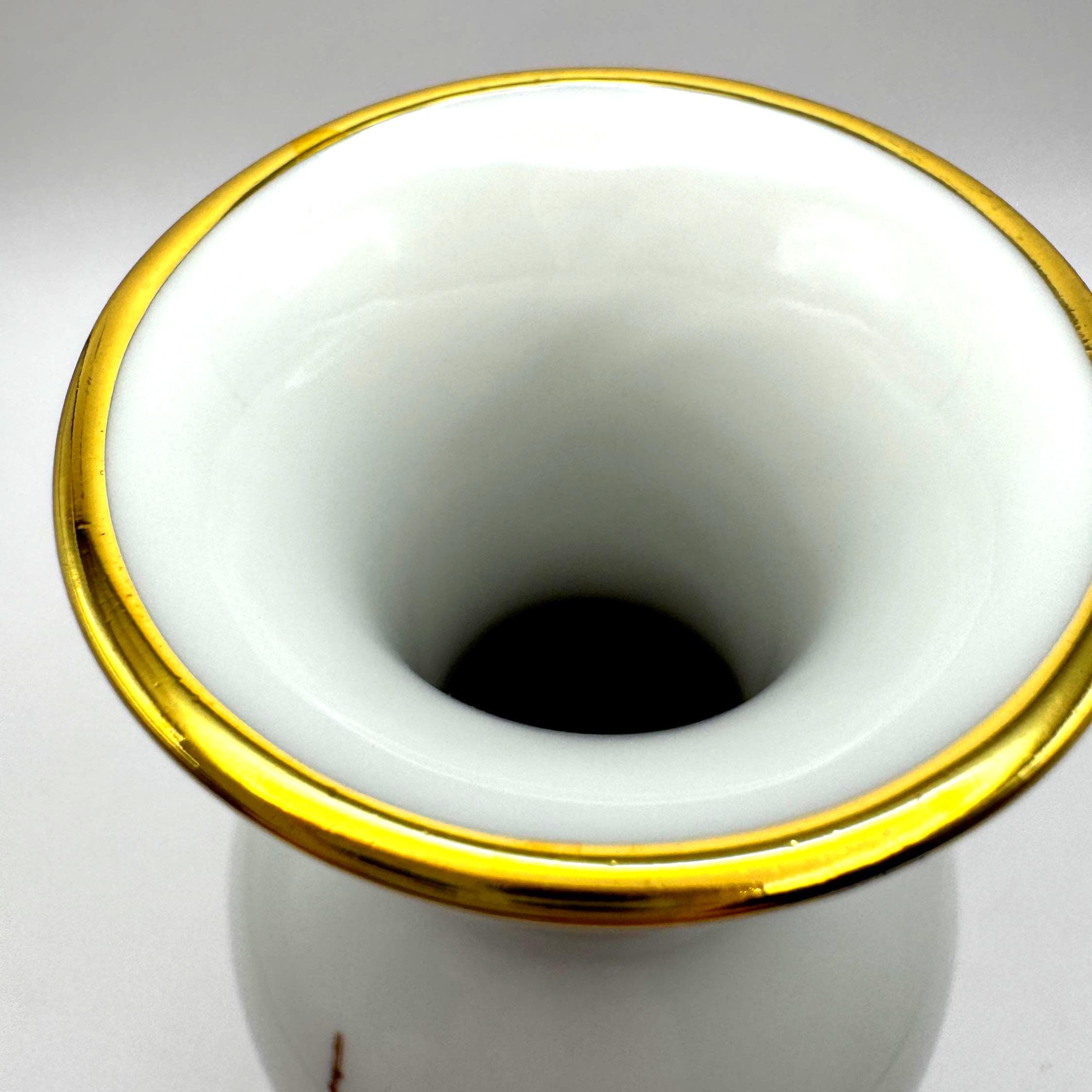 Elegant vintage porcelain vase made in Germany by Tirschenreuth, marked AT Tirschenreuth 1838 Germany on the base. This classic vase features delicate pink cherry blossom branches on a soft white porcelain body, finished with a bright gold gilt rim.