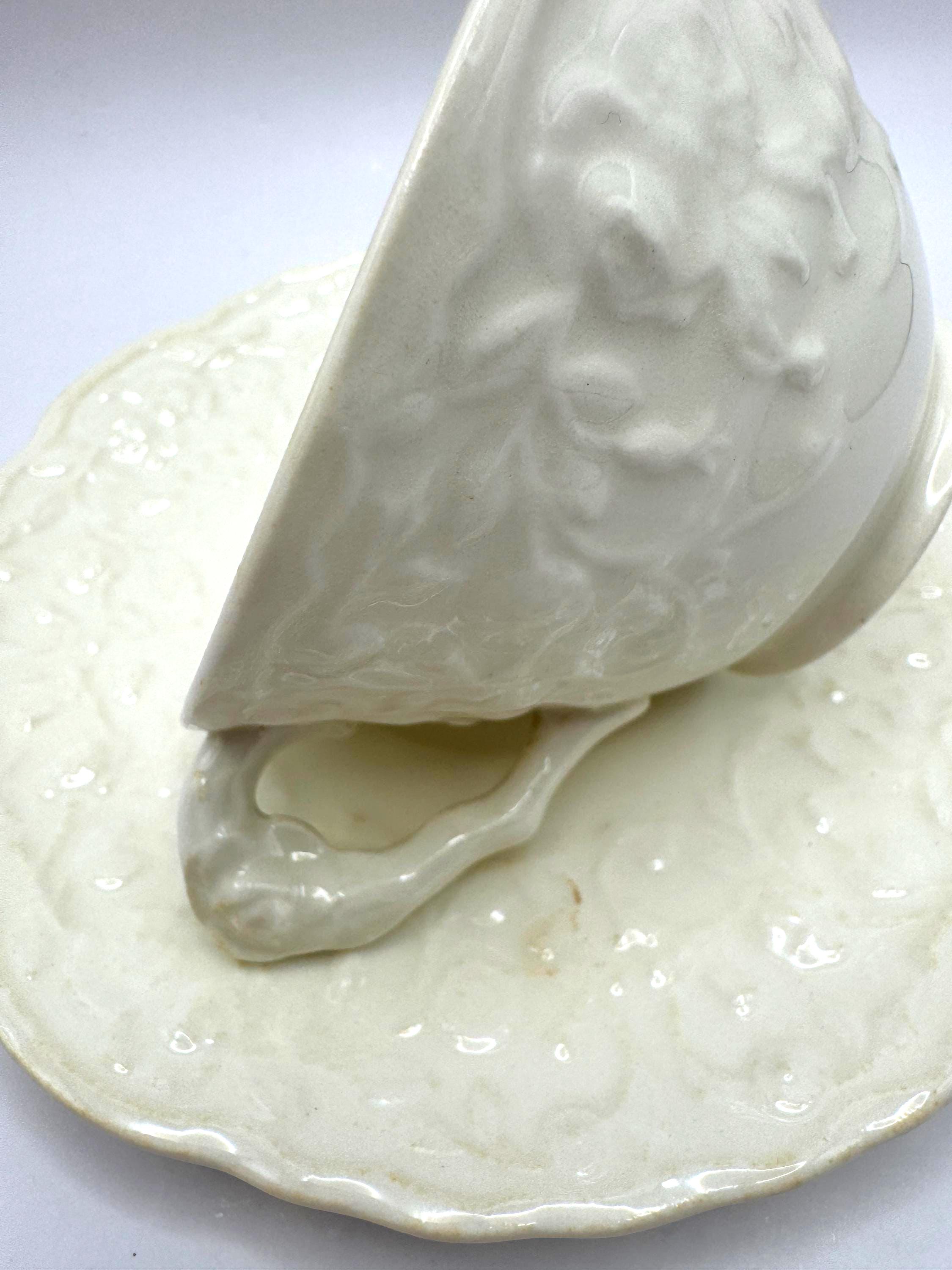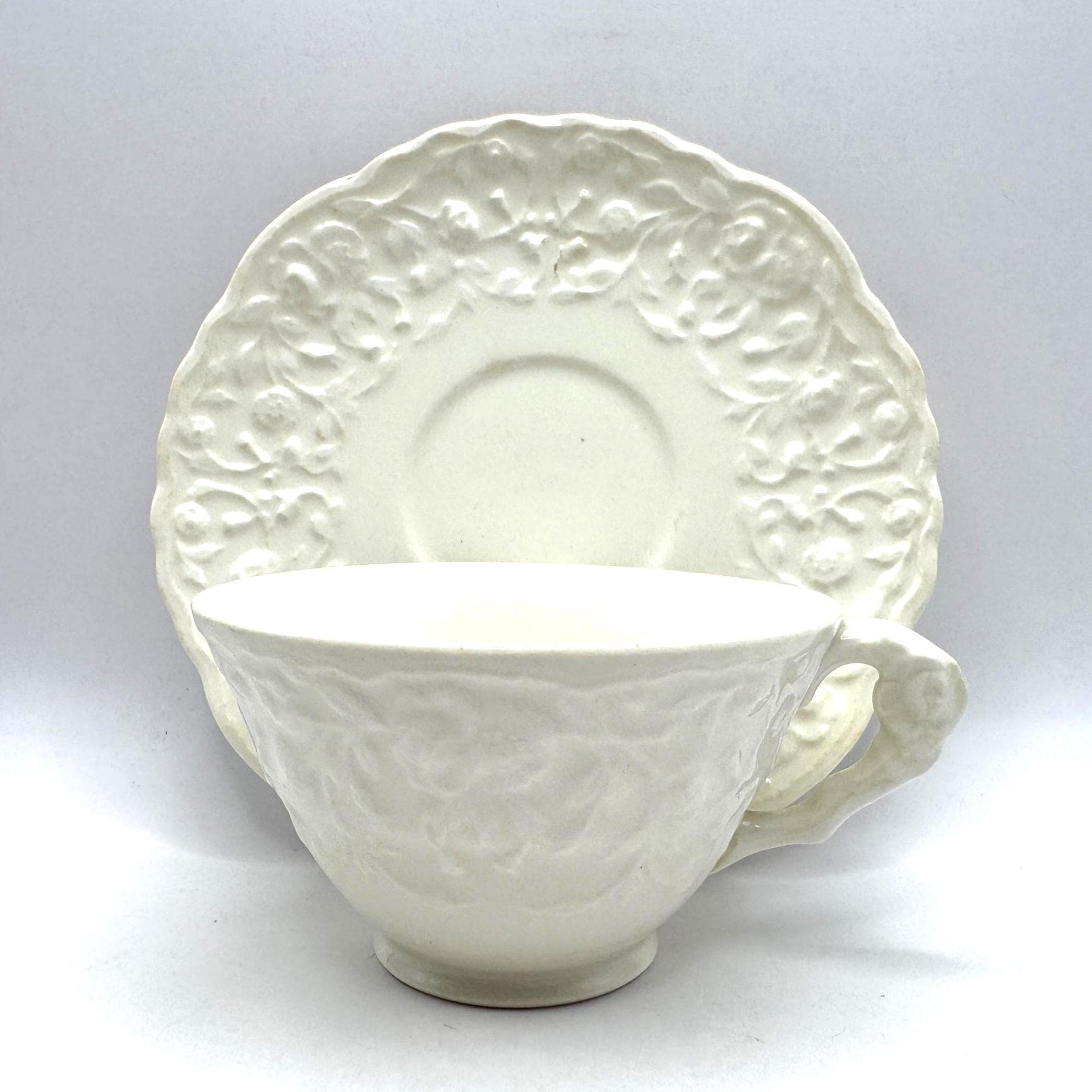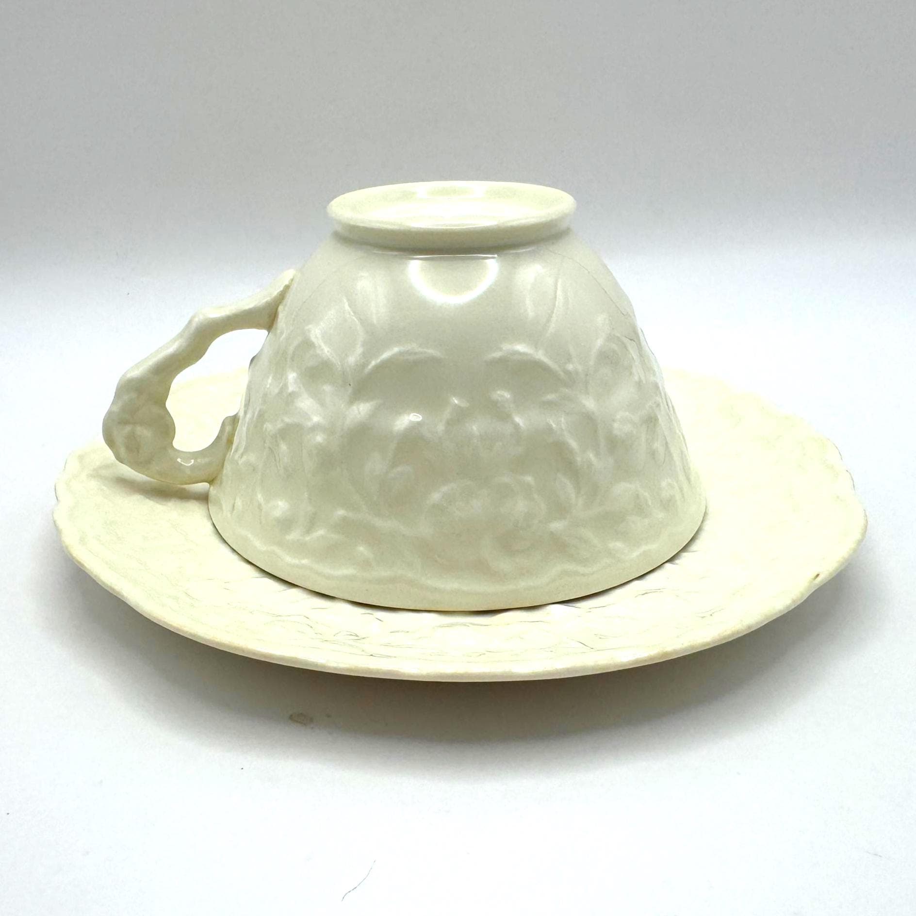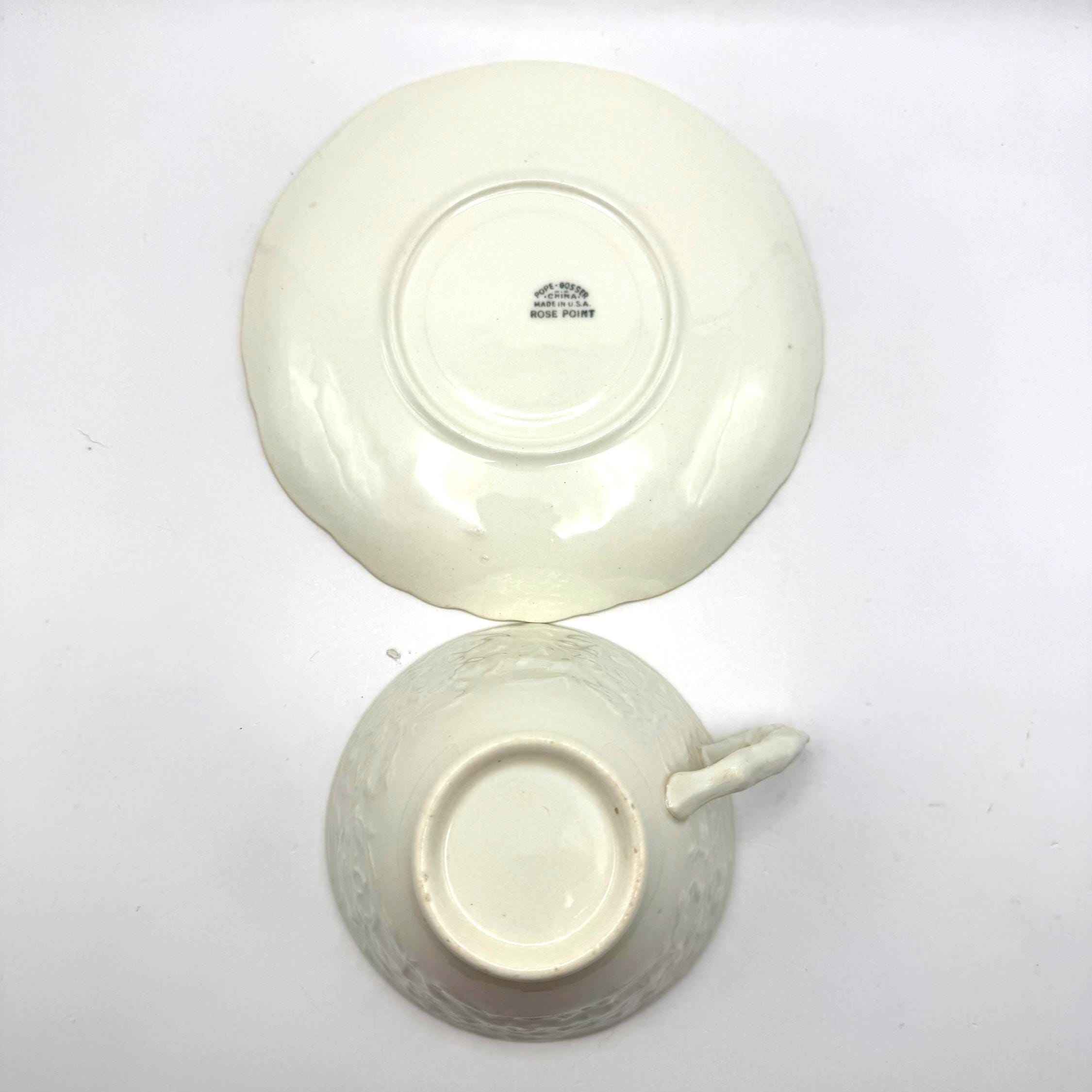 Classic vintage Pope-Gosser “Rose Point” cup and saucer set, made in the USA. This timeless pattern features elegant raised floral scrollwork in a soft ivory glaze, known for its romantic, traditional look and substantial feel.