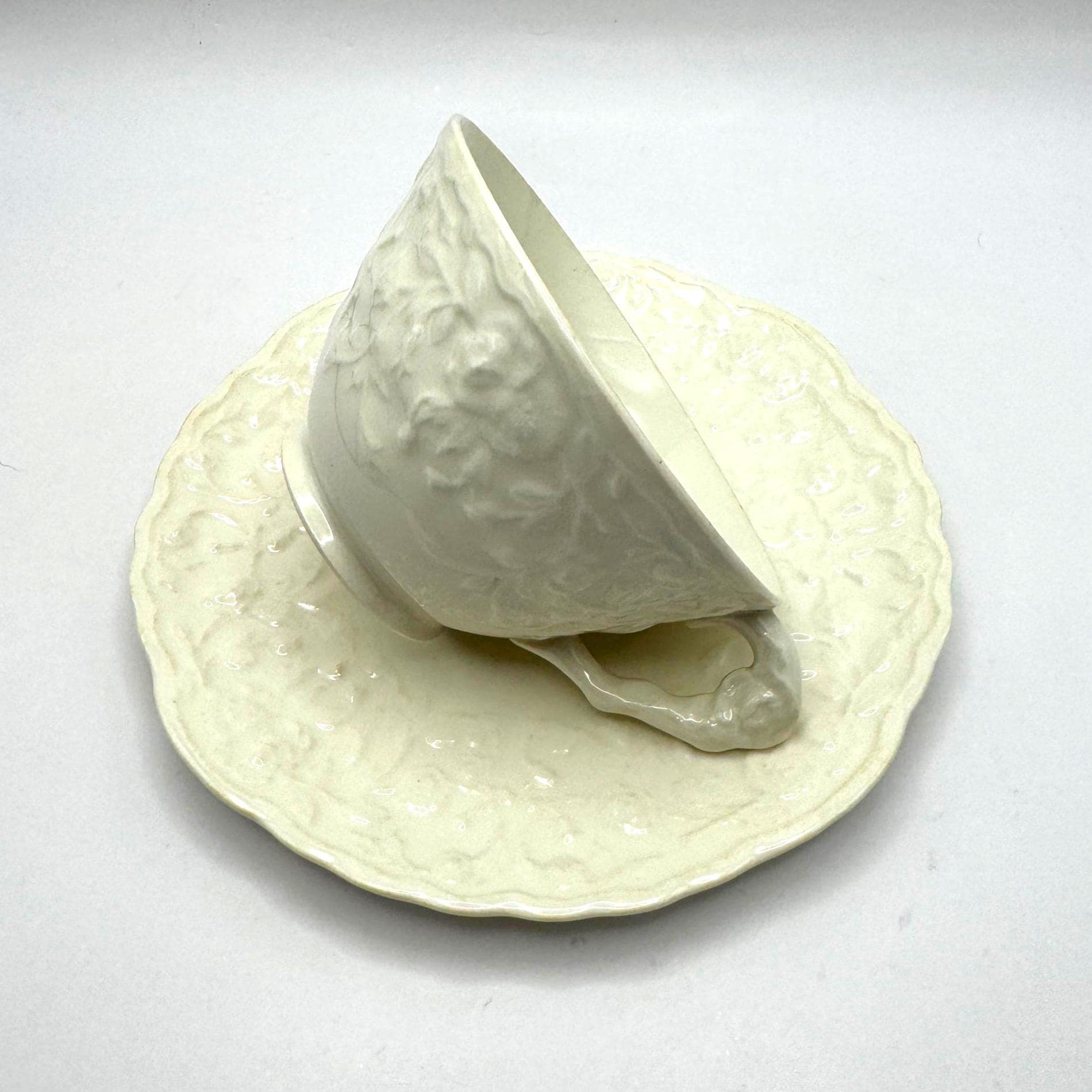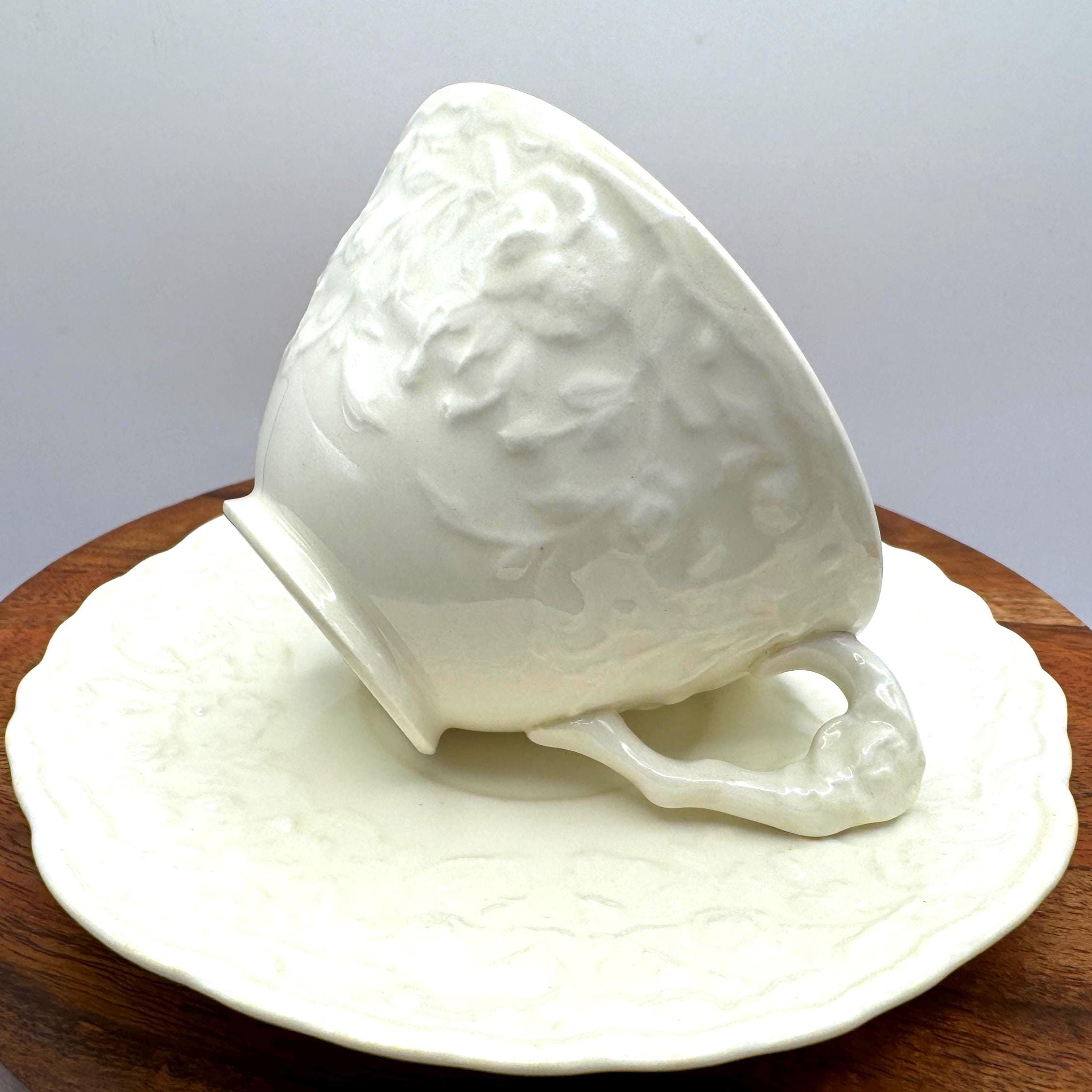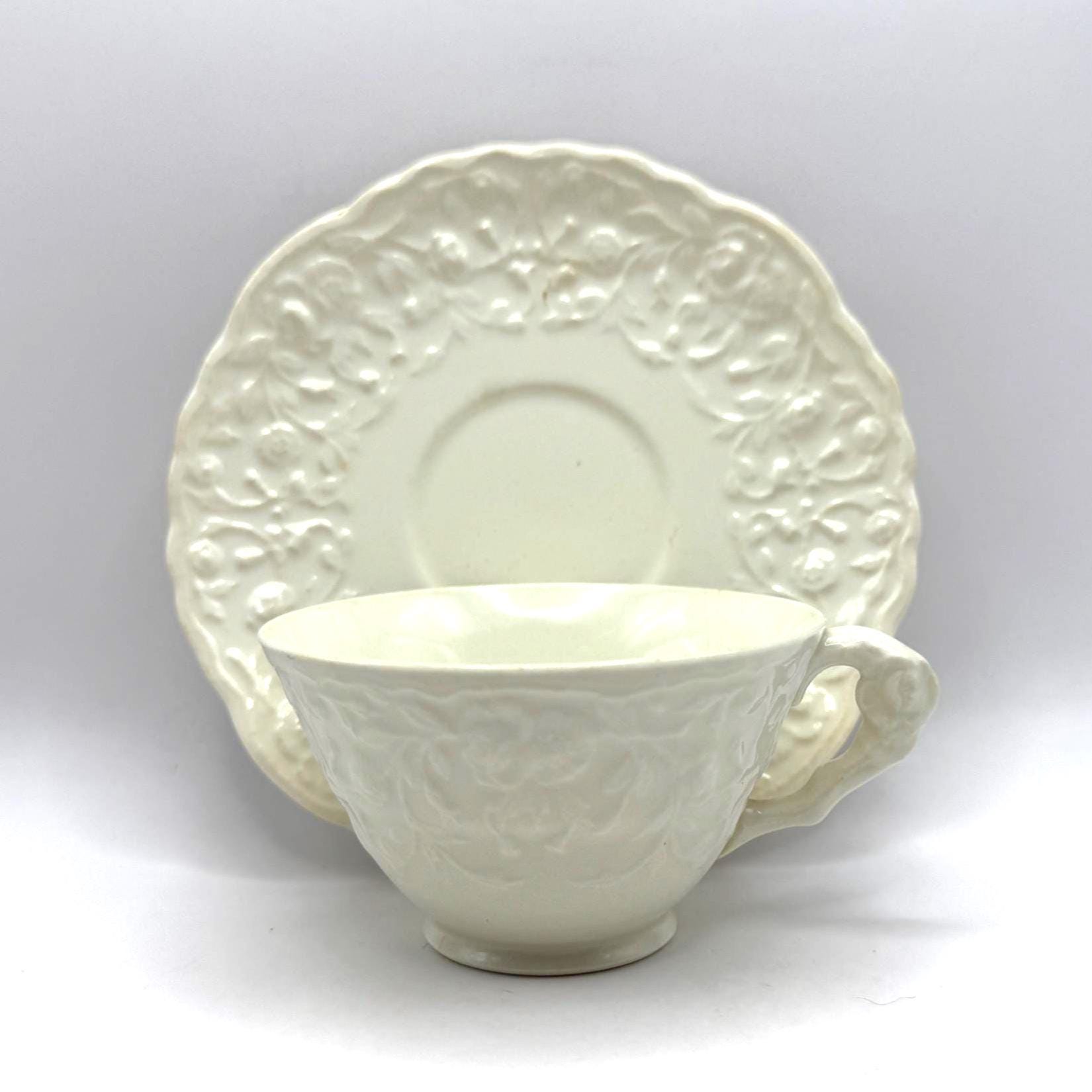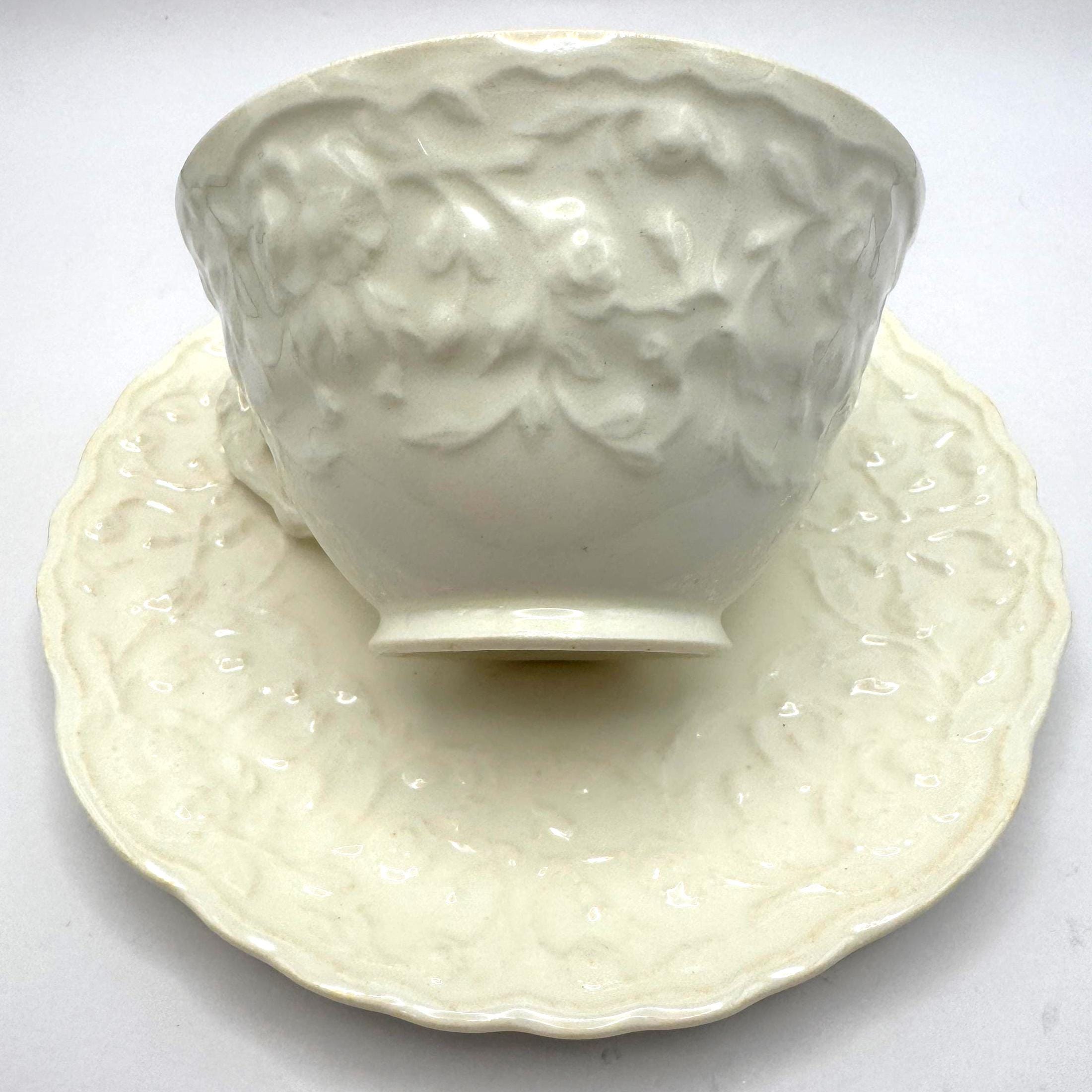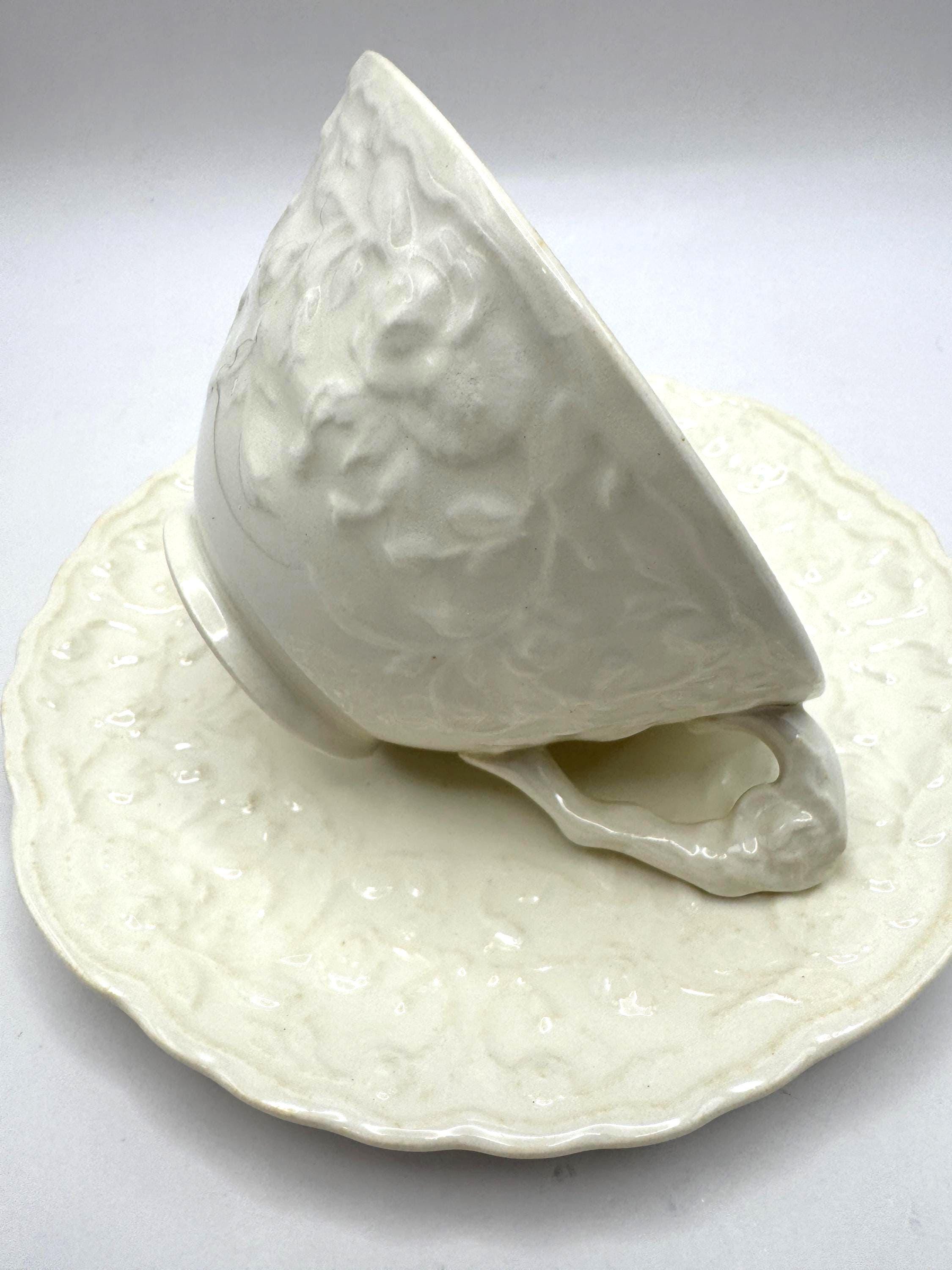 Classic vintage Pope-Gosser “Rose Point” cup and saucer set, made in the USA. This timeless pattern features elegant raised floral scrollwork in a soft ivory glaze, known for its romantic, traditional look and substantial feel.