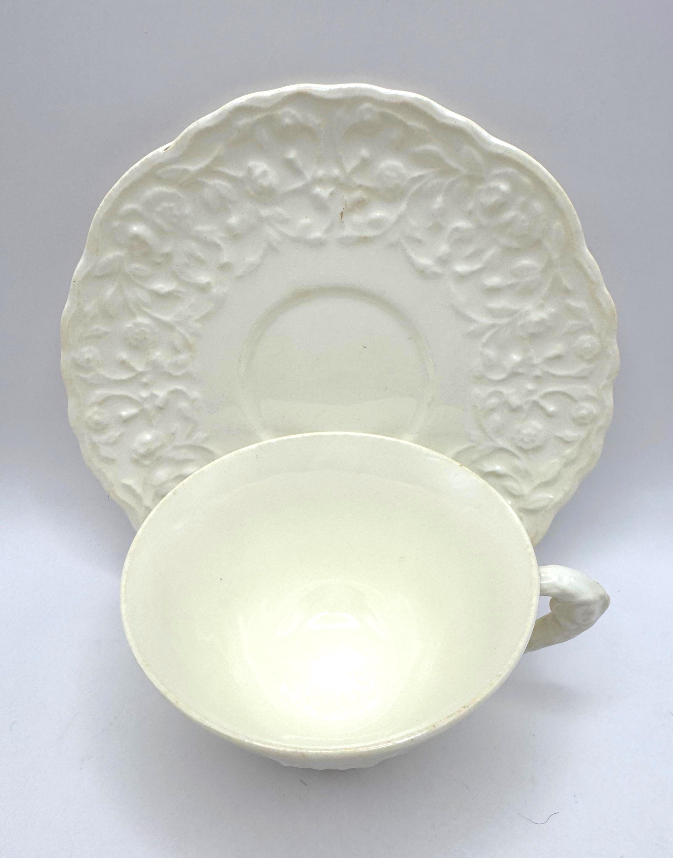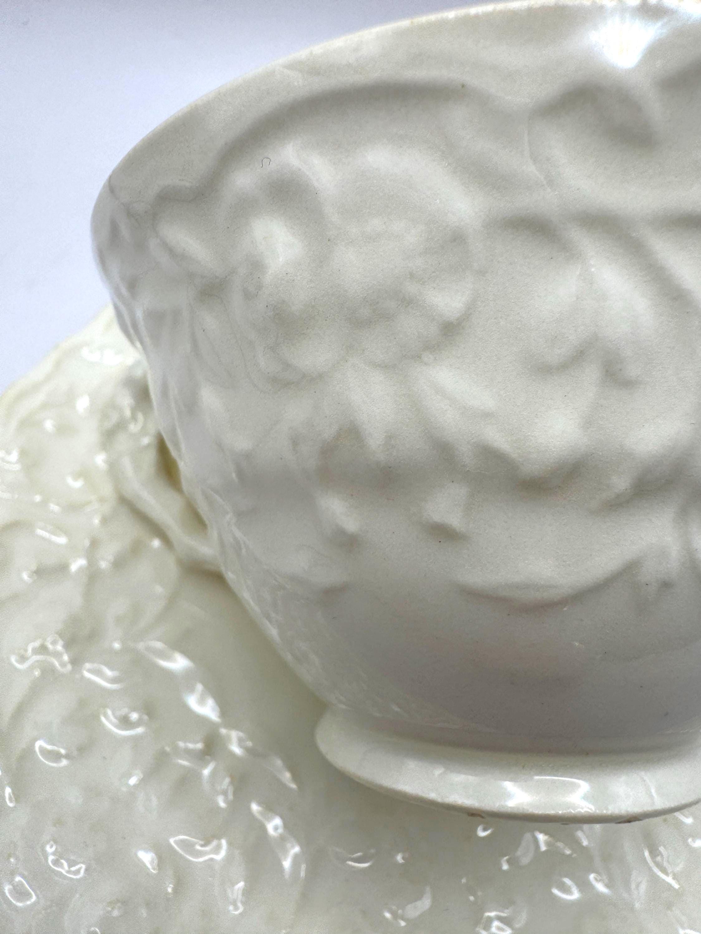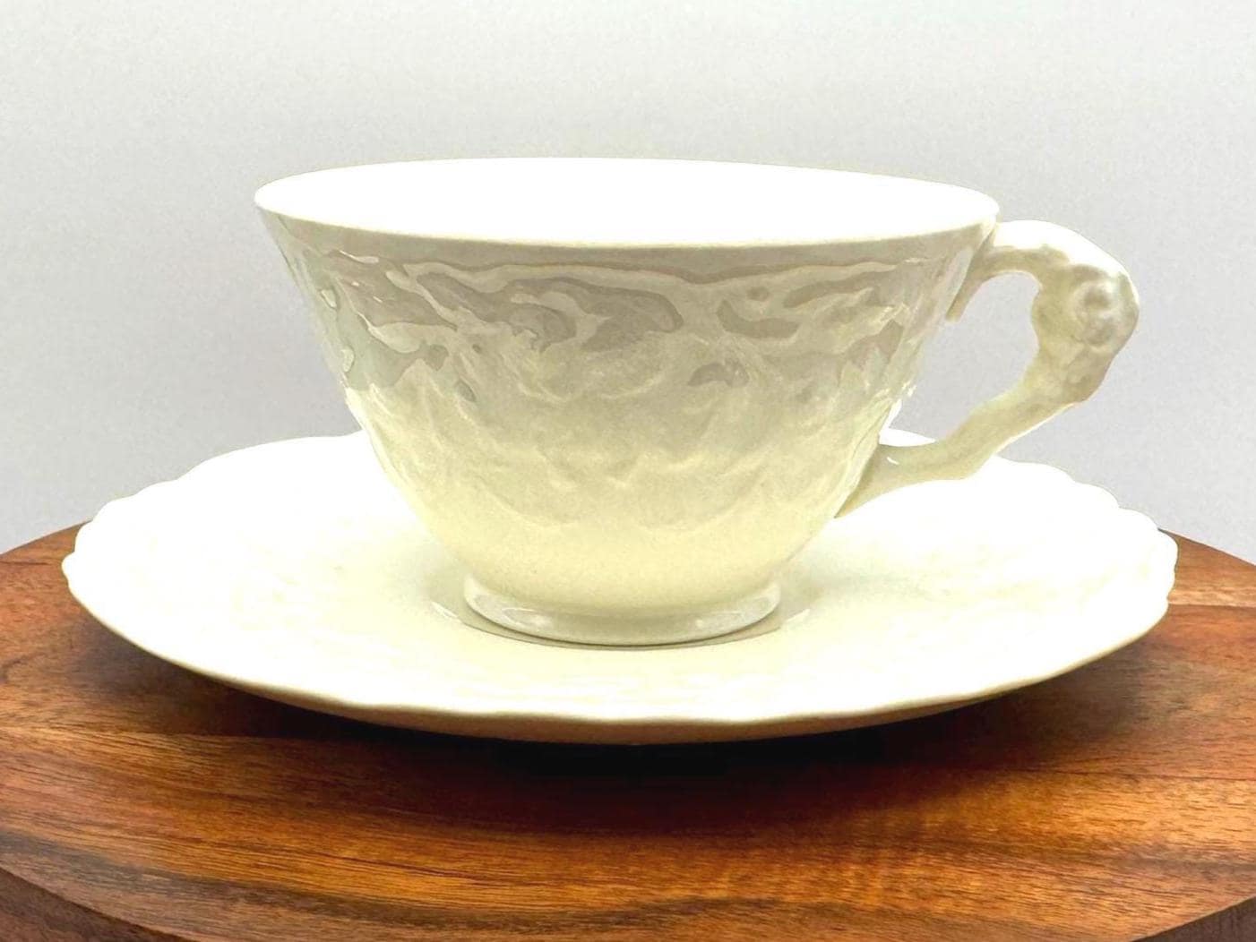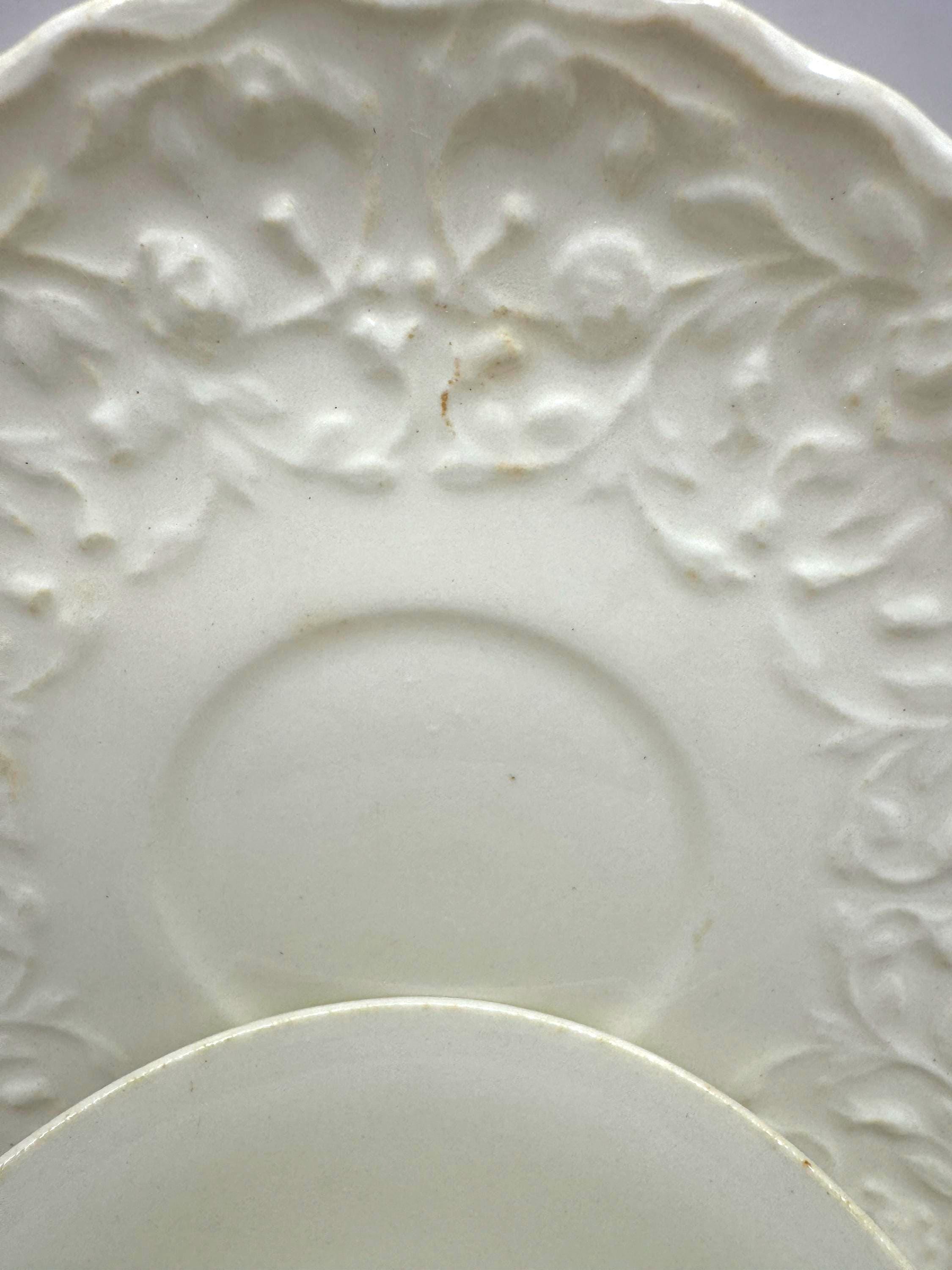 Classic vintage Pope-Gosser “Rose Point” cup and saucer set, made in the USA. This timeless pattern features elegant raised floral scrollwork in a soft ivory glaze, known for its romantic, traditional look and substantial feel.