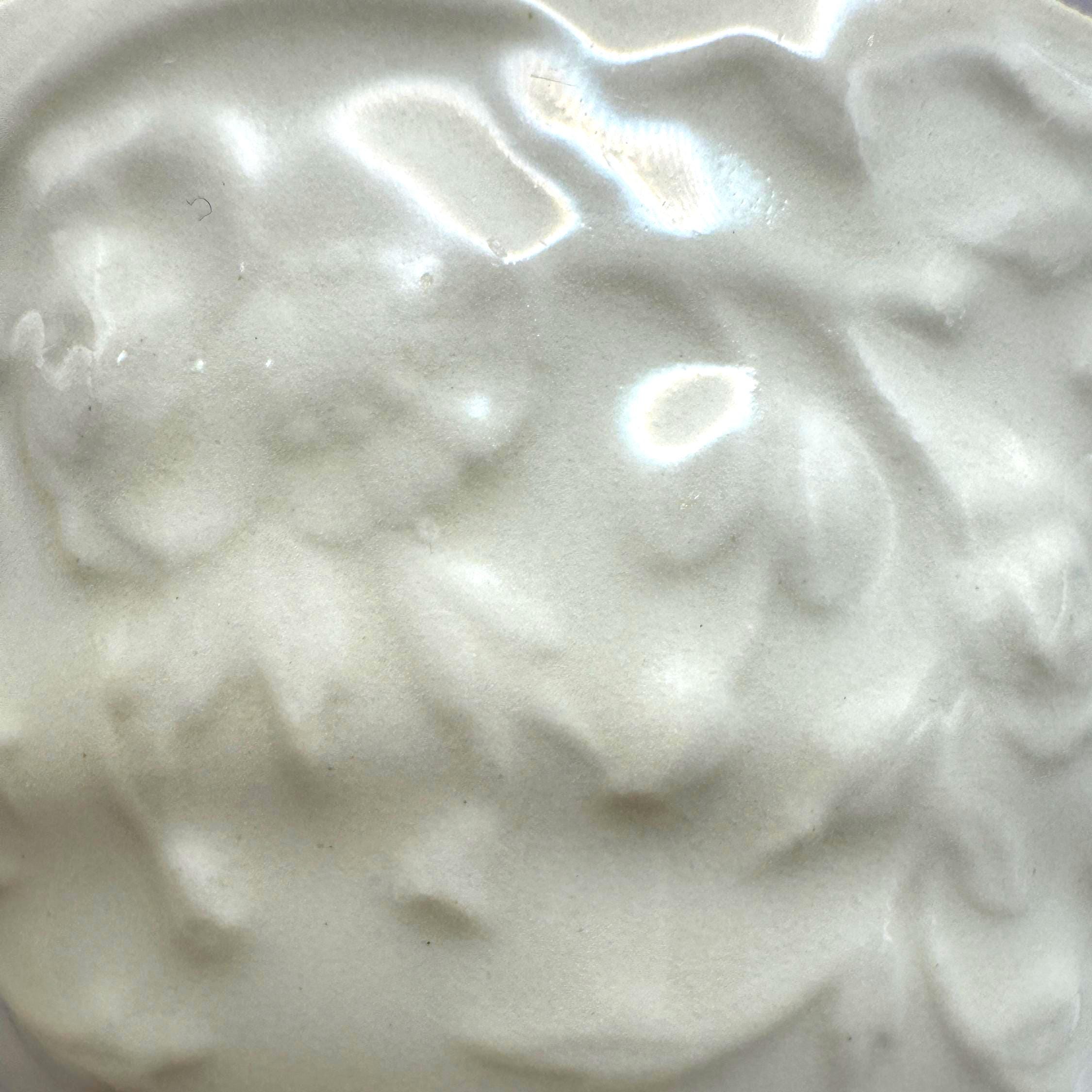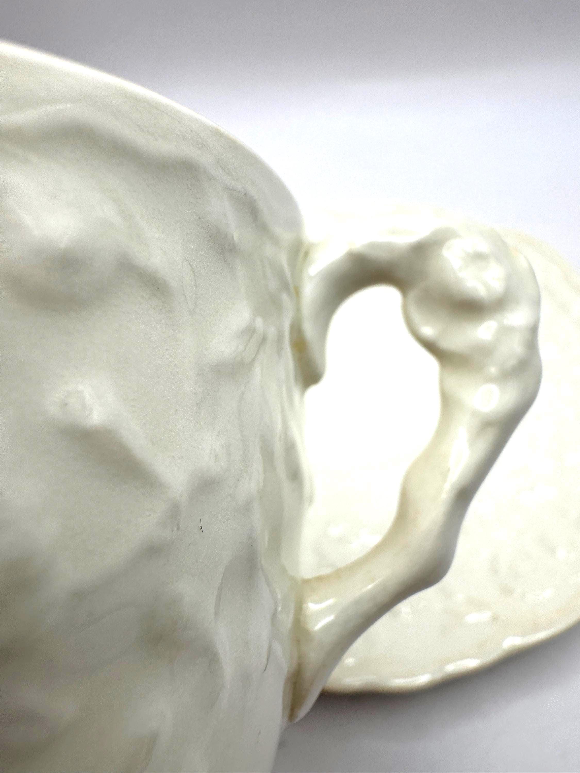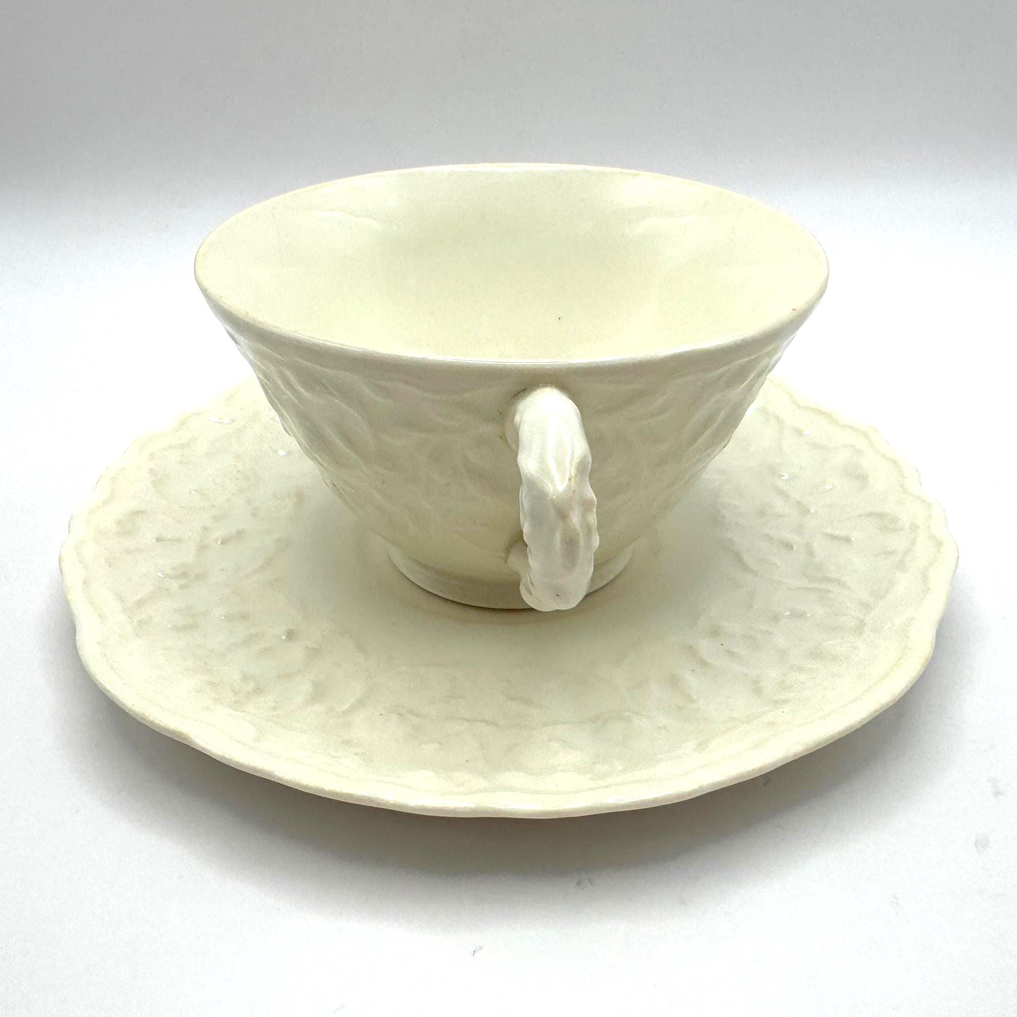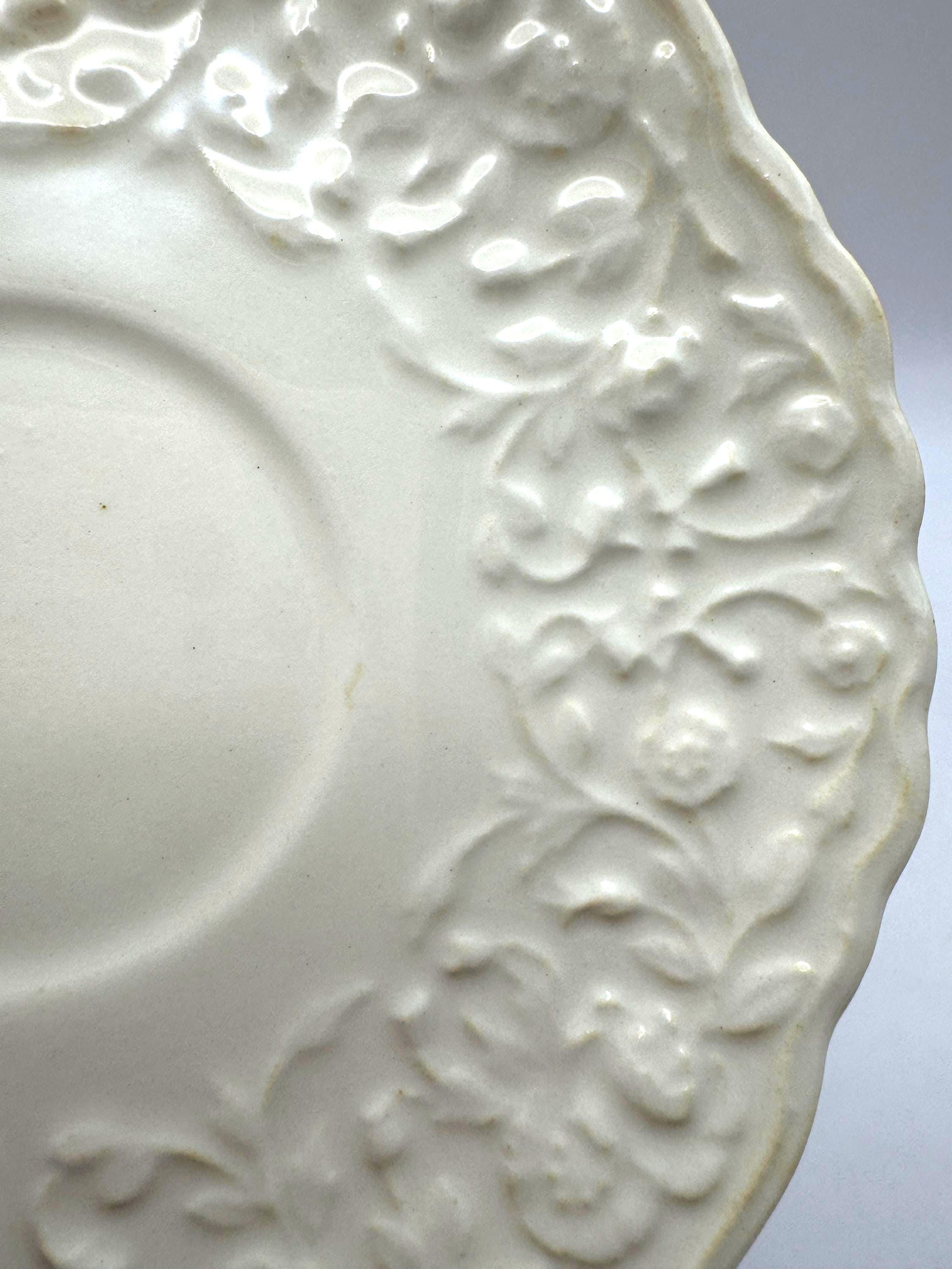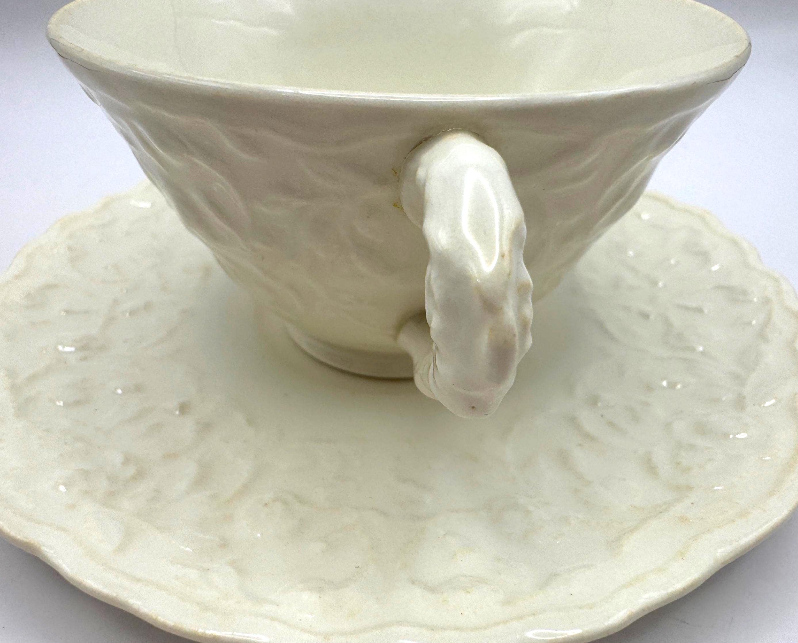Classic vintage Pope-Gosser “Rose Point” cup and saucer set, made in the USA. This timeless pattern features elegant raised floral scrollwork in a soft ivory glaze, known for its romantic, traditional look and substantial feel.
