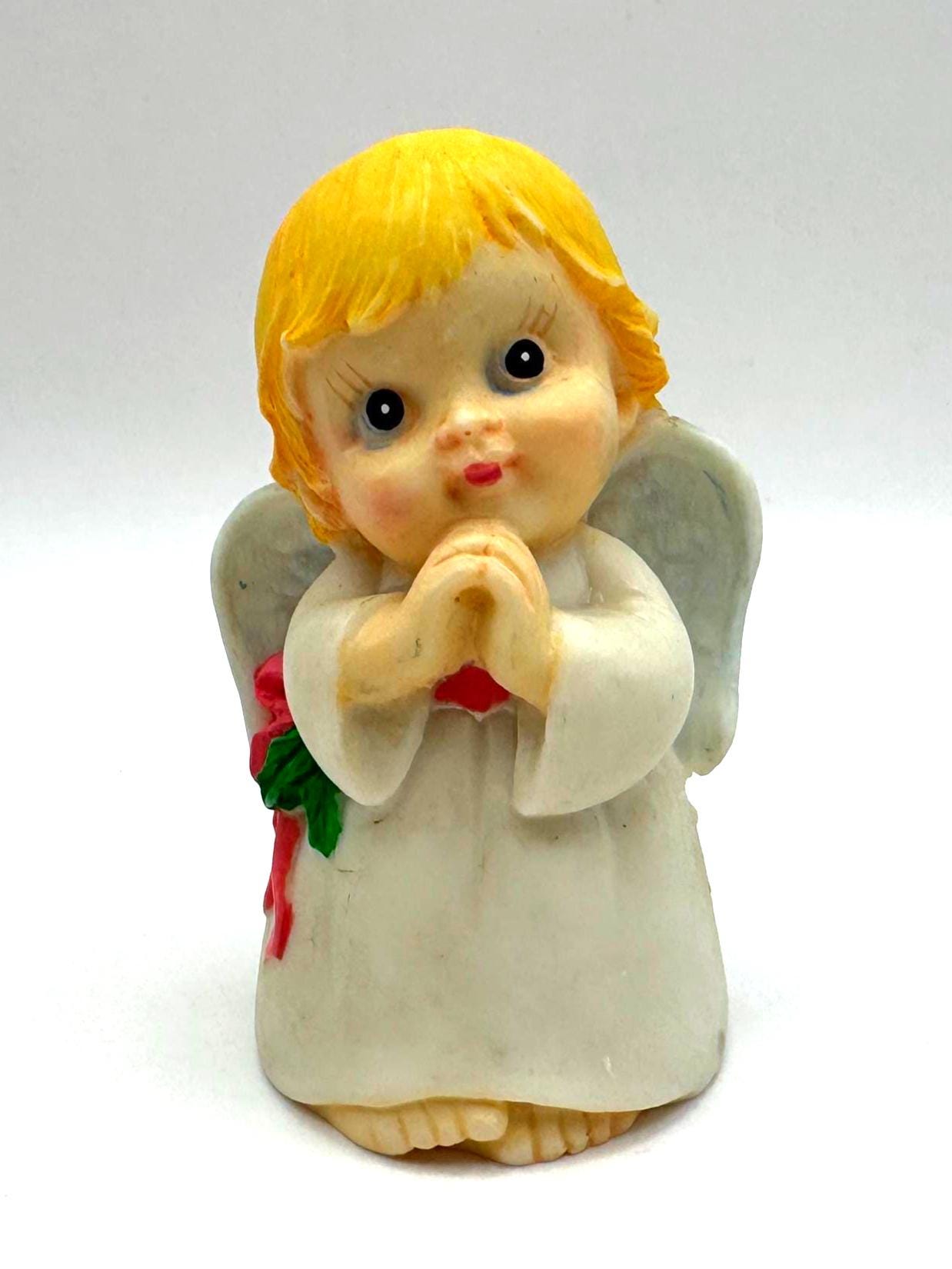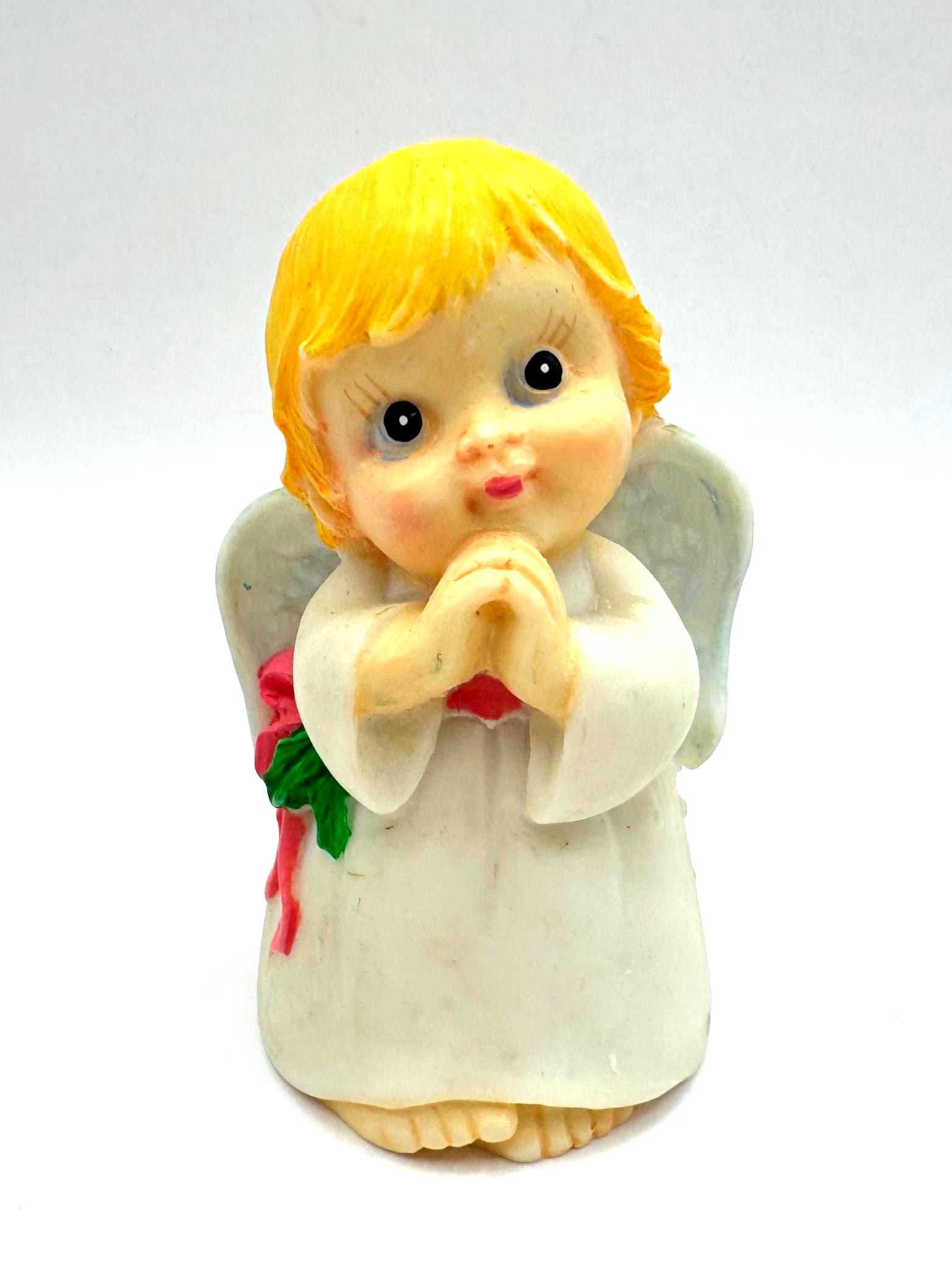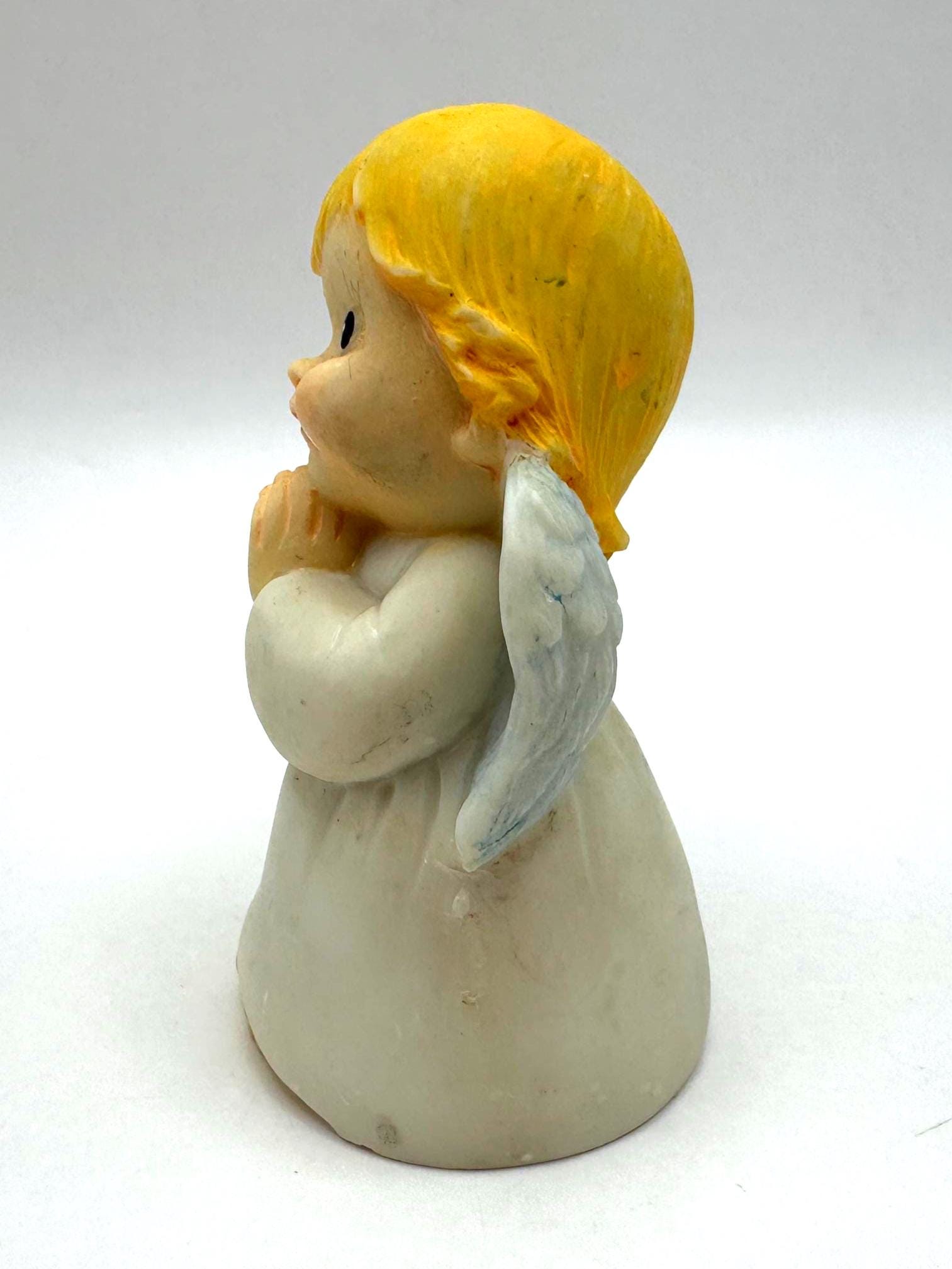 Sweet vintage praying angel figurine featuring soft hand-painted details, golden blond hair, pale blue wings, and a classic white robe. This charming angel has a gentle expression and traditional styling, making it a lovely decorative piece for a shelf, mantel, or seasonal display.