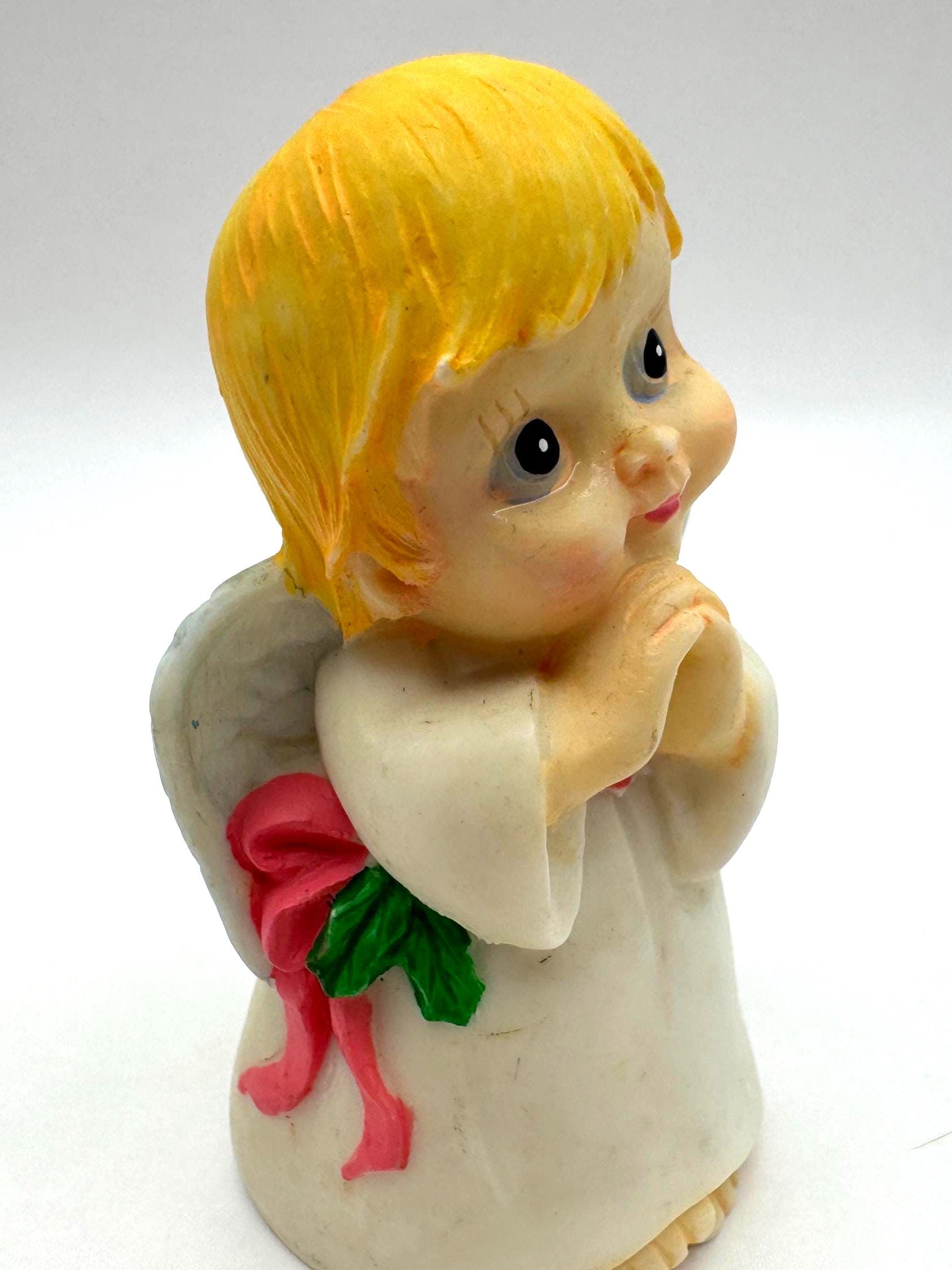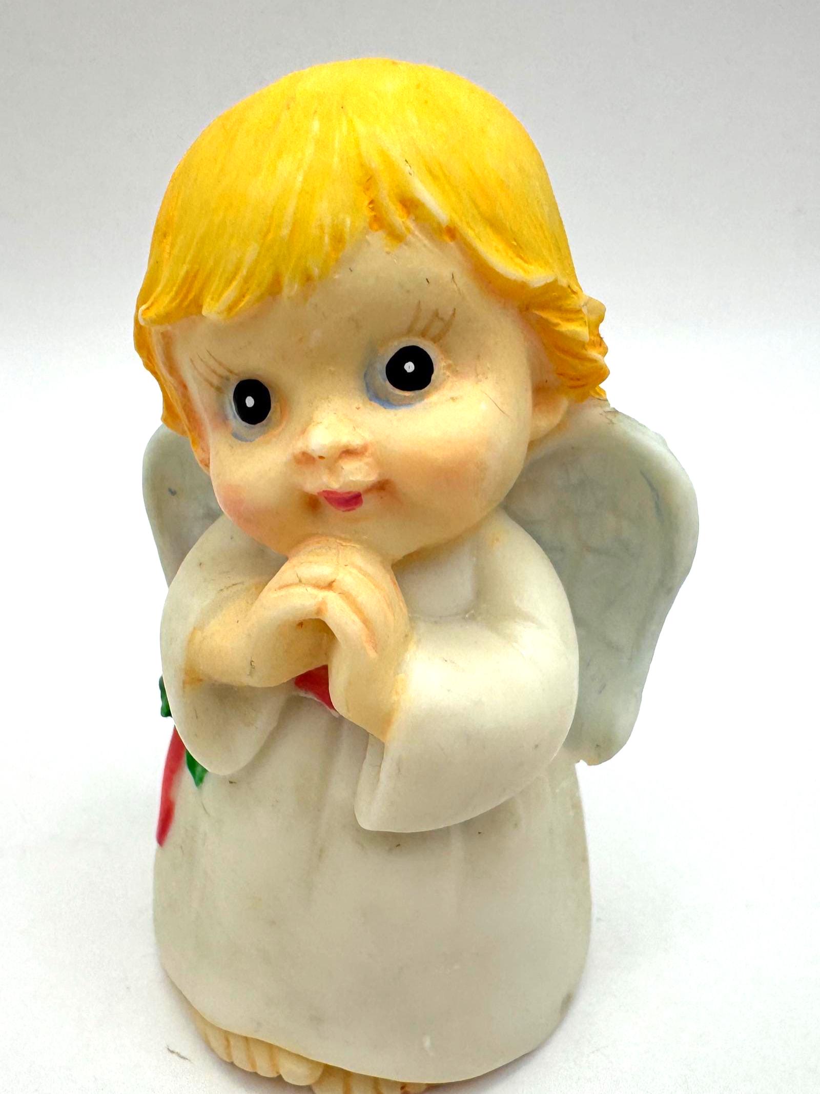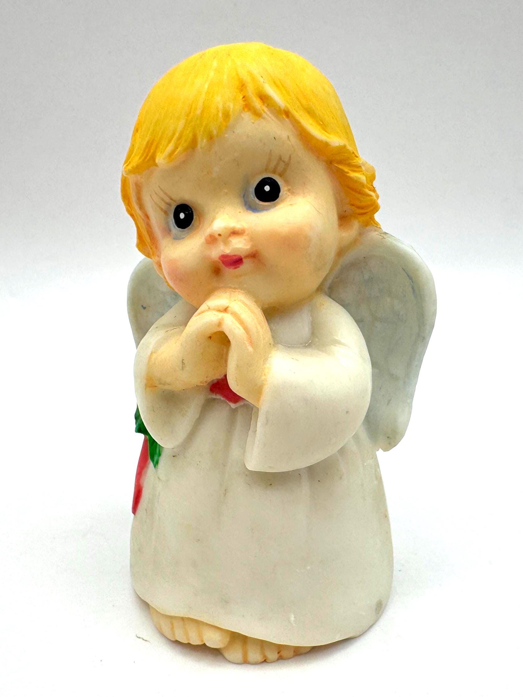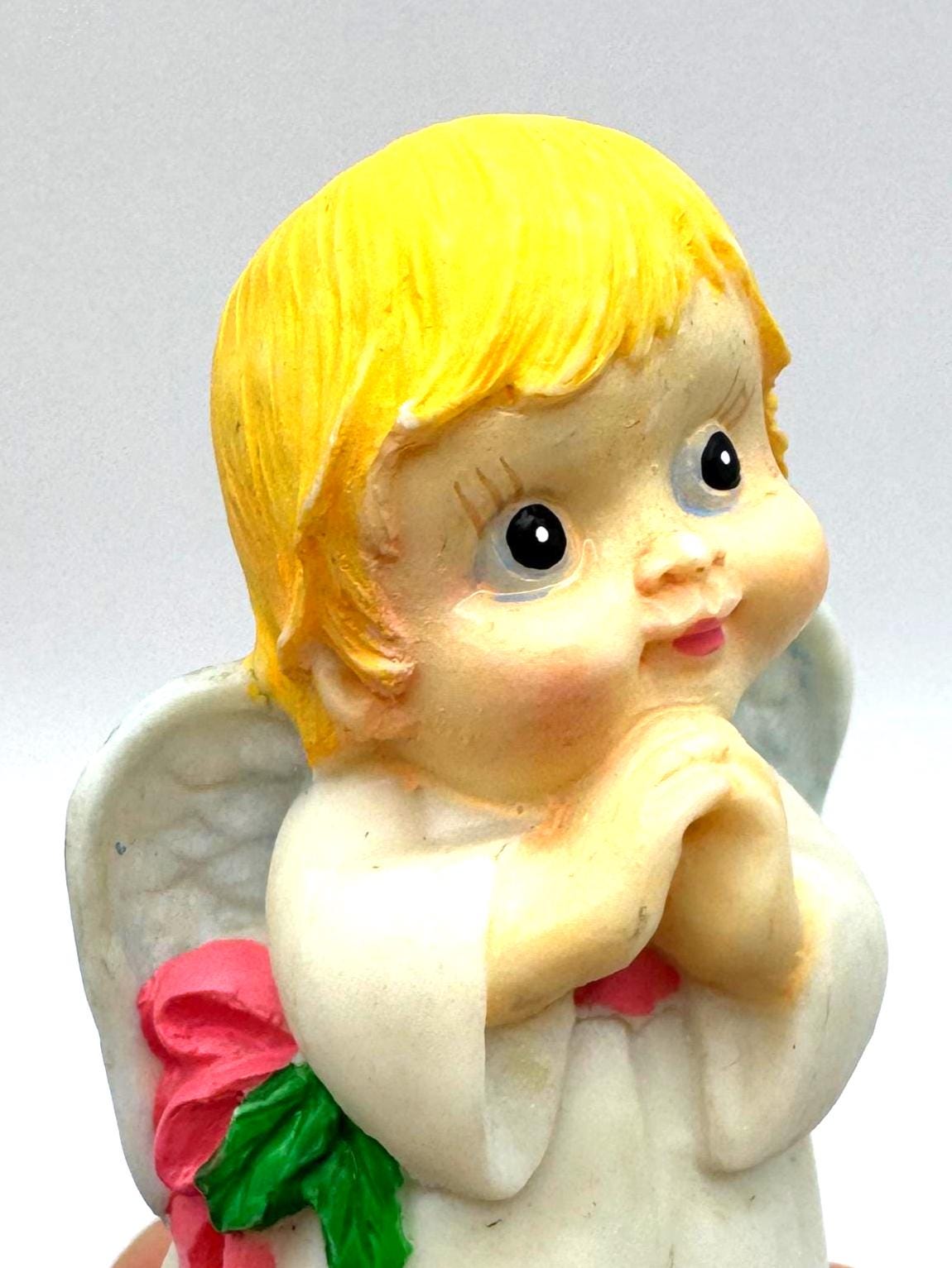 Sweet vintage praying angel figurine featuring soft hand-painted details, golden blond hair, pale blue wings, and a classic white robe. This charming angel has a gentle expression and traditional styling, making it a lovely decorative piece for a shelf, mantel, or seasonal display.