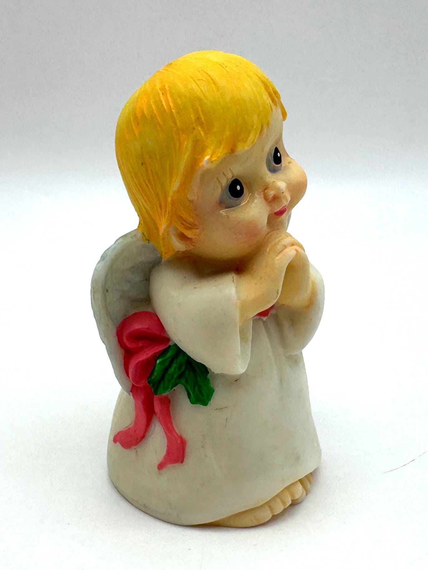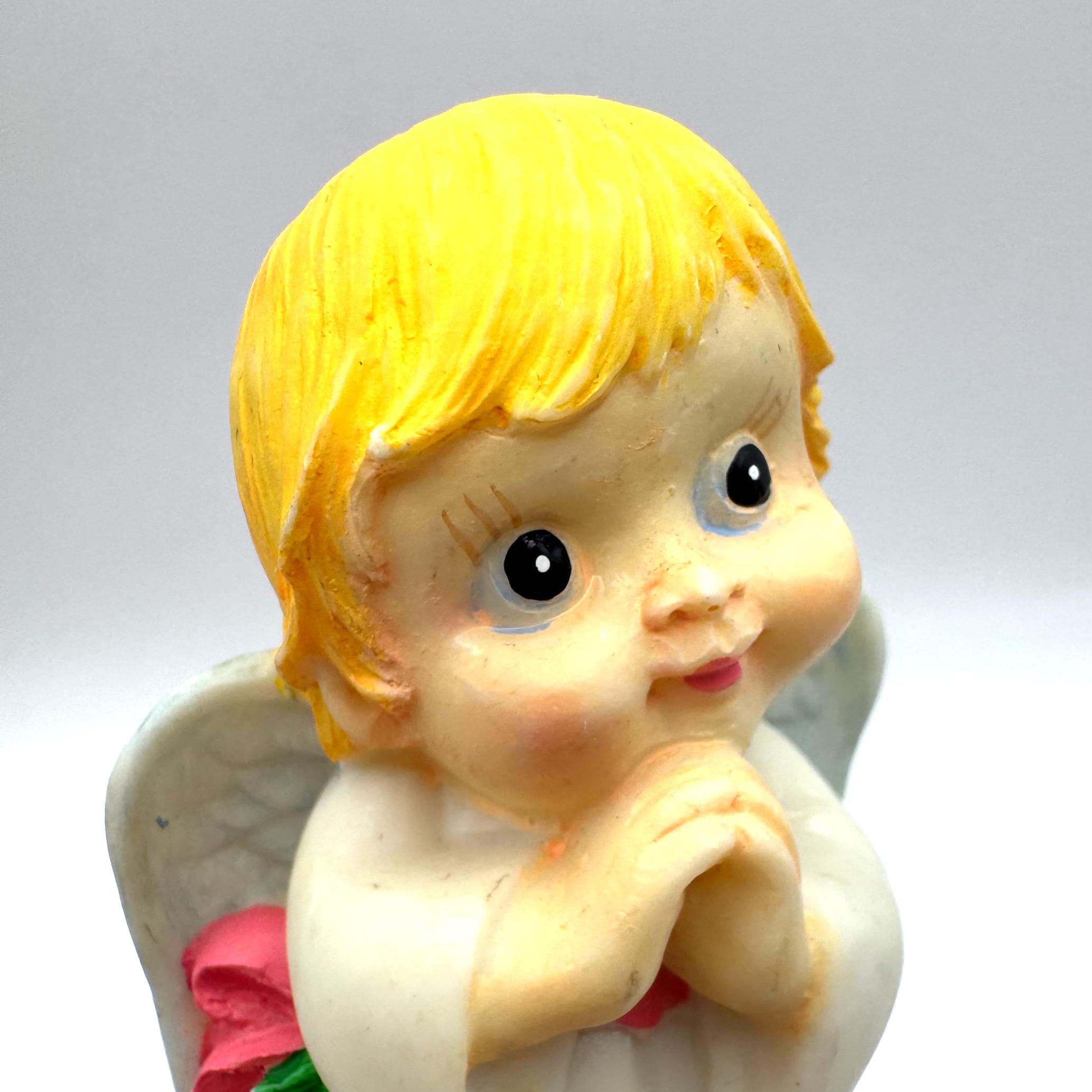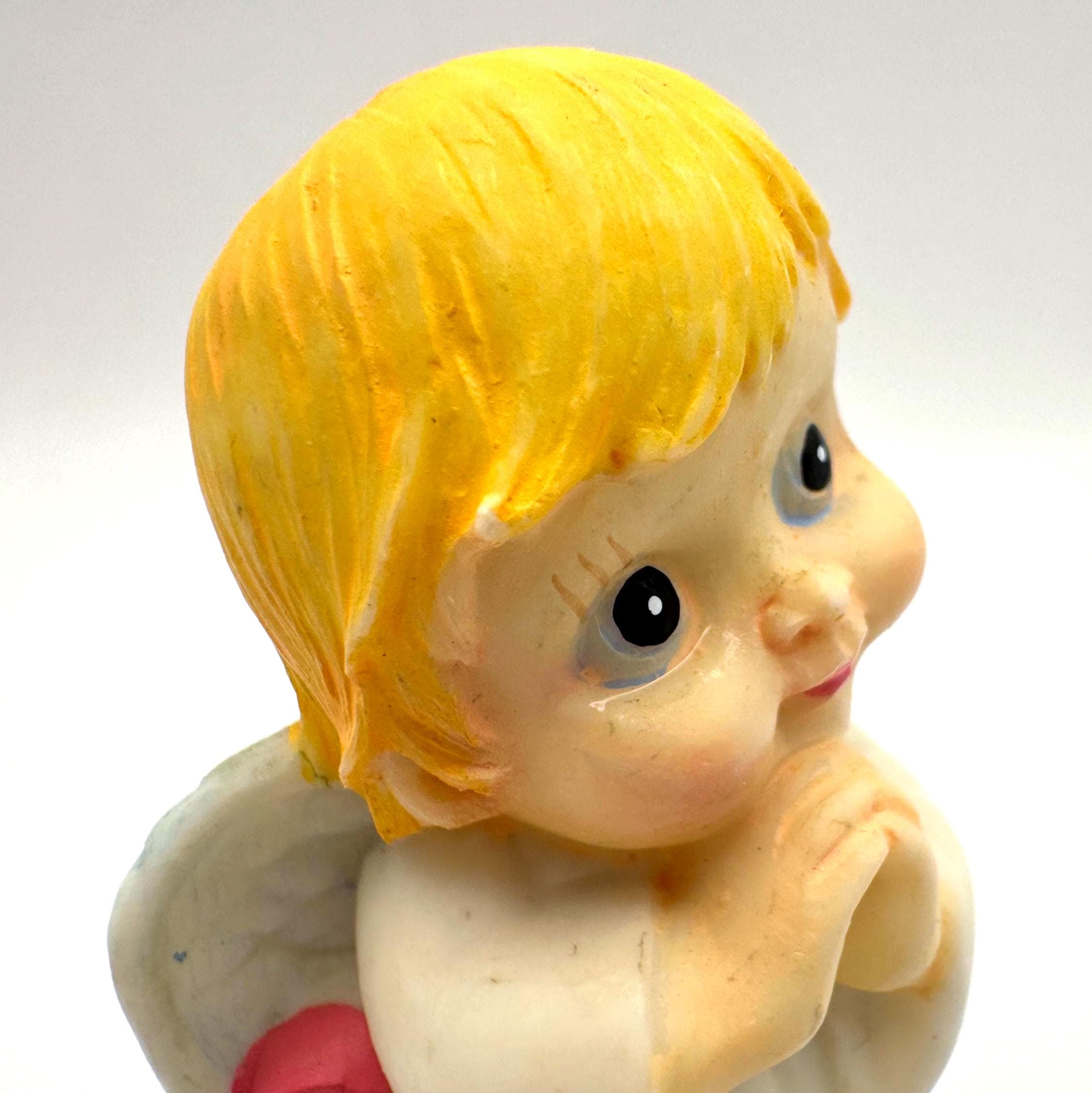 Made of resin with hand-painted accents, this piece dates to the late 20th century and was commonly sold as giftware or holiday décor. A timeless angel design that works beautifully for Christmas, Easter, or year-round inspiration.