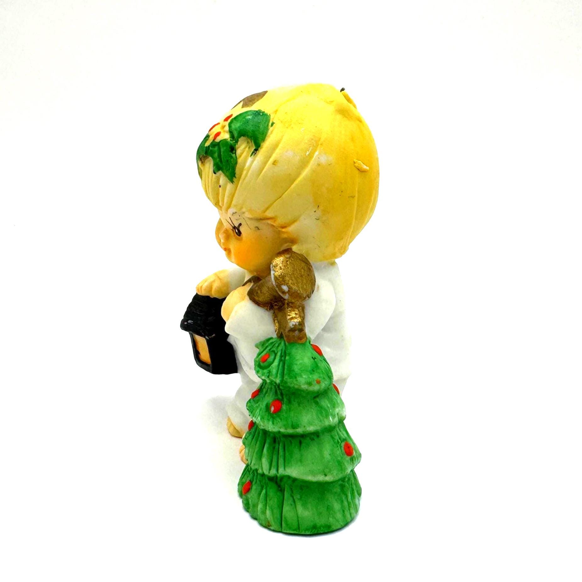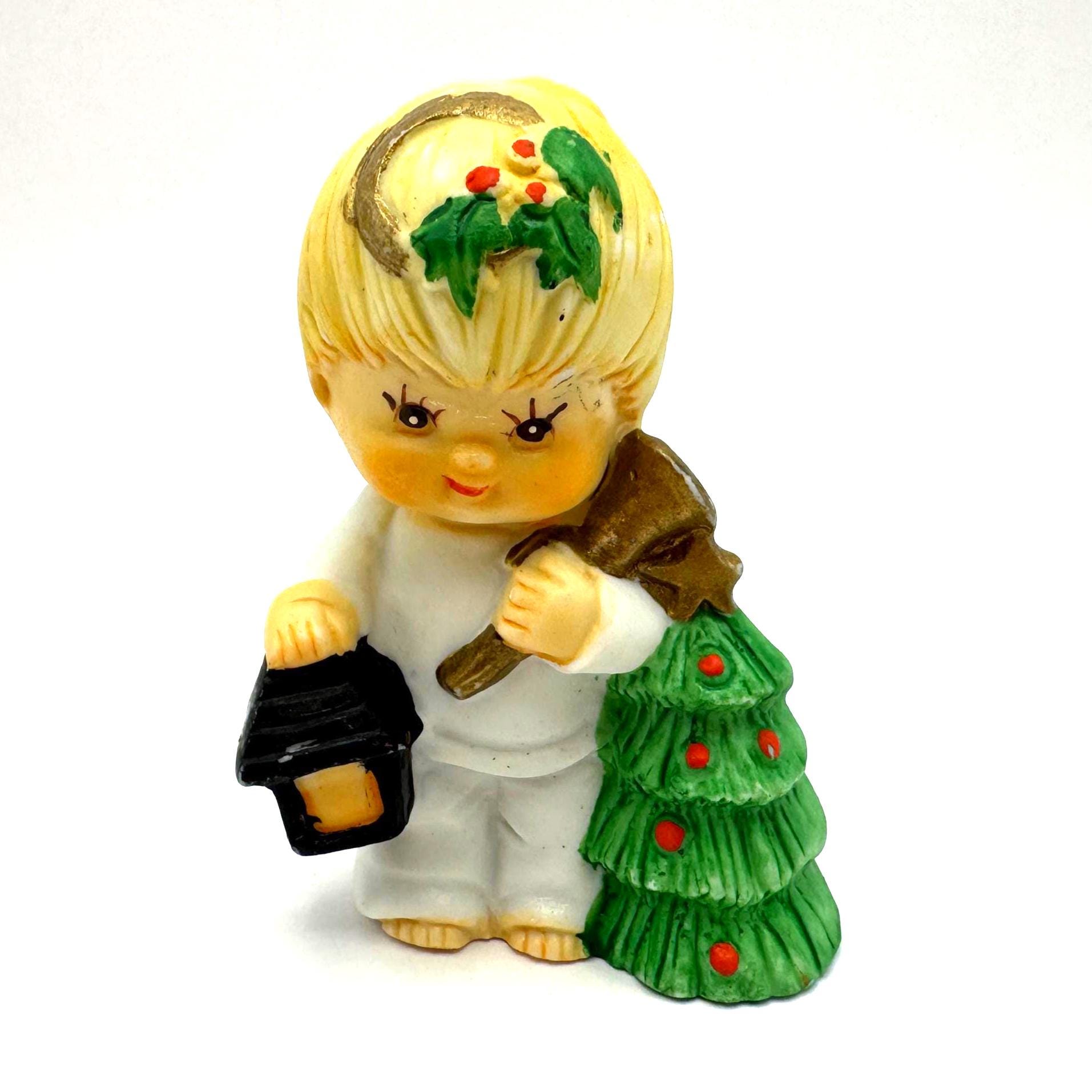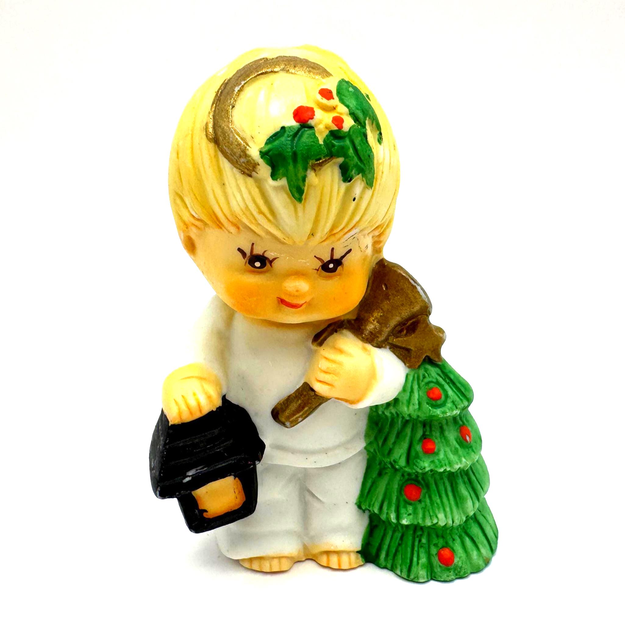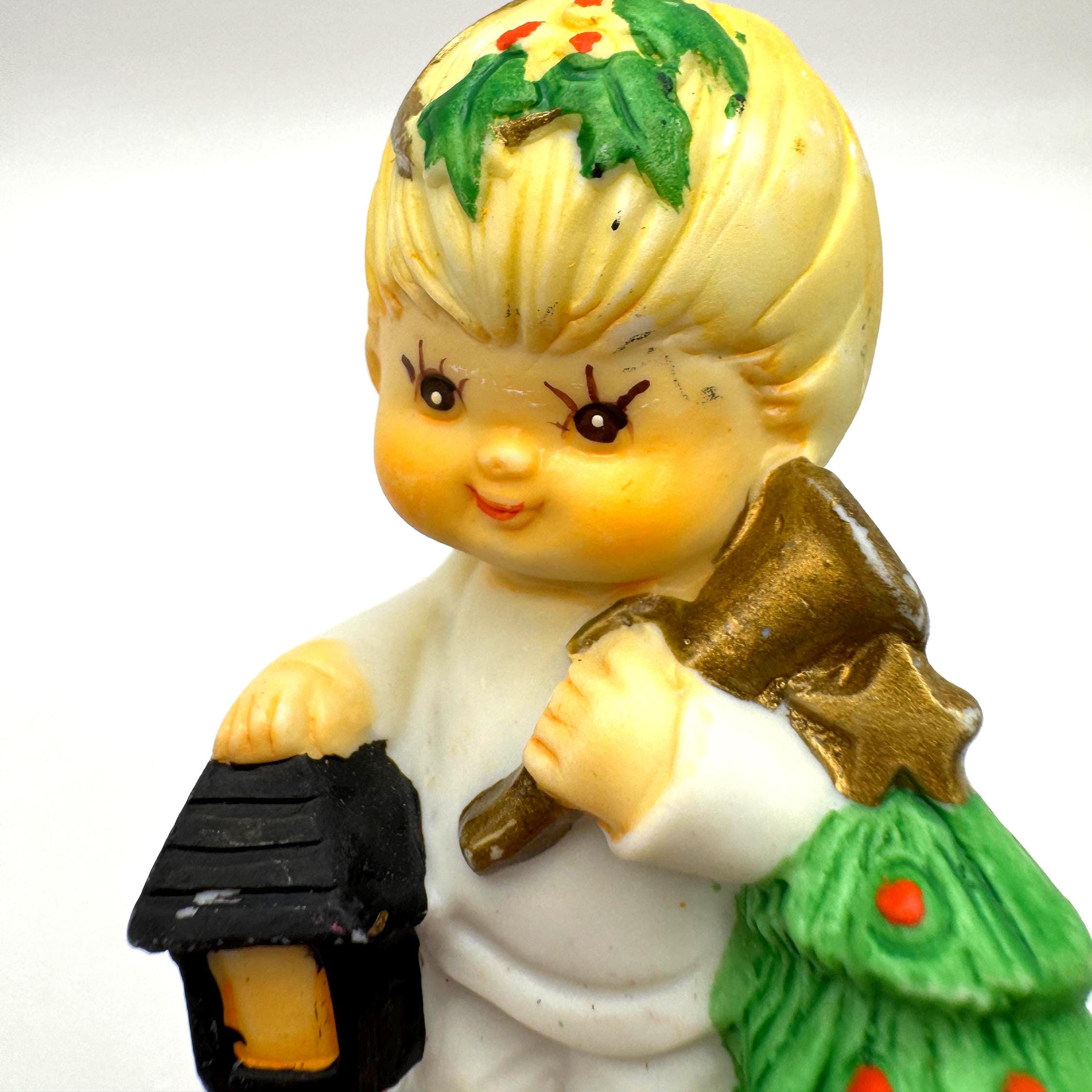 Charming vintage Christmas child figurine featuring a blond child dressed in white, holding a lantern and a small decorated evergreen tree. This piece has a sweet, nostalgic holiday look with soft colors and hand-painted details.