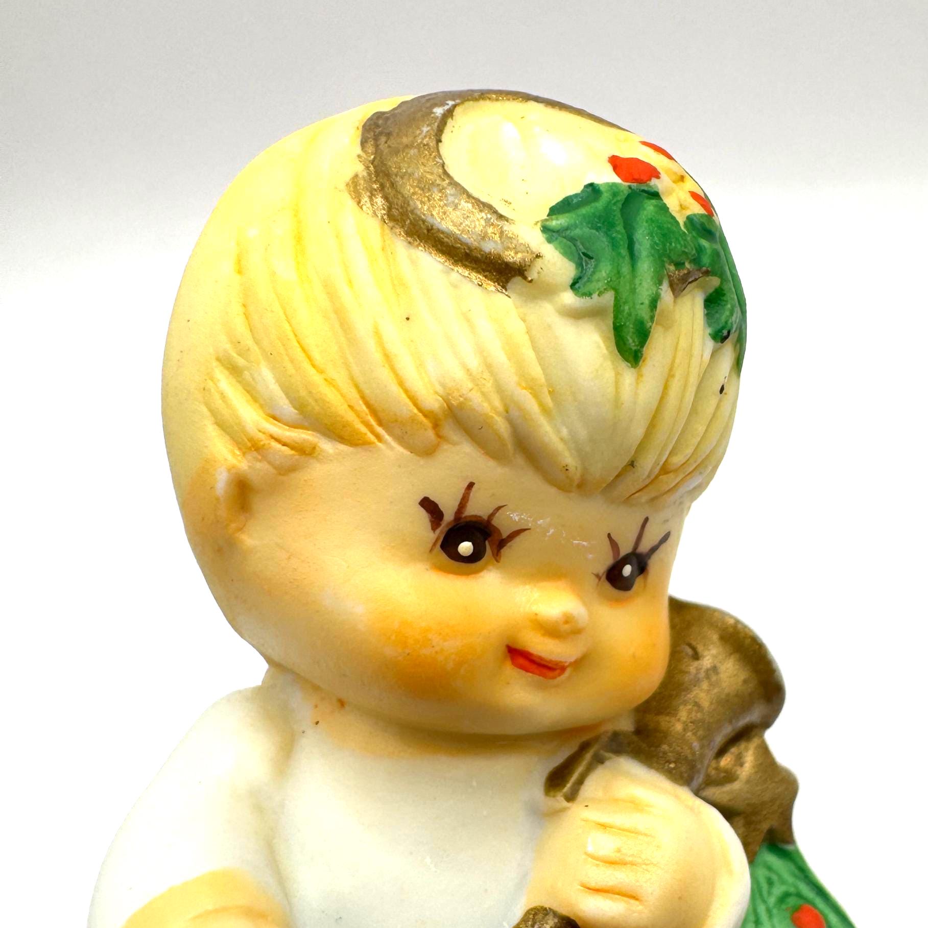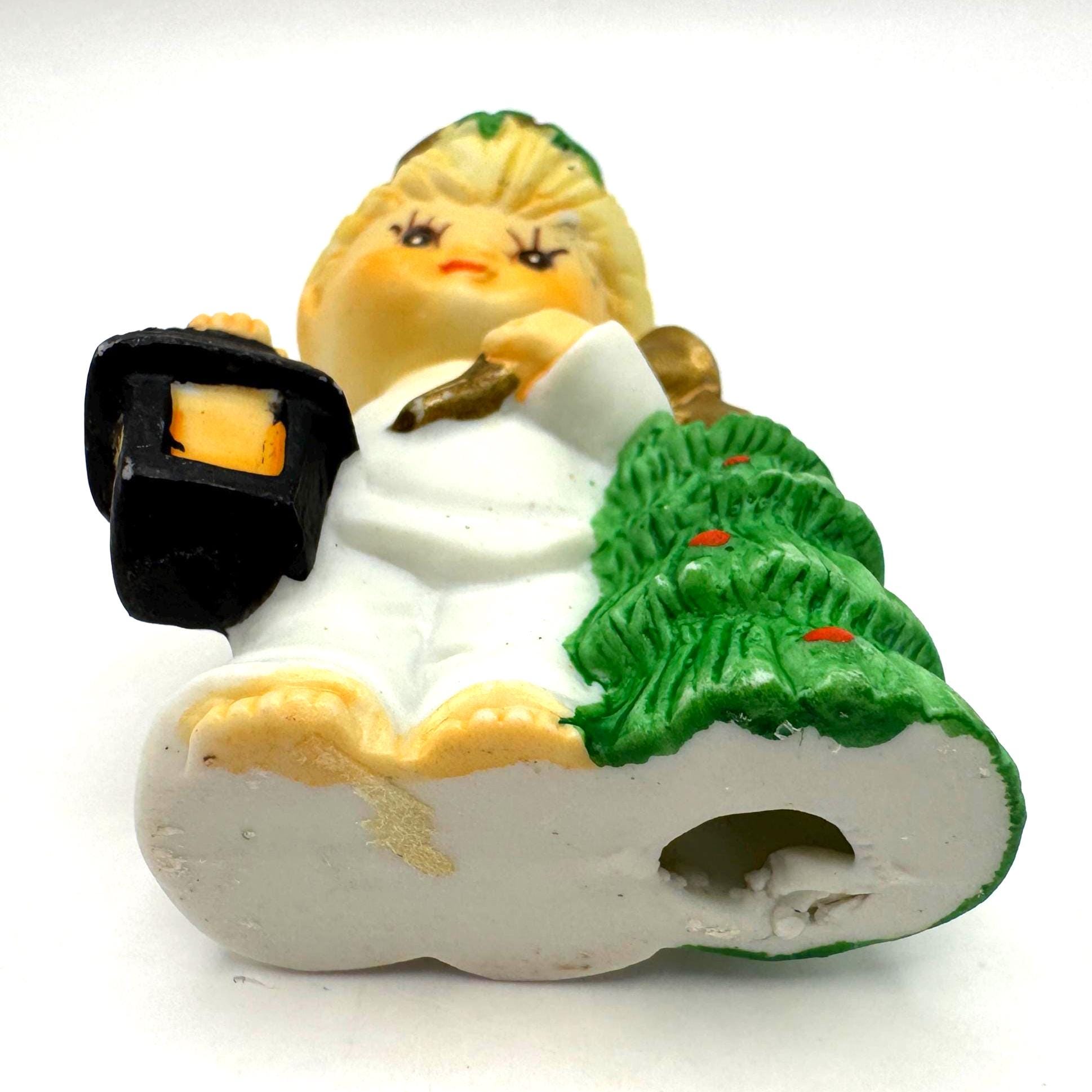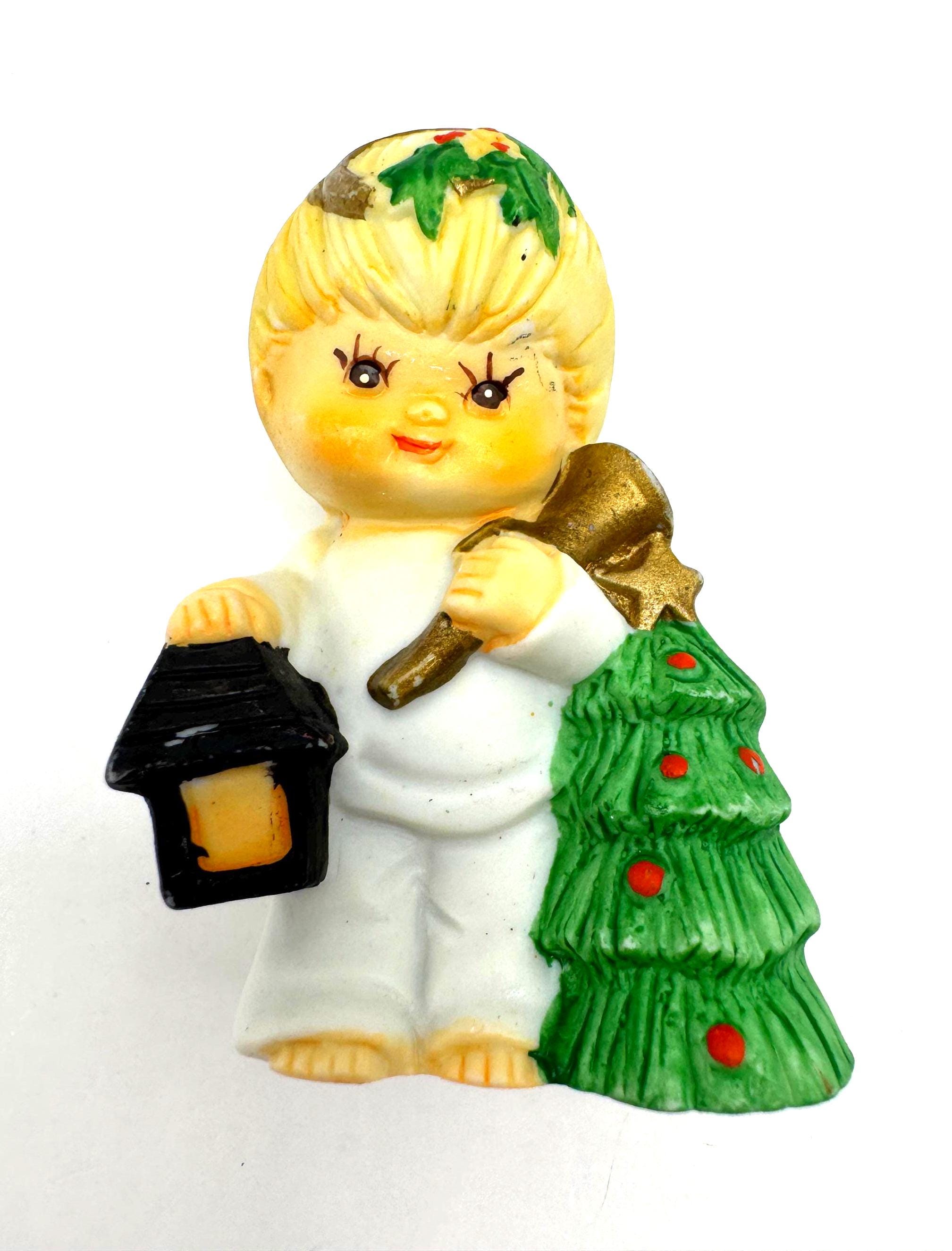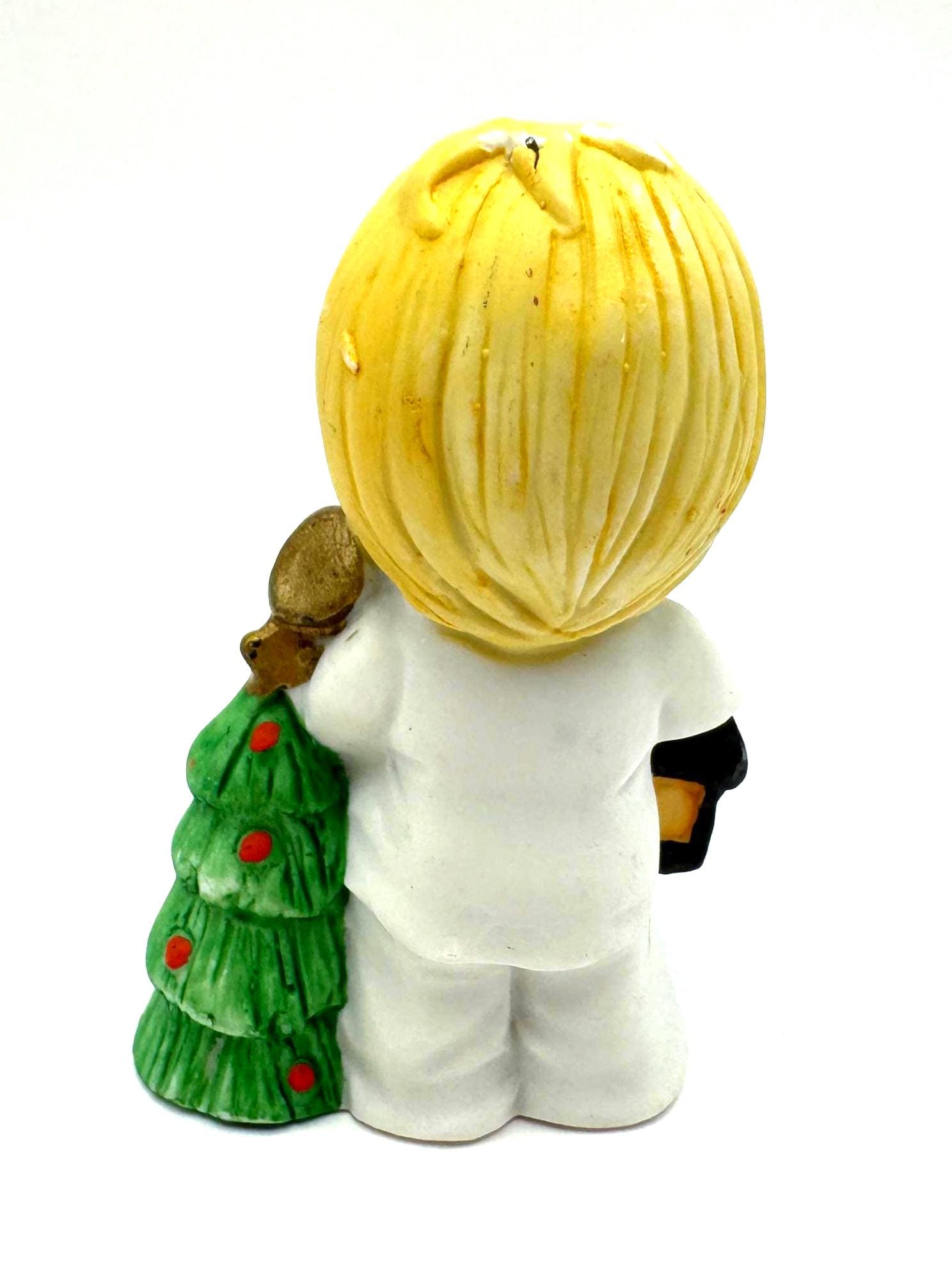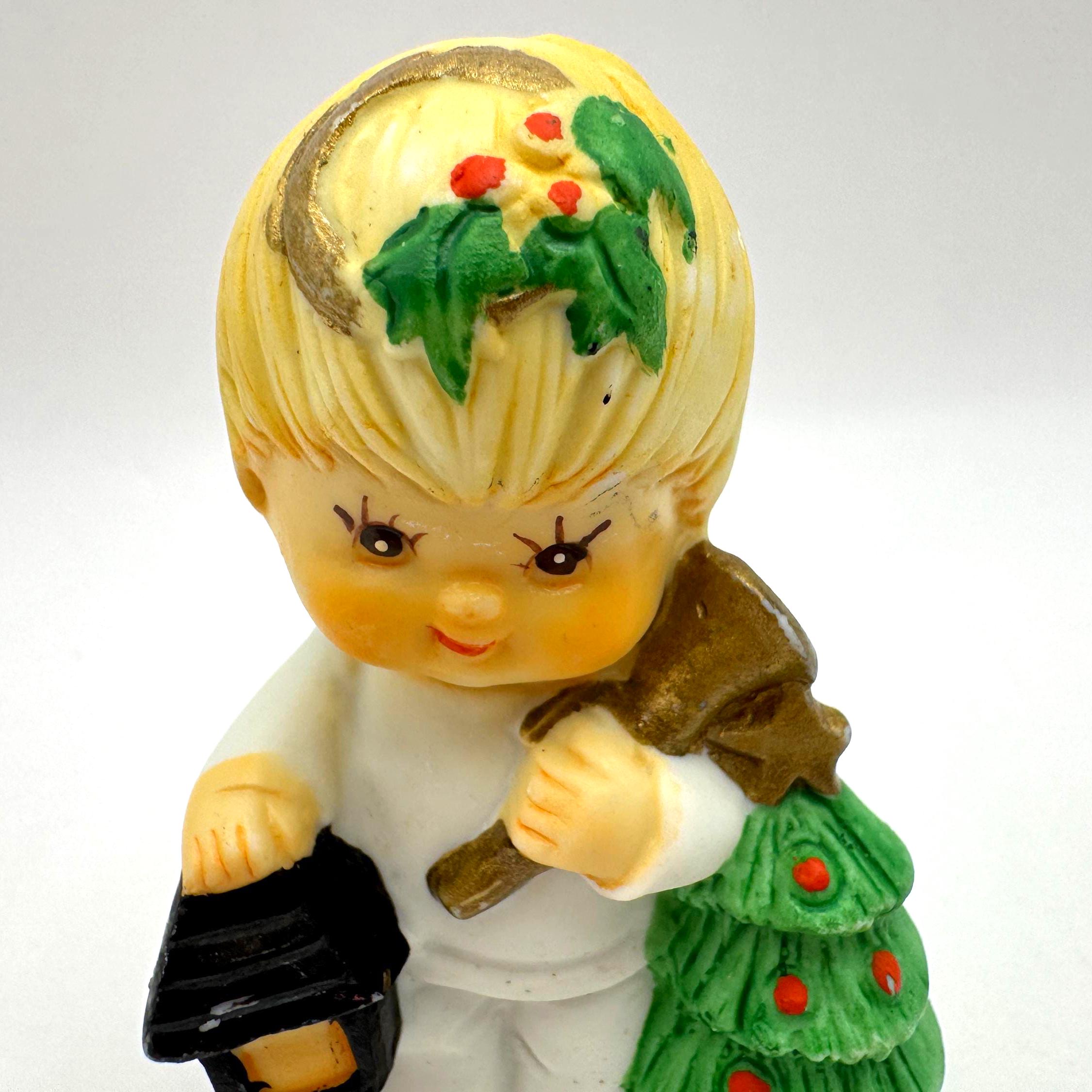 Charming vintage Christmas child figurine featuring a blond child dressed in white, holding a lantern and a small decorated evergreen tree. This piece has a sweet, nostalgic holiday look with soft colors and hand-painted details.