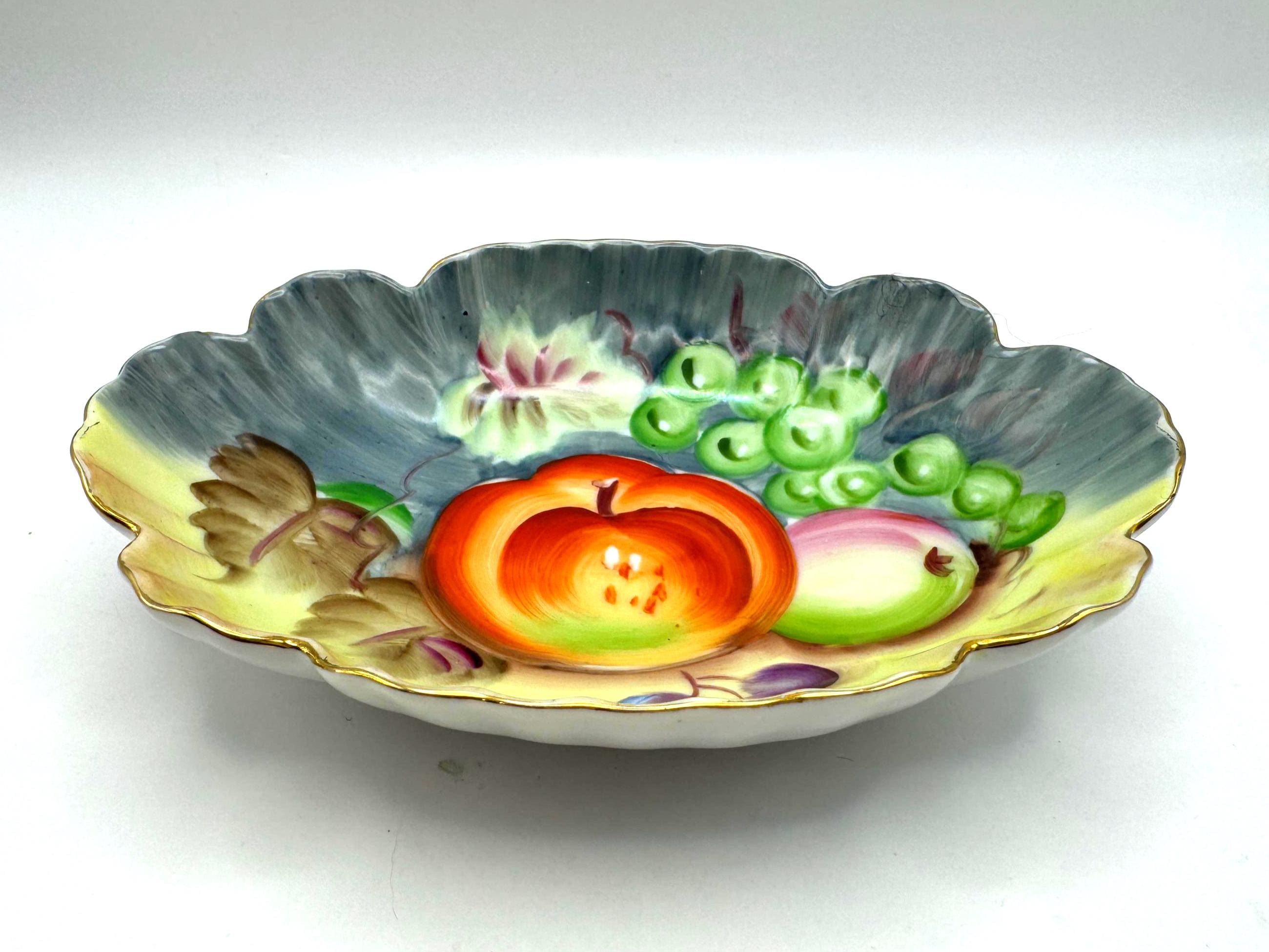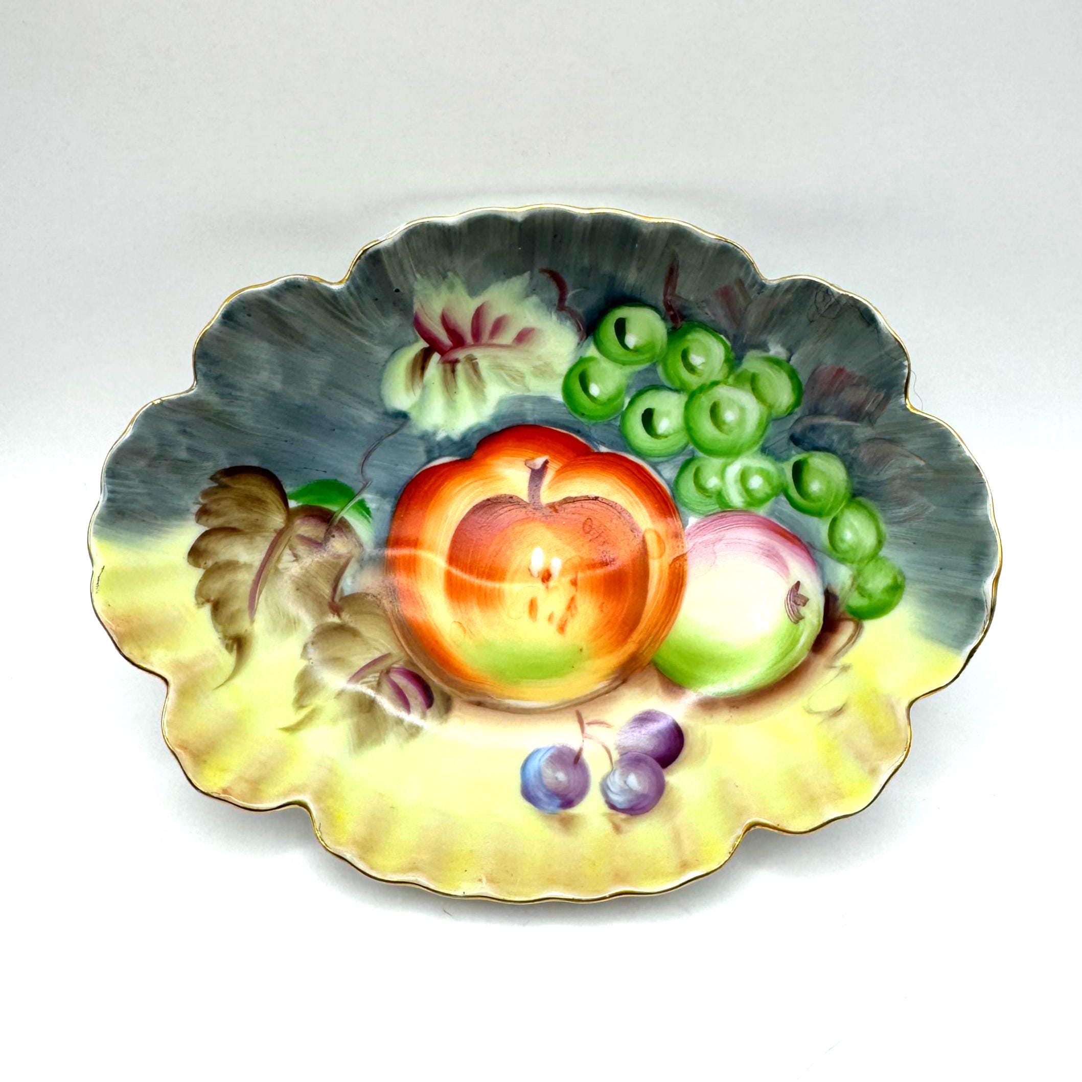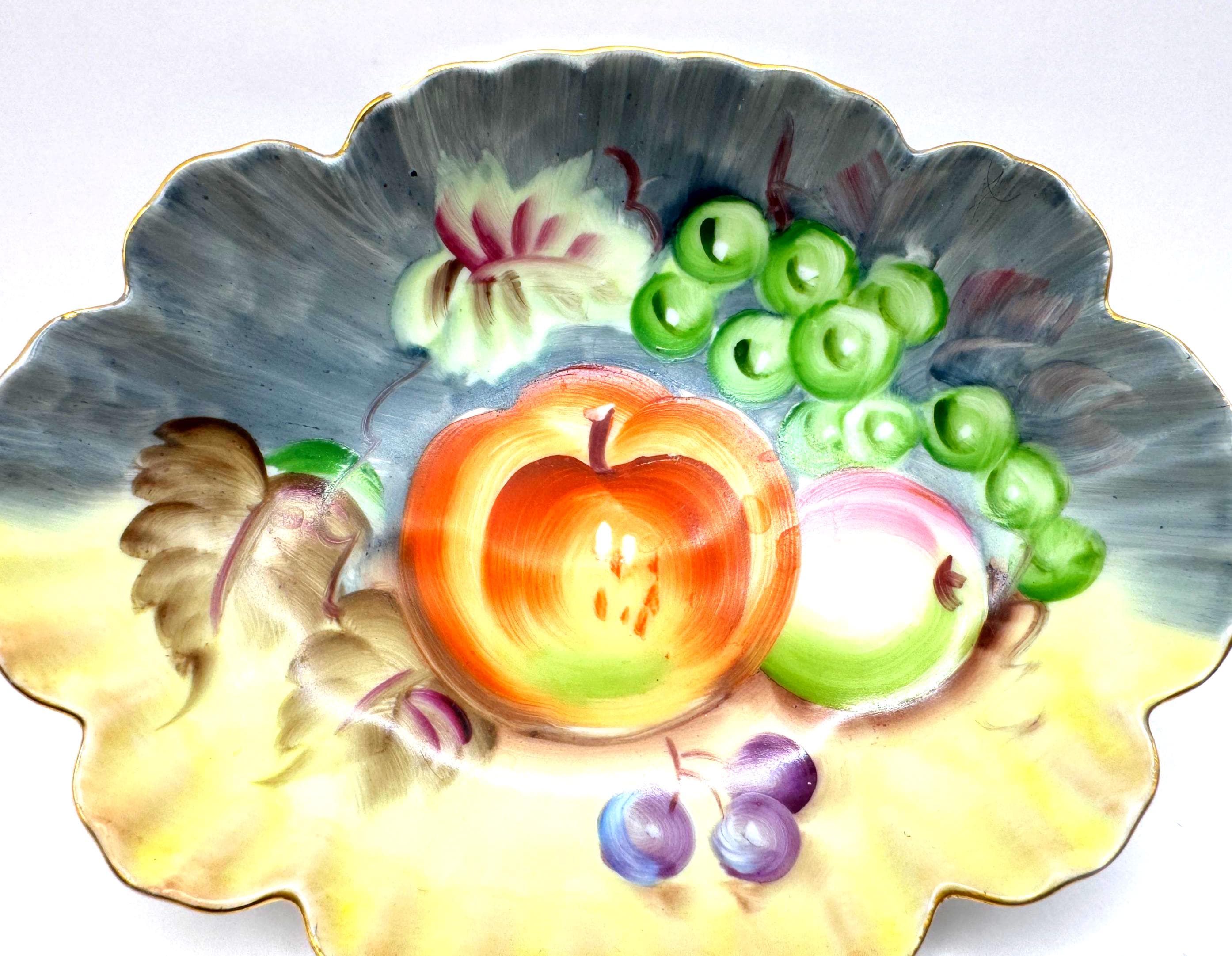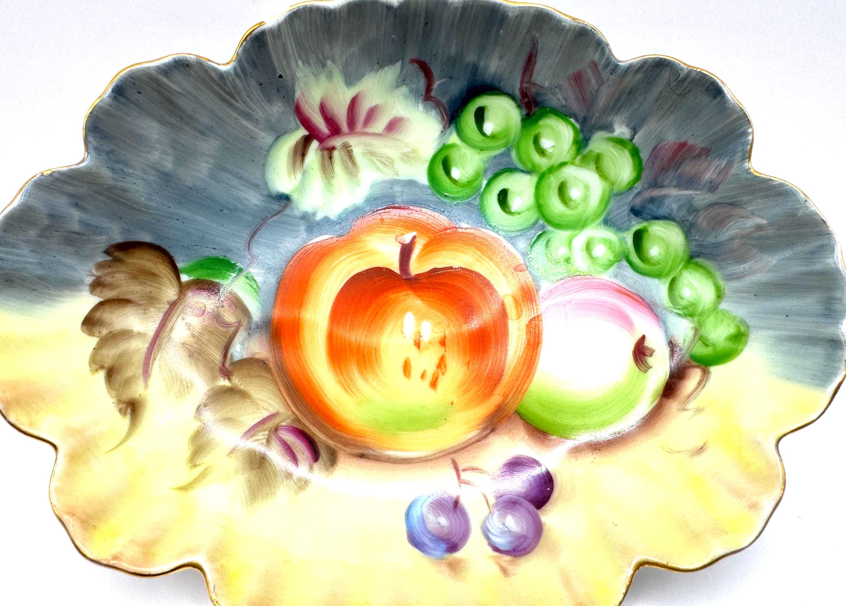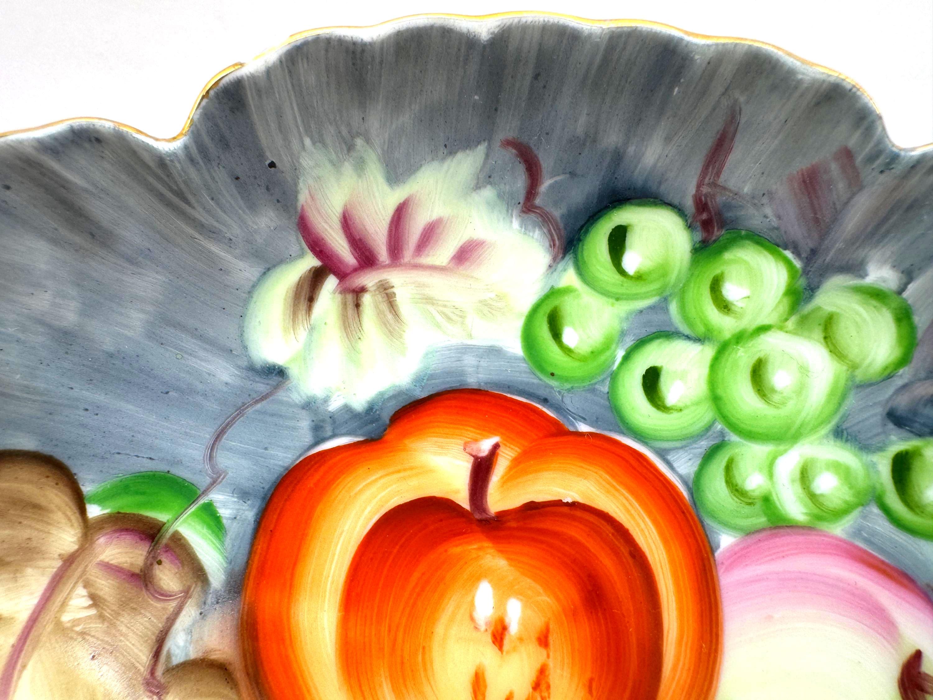 Lovely vintage Lefton porcelain dish, featuring a beautifully hand-painted fruit design with apples, grapes, and cherries set against a softly shaded background. The dish has an elegant scalloped edge accented with delicate gold trim.