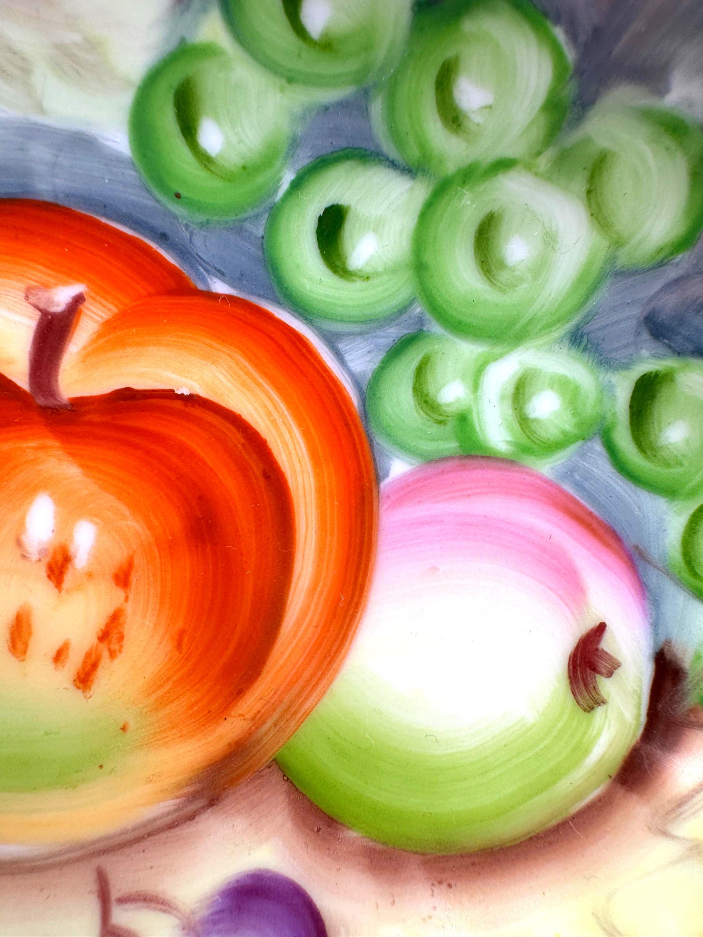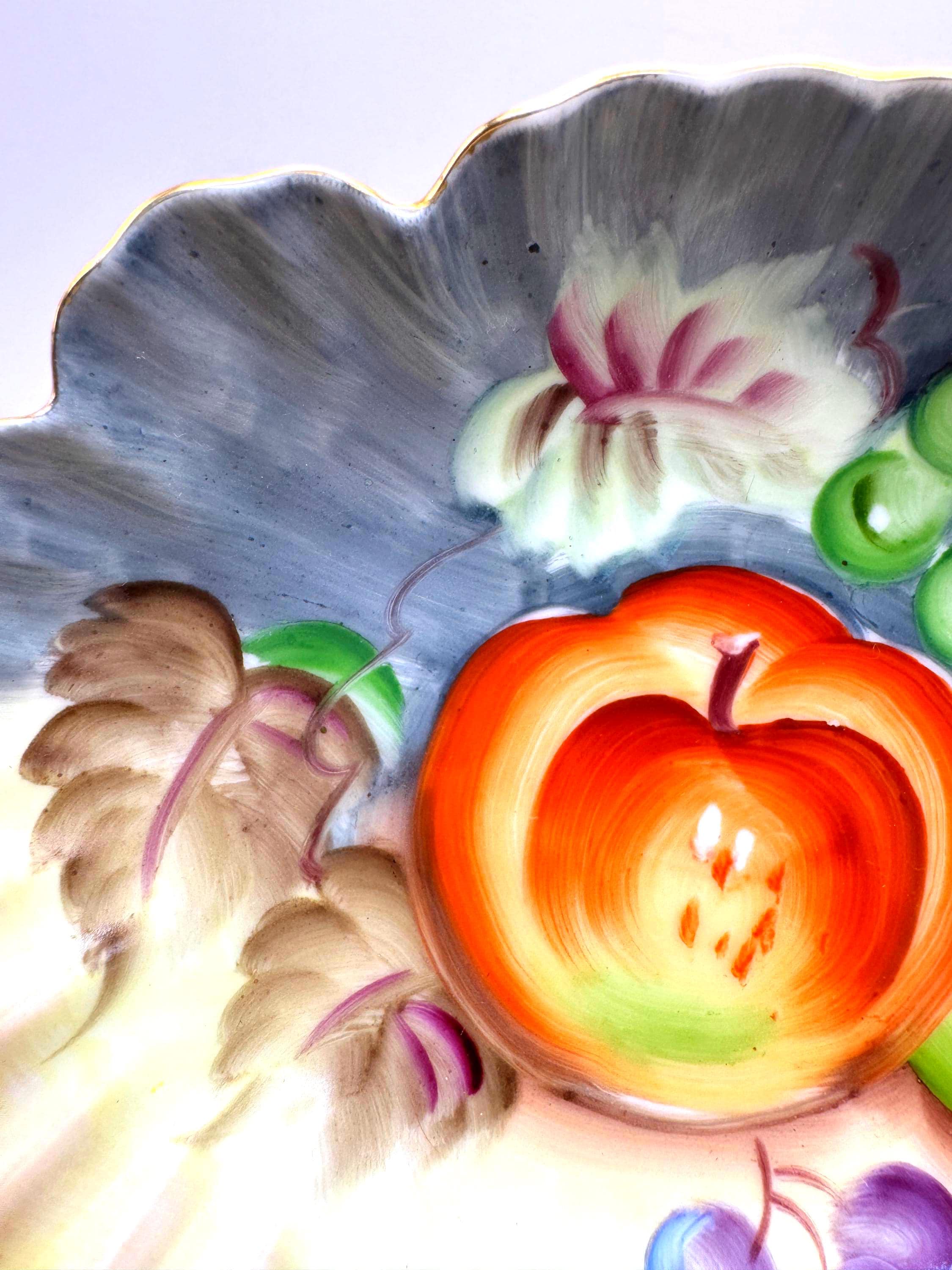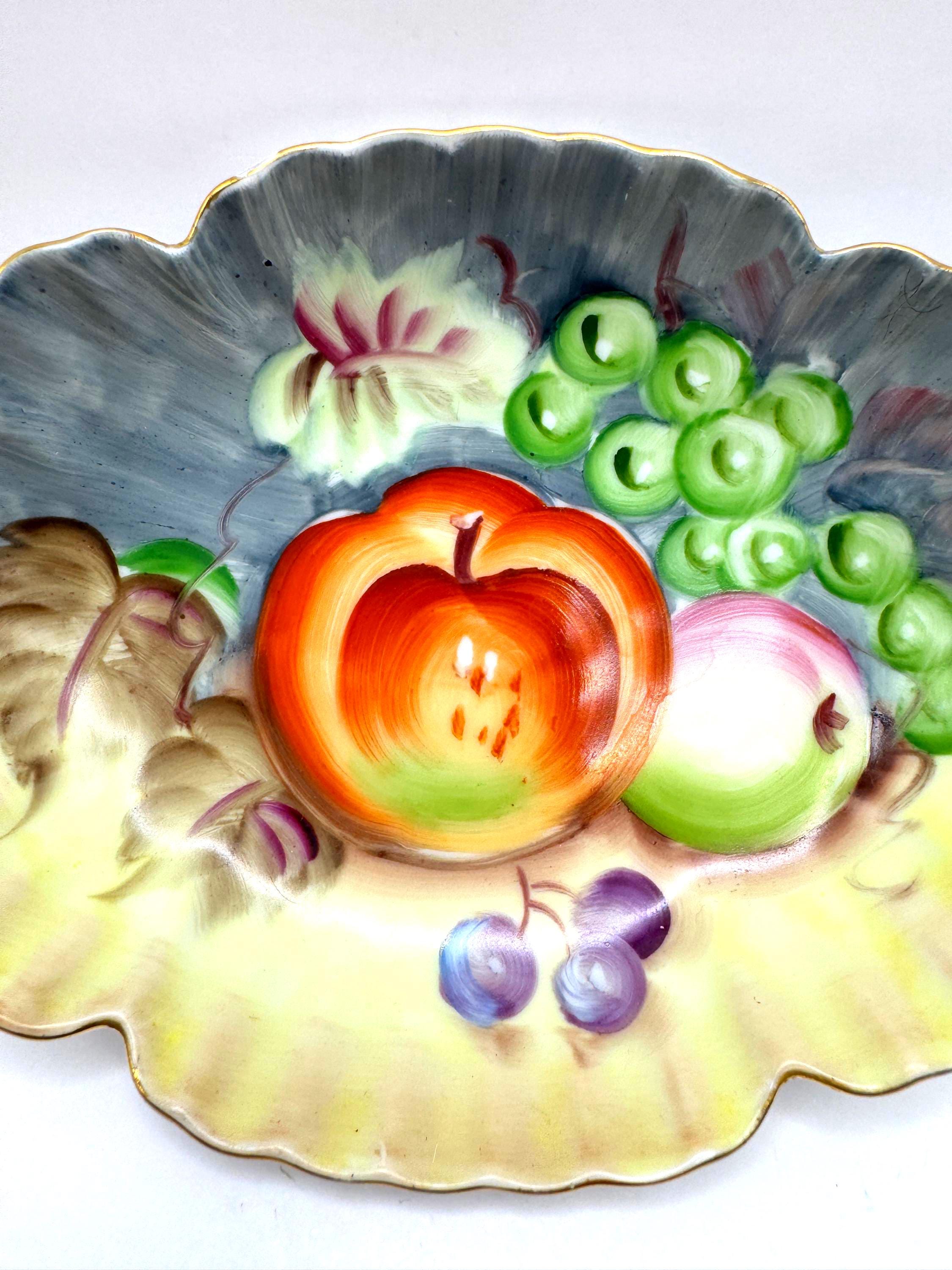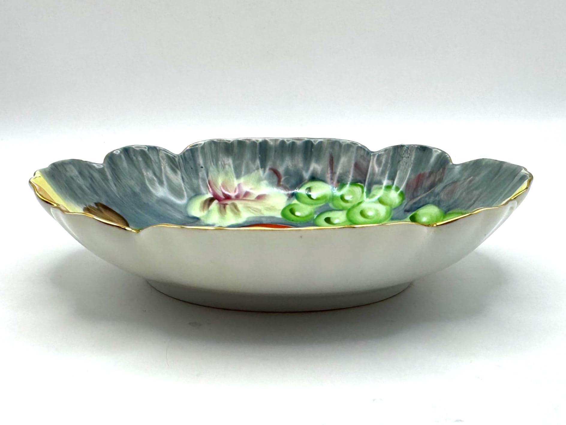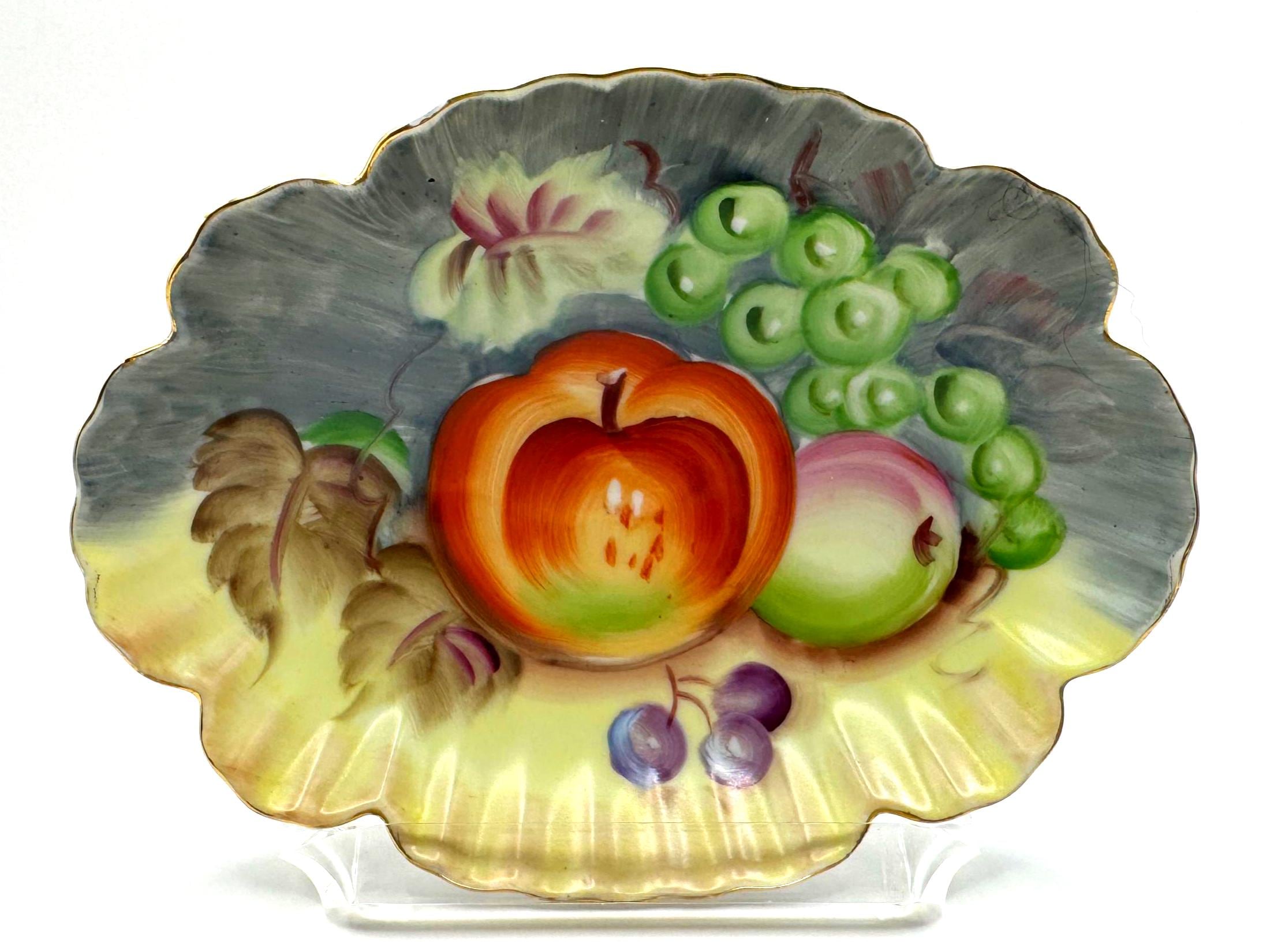Lovely vintage Lefton porcelain dish, featuring a beautifully hand-painted fruit design with apples, grapes, and cherries set against a softly shaded background. The dish has an elegant scalloped edge accented with delicate gold trim.