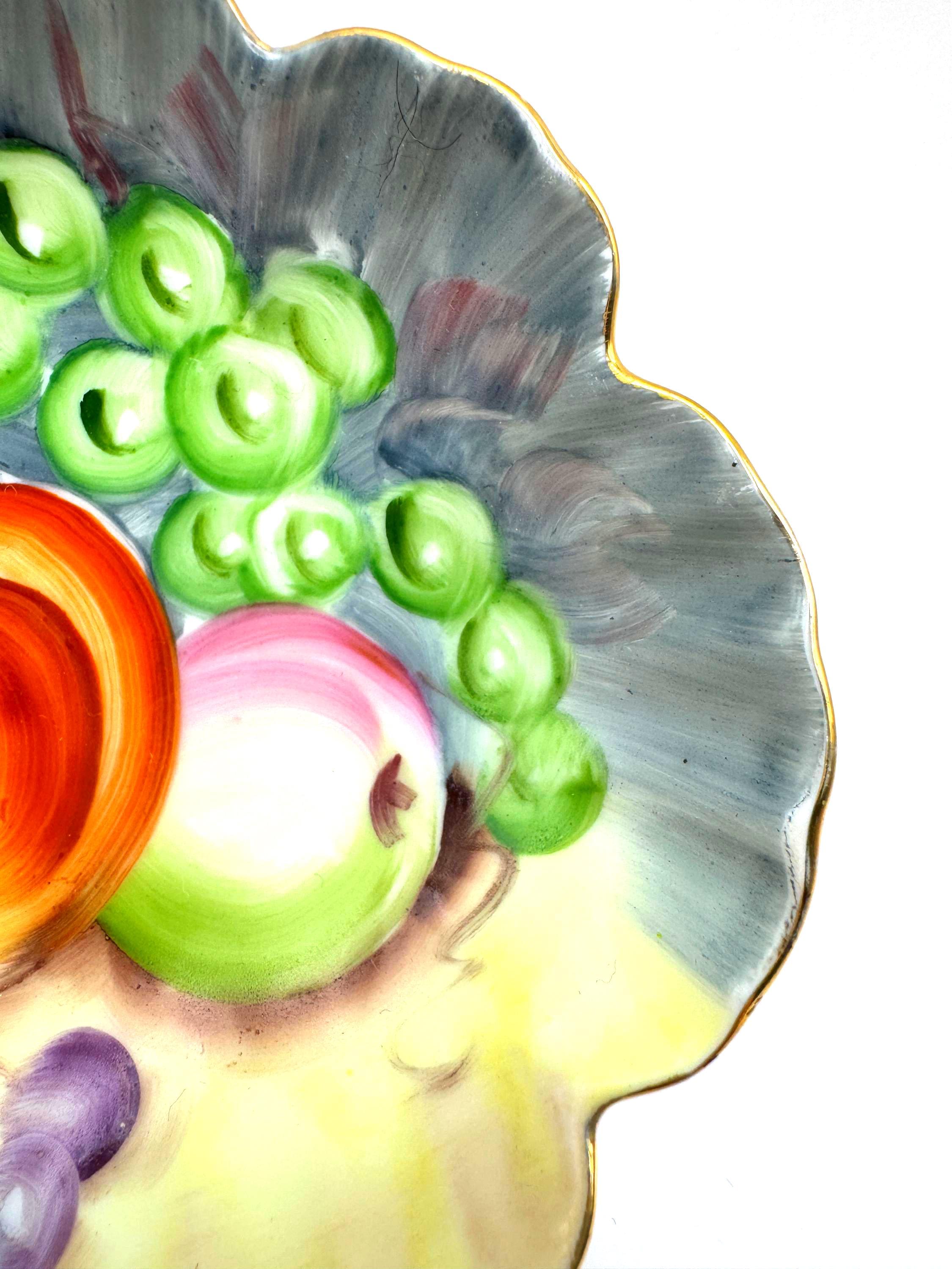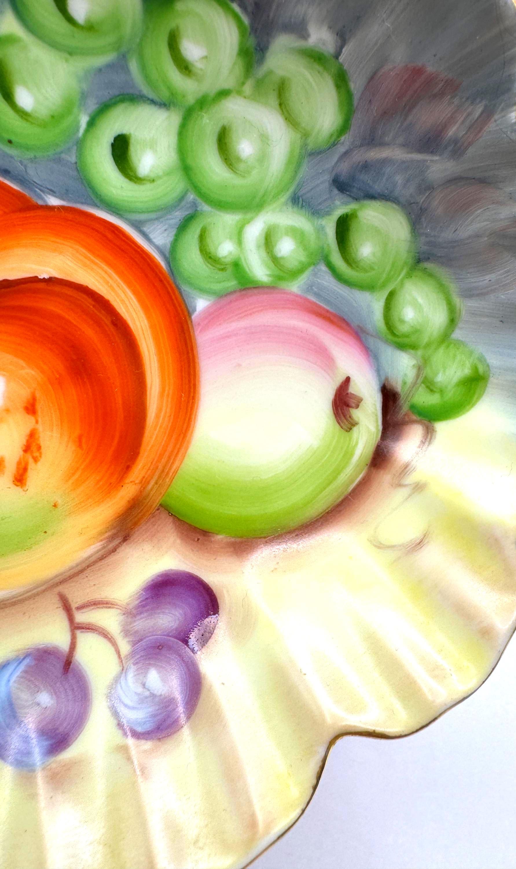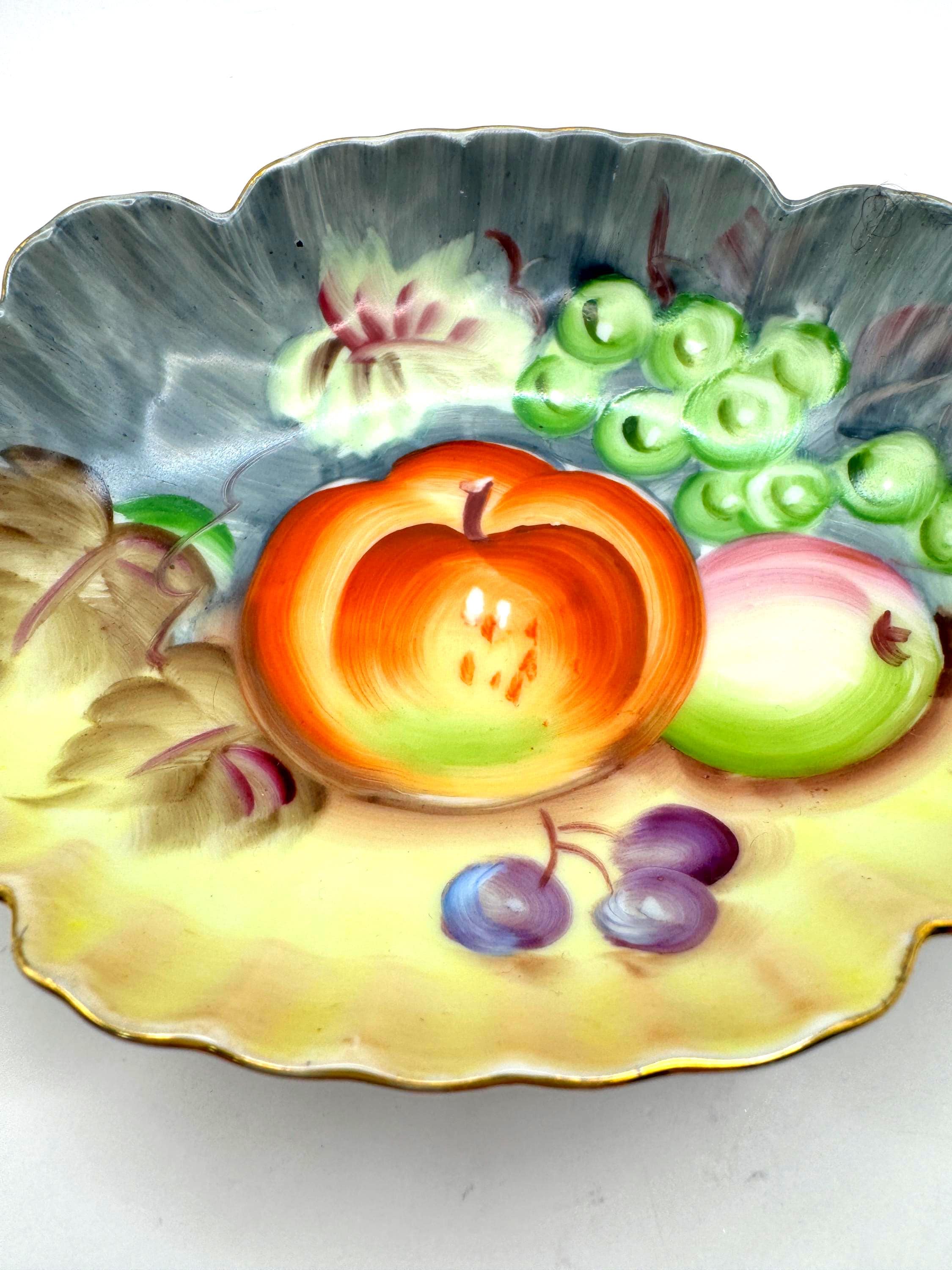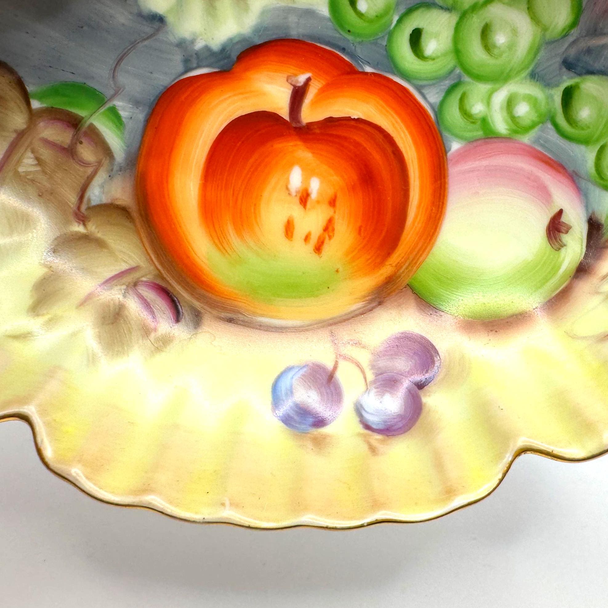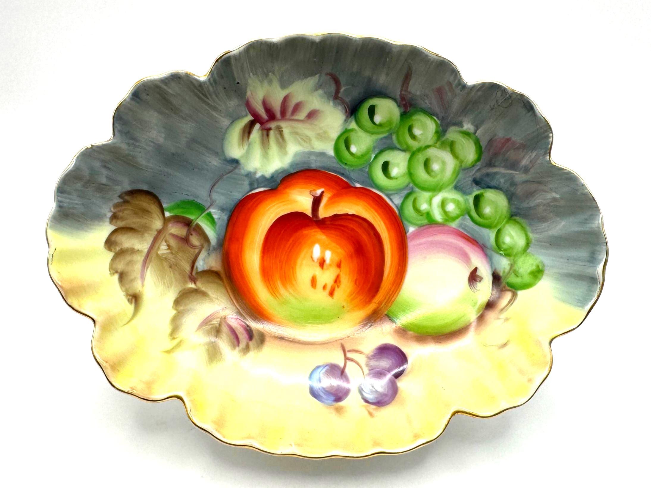 Lovely vintage Lefton porcelain dish, featuring a beautifully hand-painted fruit design with apples, grapes, and cherries set against a softly shaded background. The dish has an elegant scalloped edge accented with delicate gold trim.