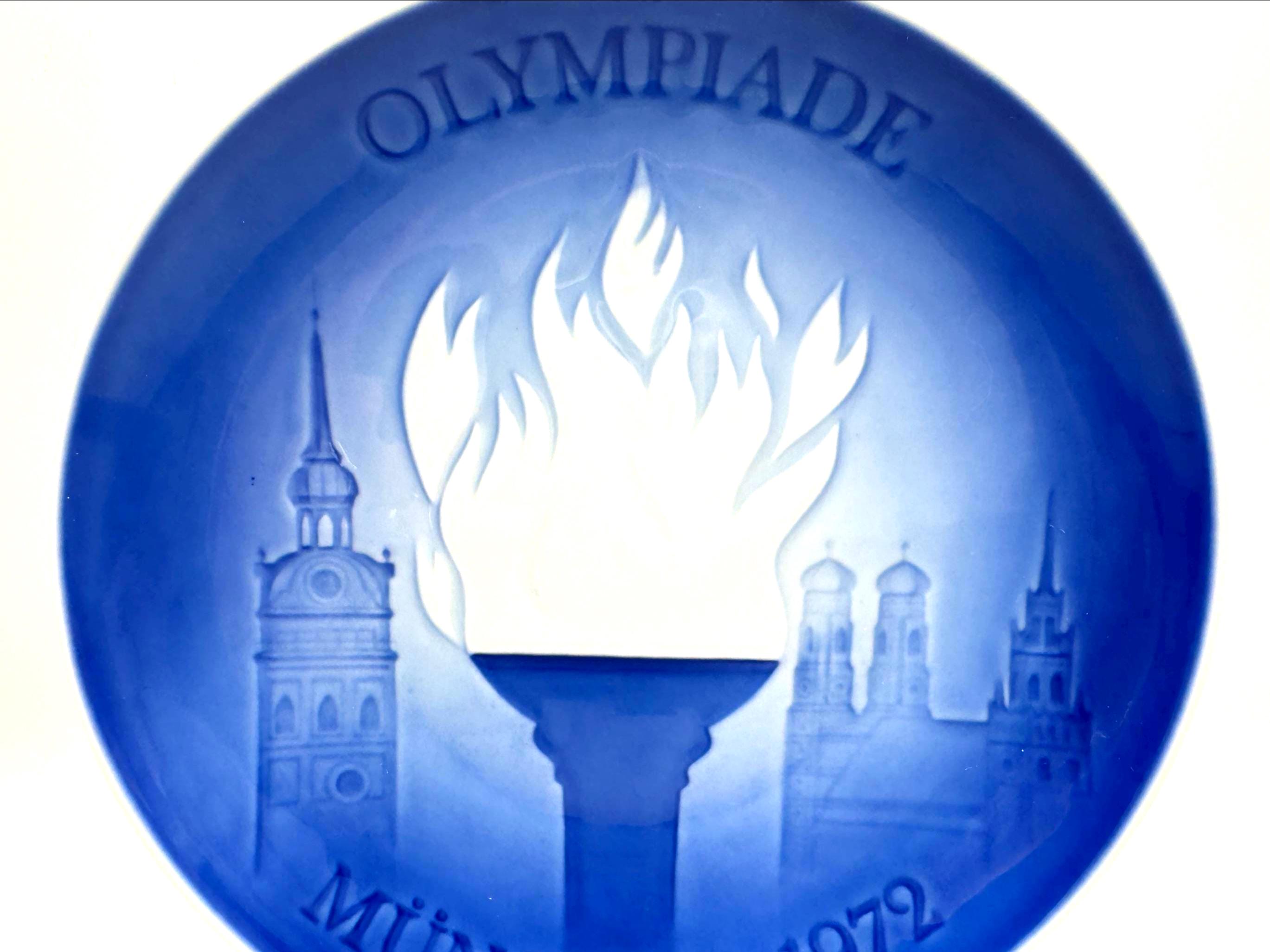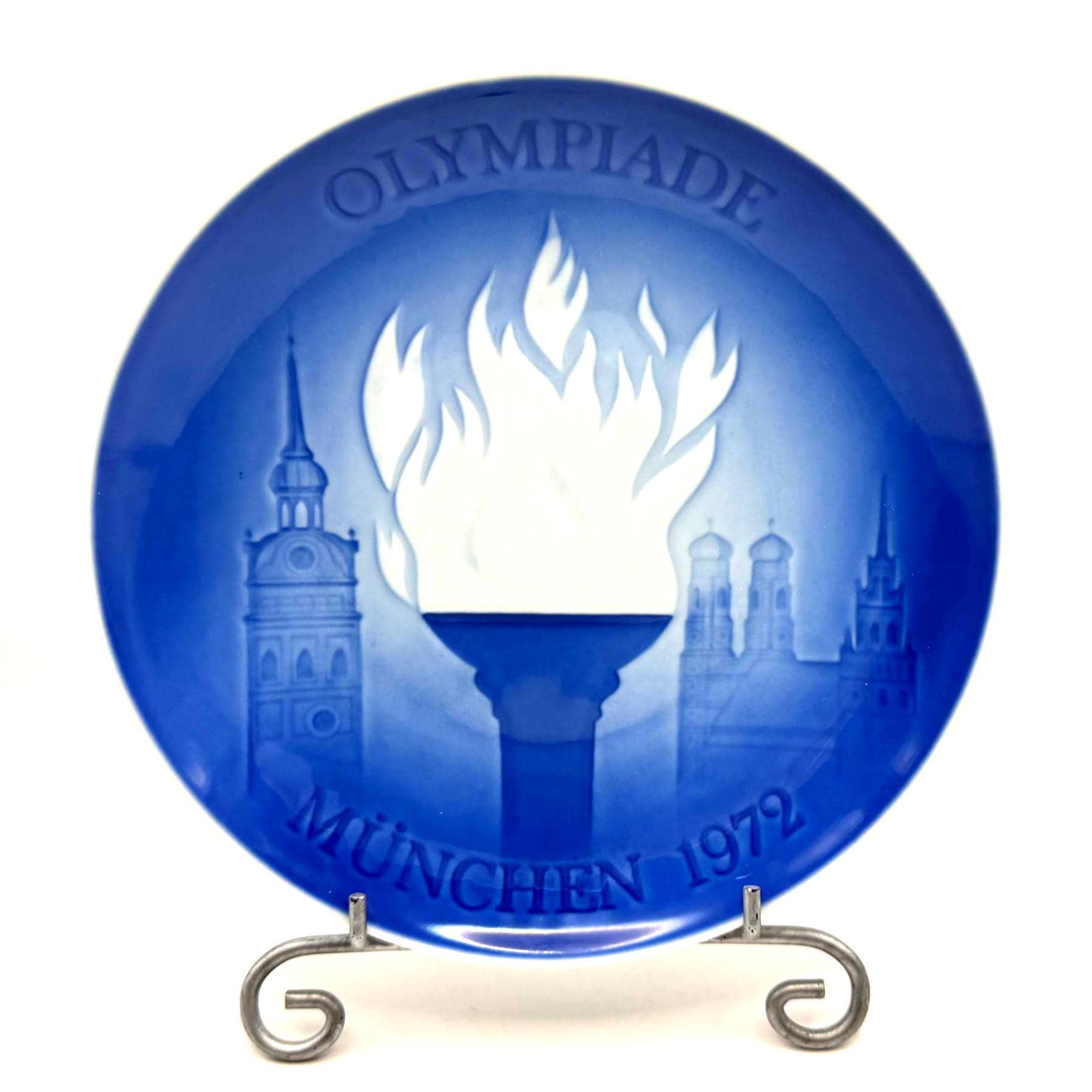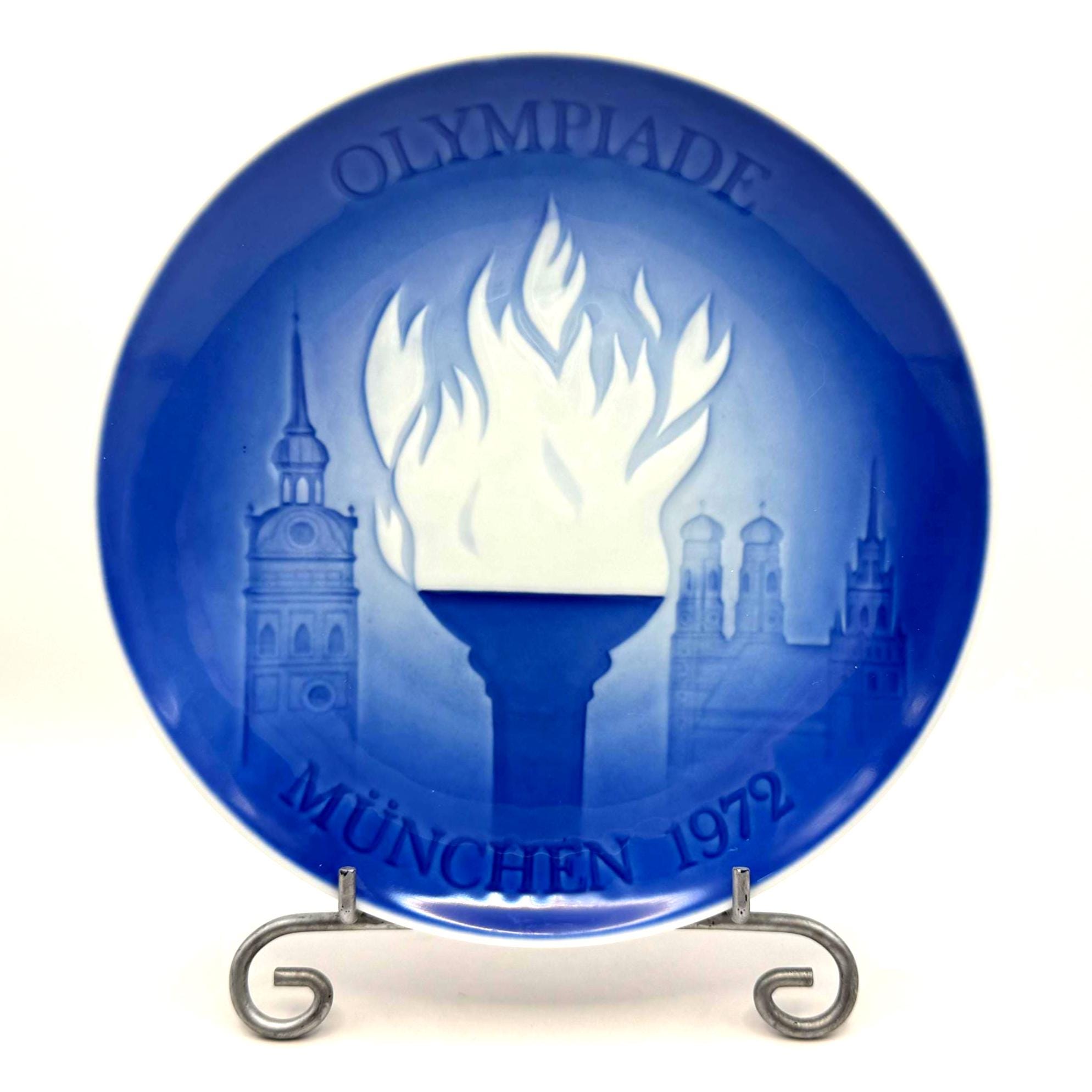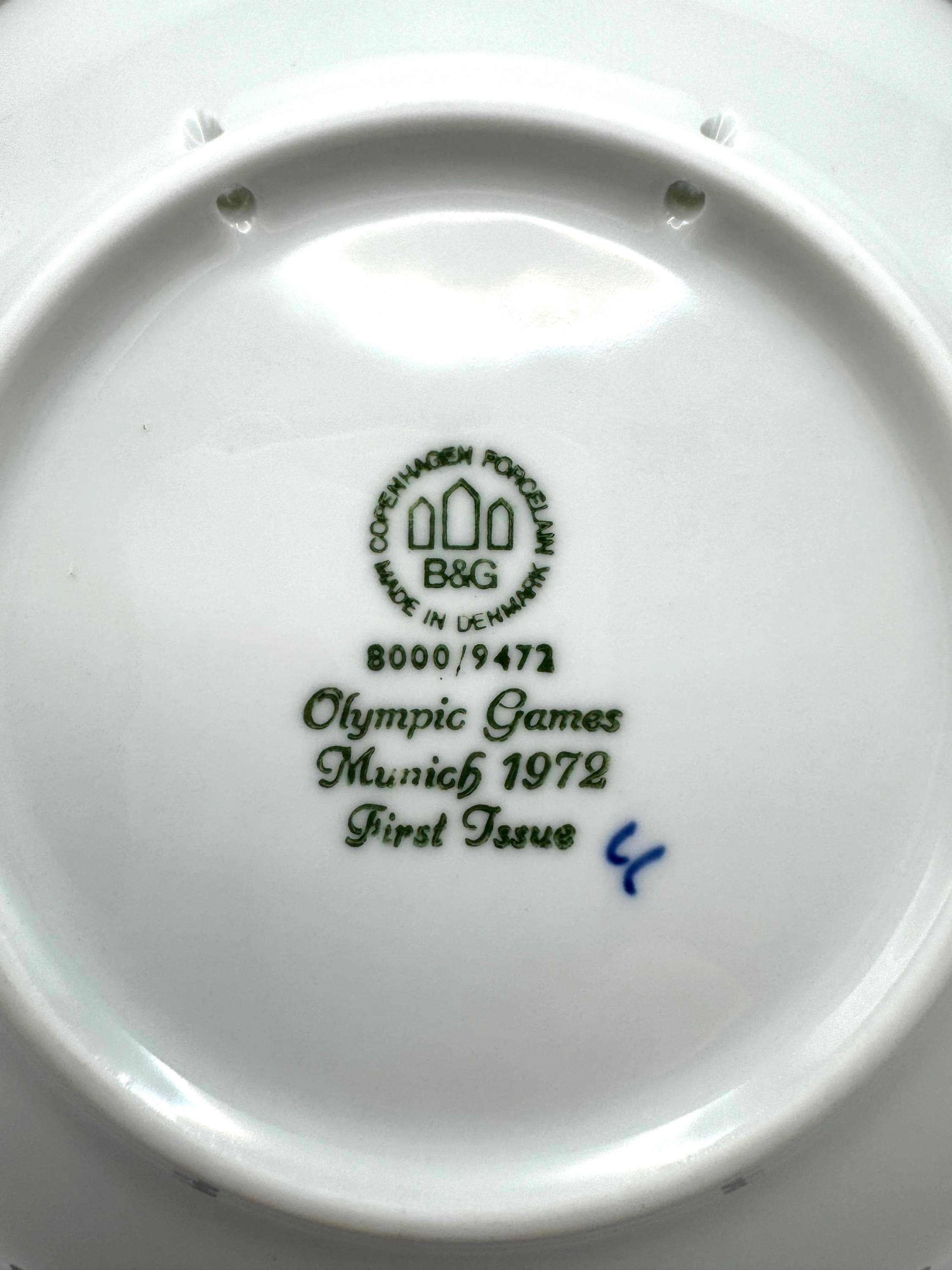 Commemorative porcelain plate celebrating the 1972 Olympic Games in Munich, produced by Bing & Grondahl (B&G) of Copenhagen, Denmark.