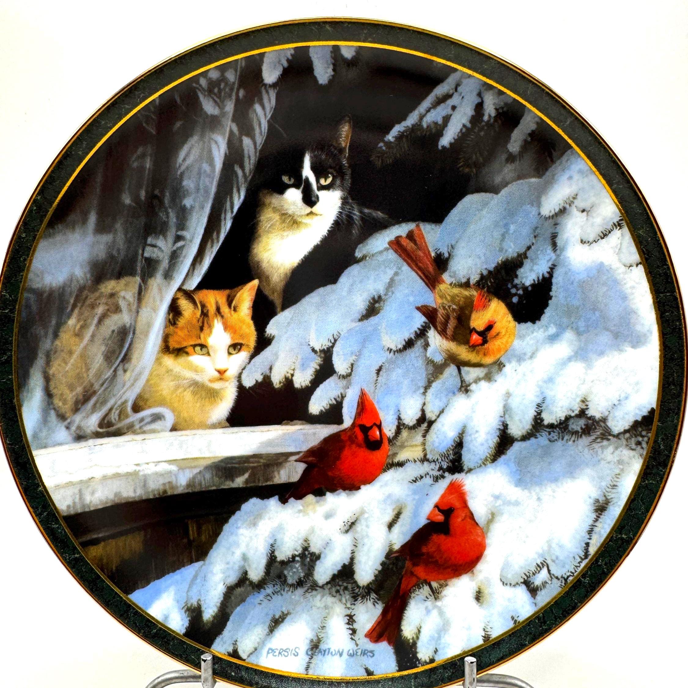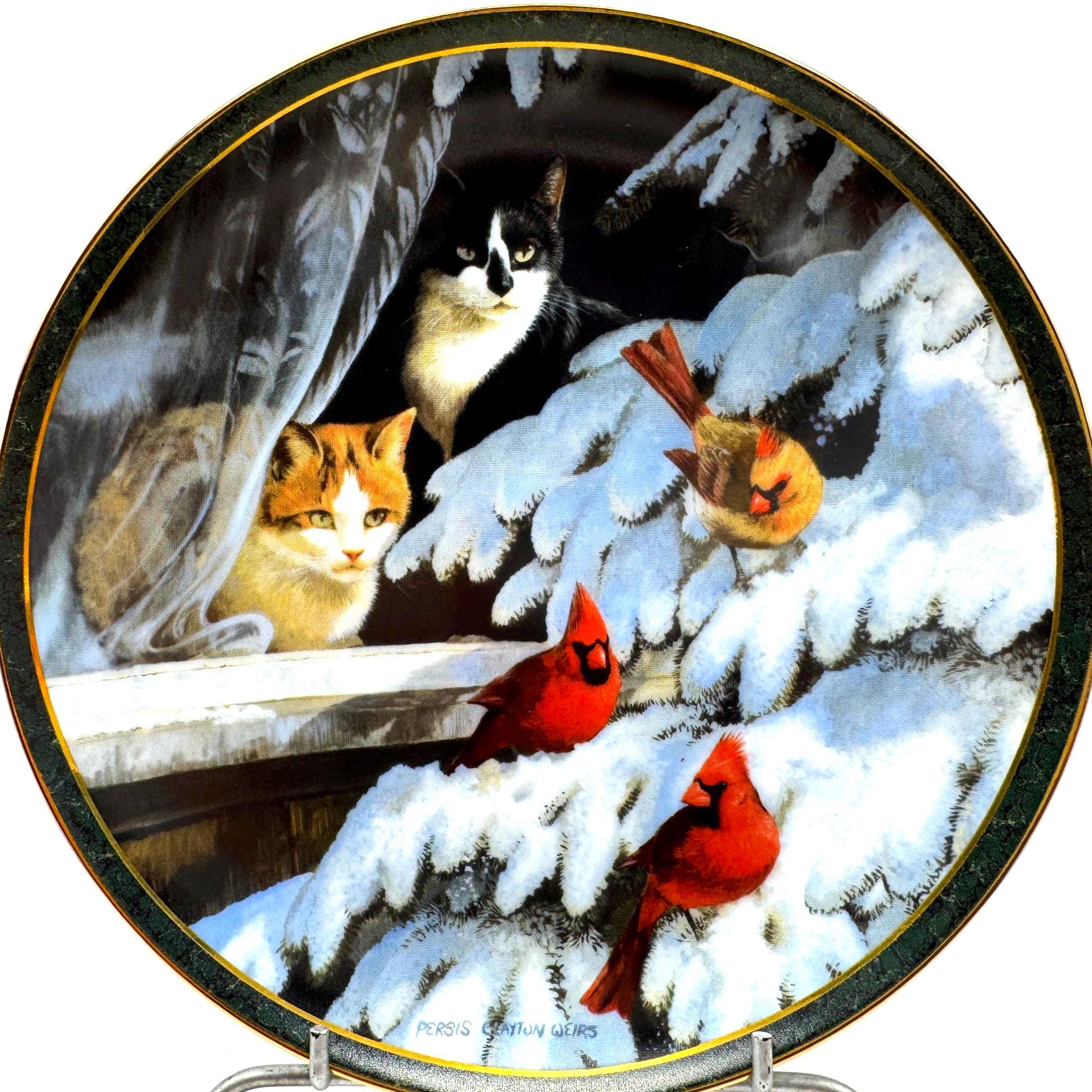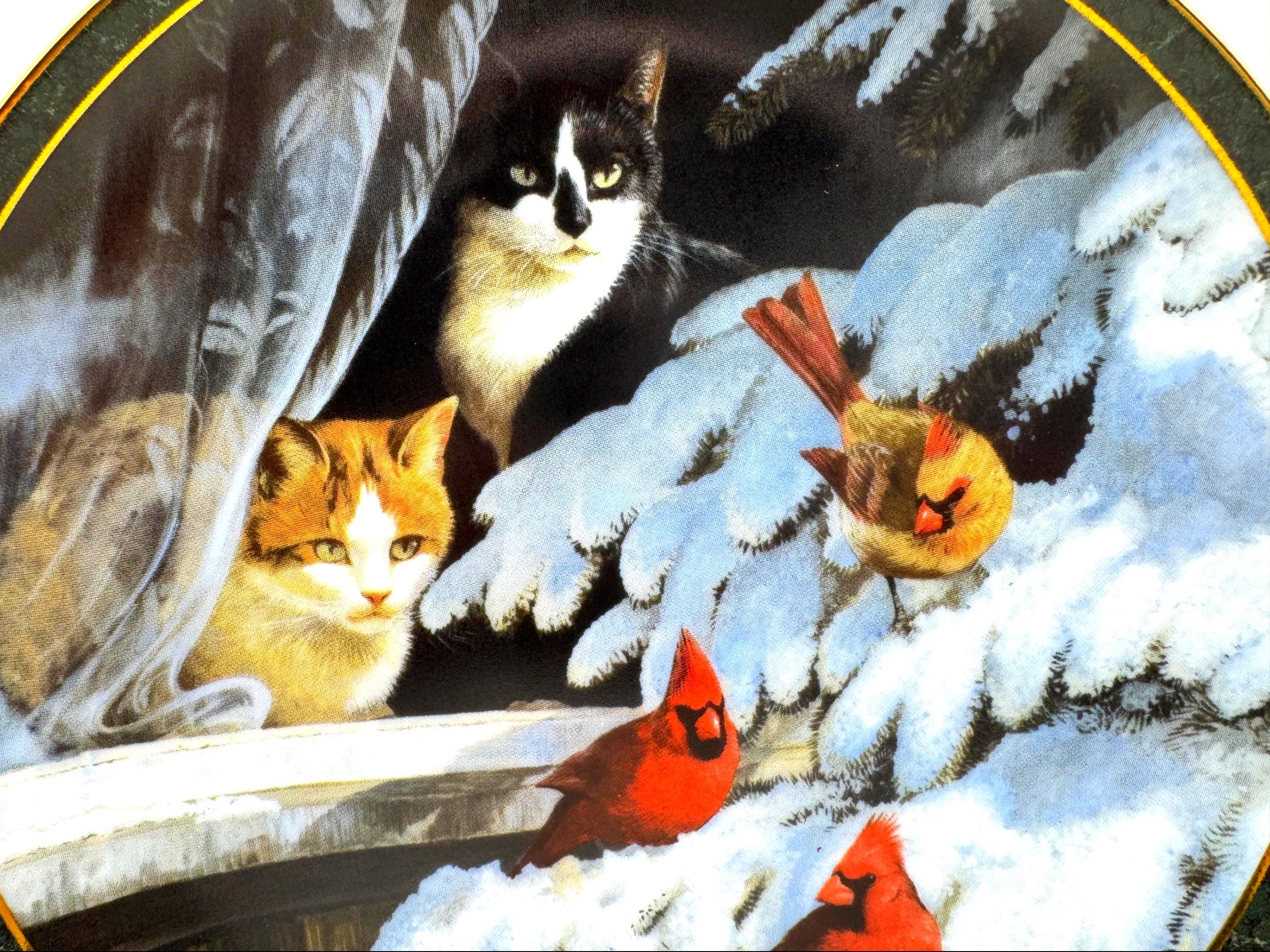 Perfect for collectors of Bradford Exchange plates, bird and cardinal décor, cat art, or cozy winter cottage-style displays.