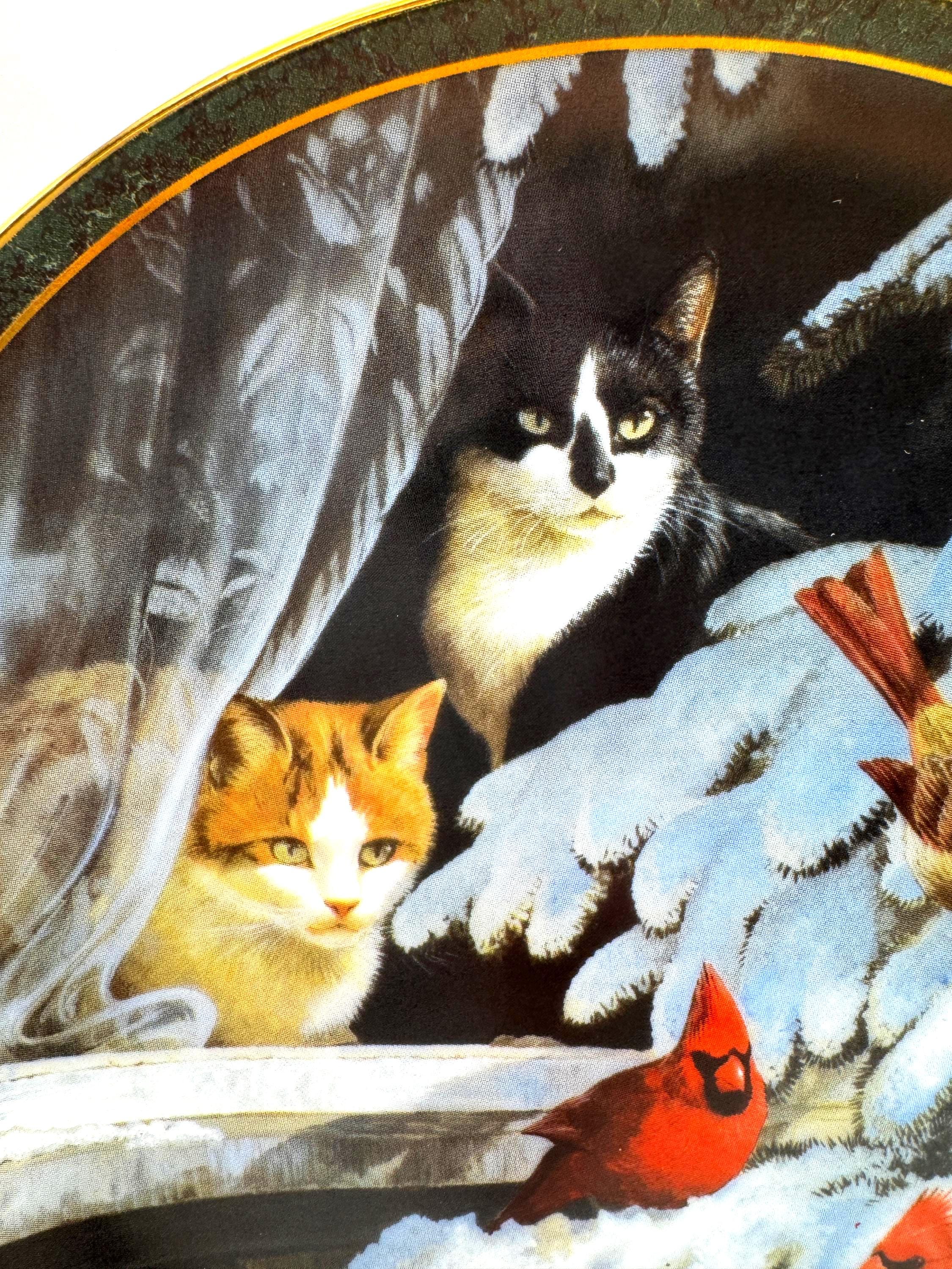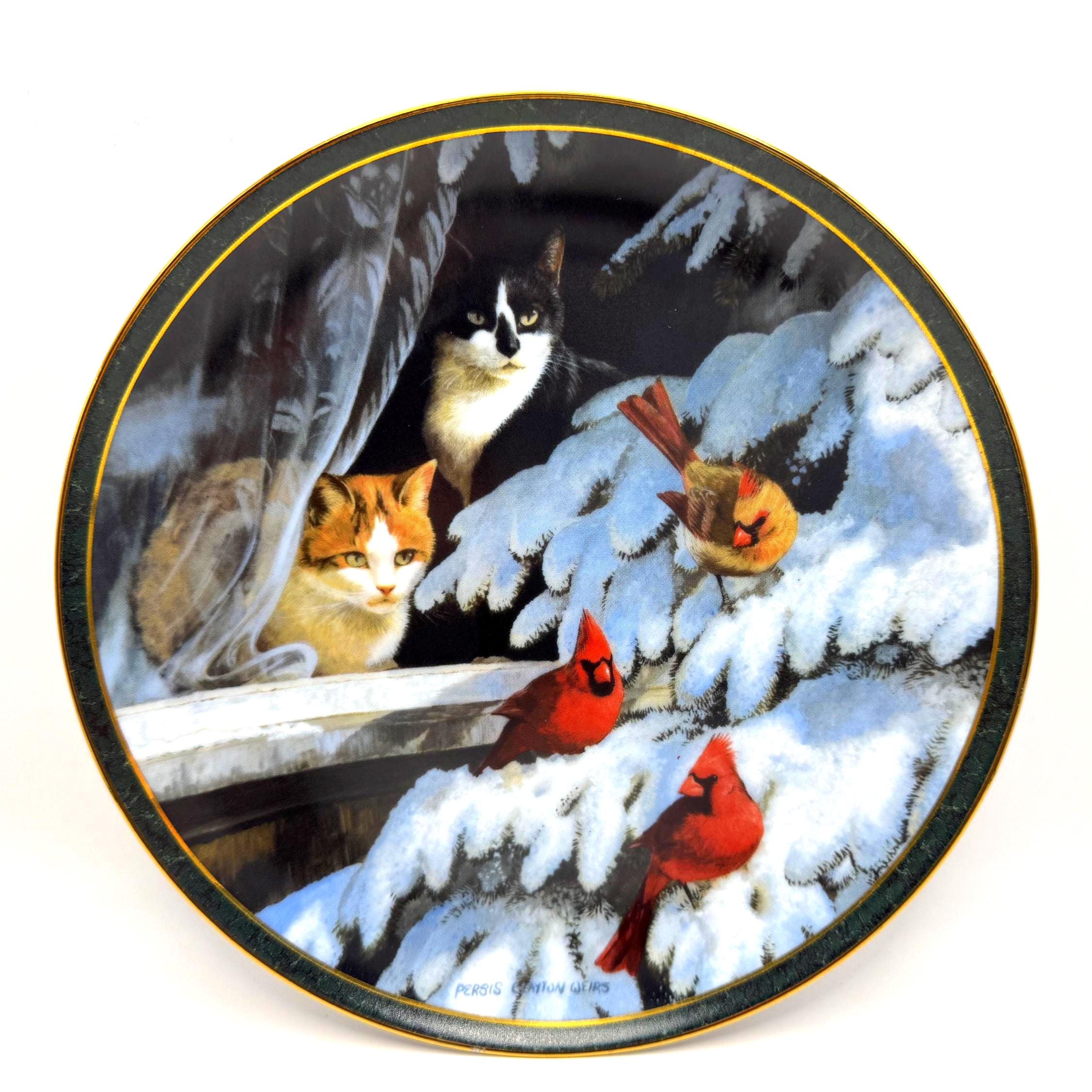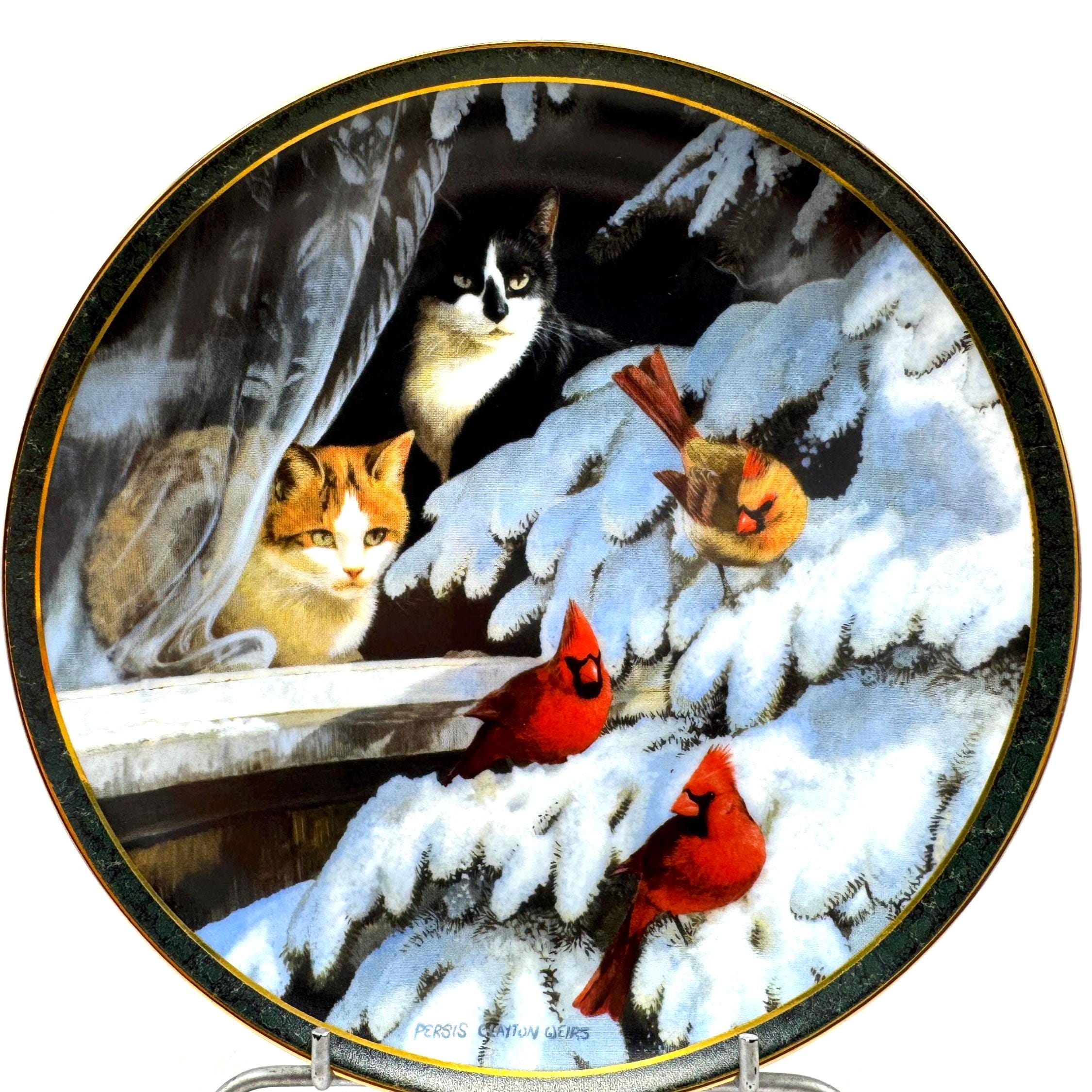 Perfect for collectors of Bradford Exchange plates, bird and cardinal décor, cat art, or cozy winter cottage-style displays.