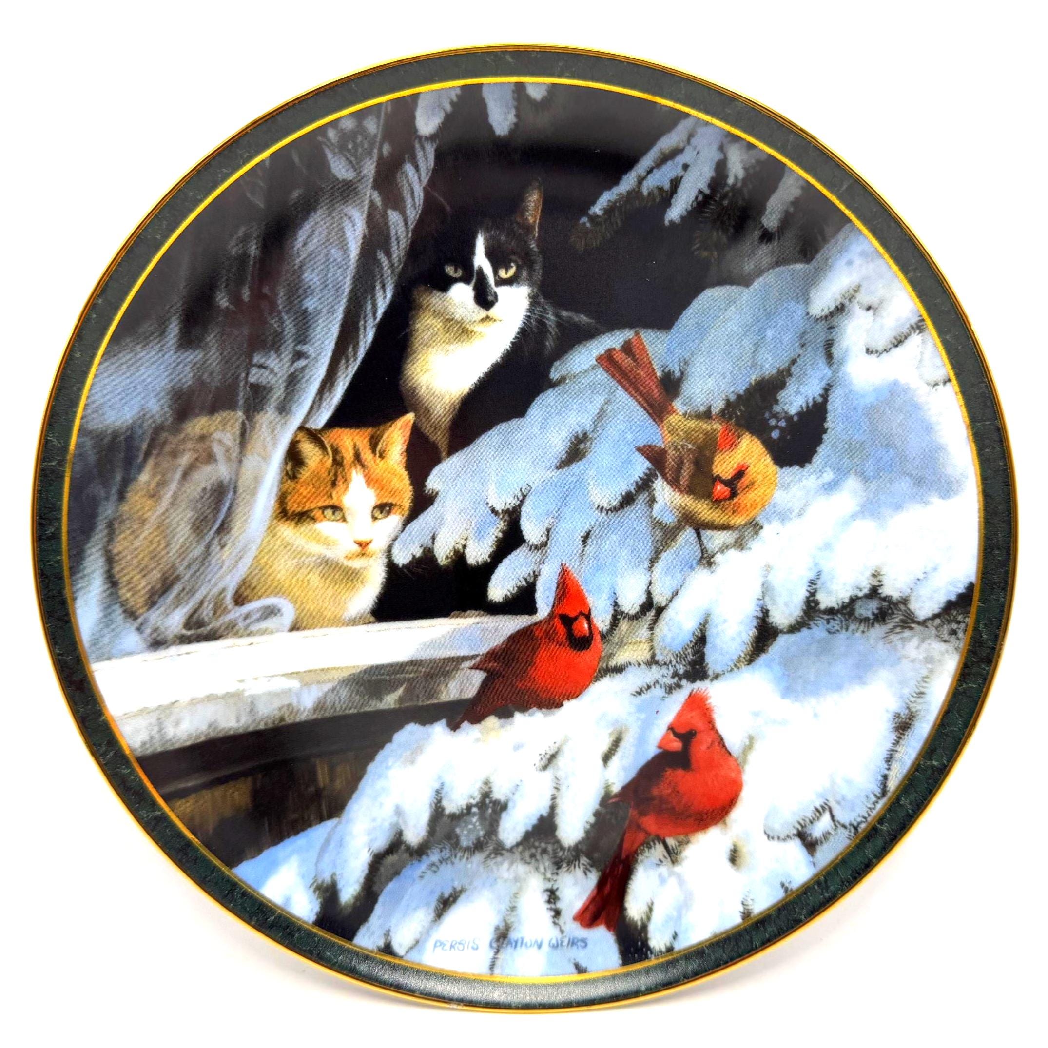 Charming vintage collector plate from The Bradford Exchange, featuring “Birdwatchers” by wildlife artist Persis Weirs. This cozy winter scene captures curious cats peeking from a window while bright red cardinals gather on snow-covered branches — a classic example of Persis Weirs’ warm, storytelling style.