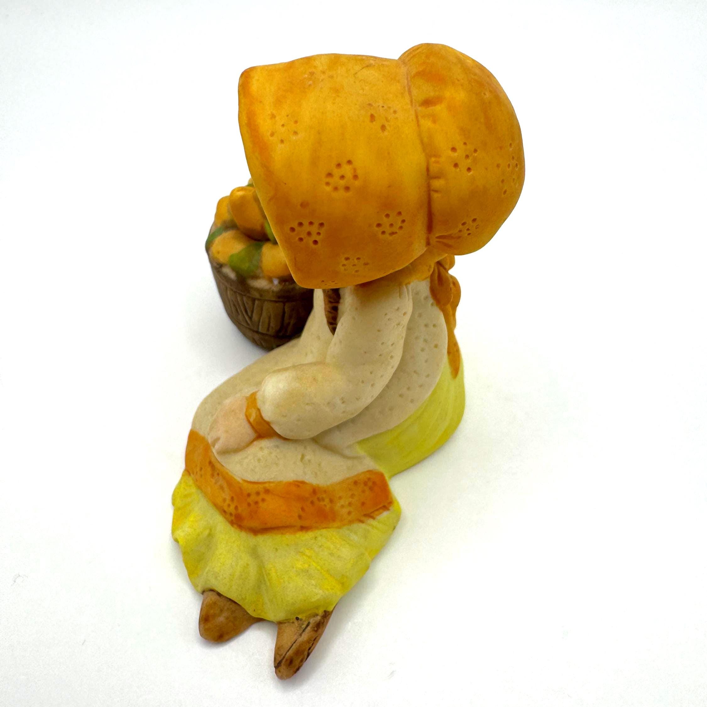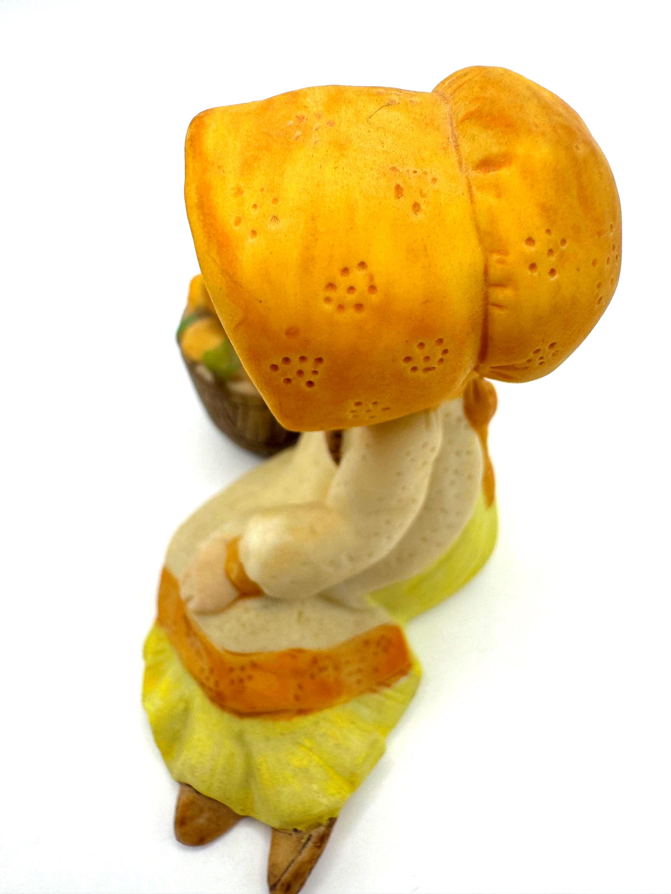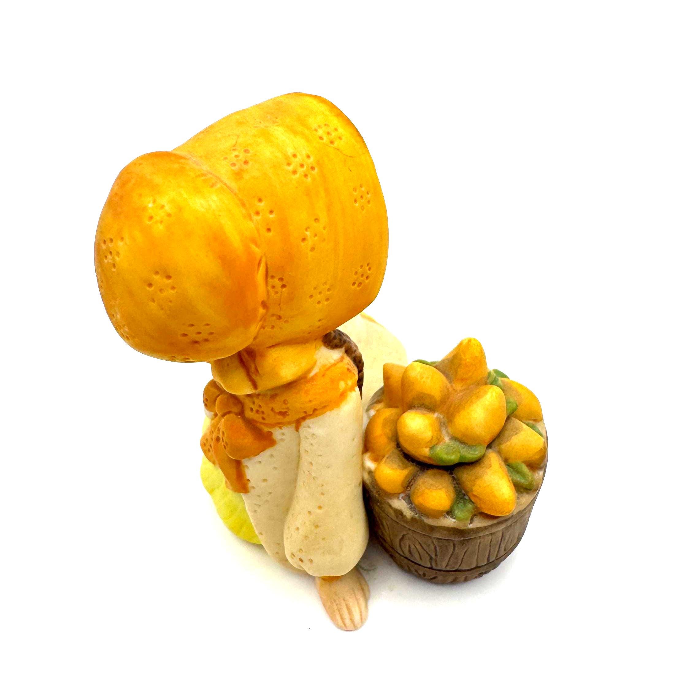A charming vintage Holly Hobbie miniature titled “Bountiful Pleasure,” featuring a seated girl in a orange bonnet beside a basket of warm-toned harvest fruit. This sweet figurine reflects classic Holly Hobbie countryside charm, with soft facial features, braided hair, and delicate hand-painted details throughout.