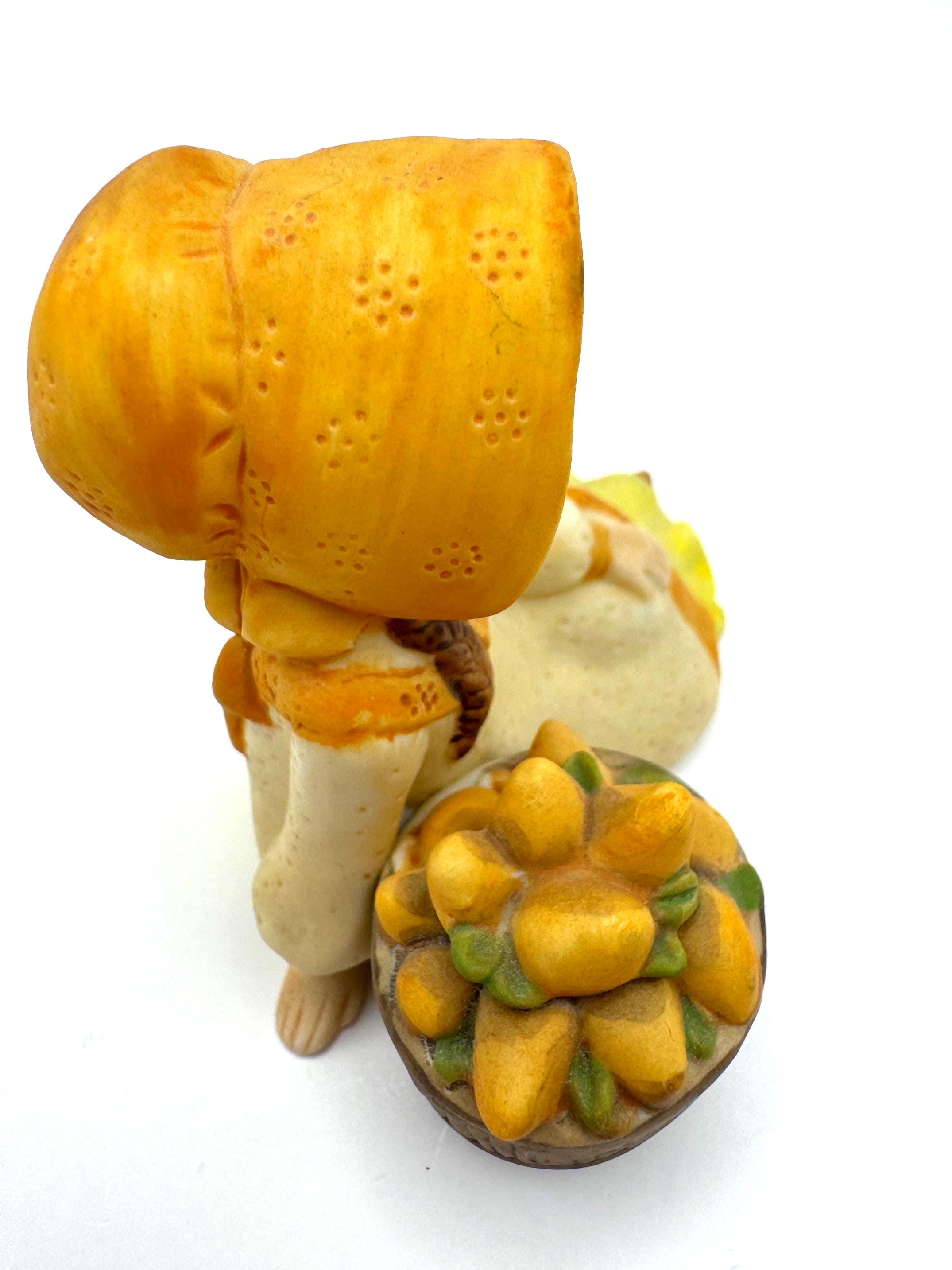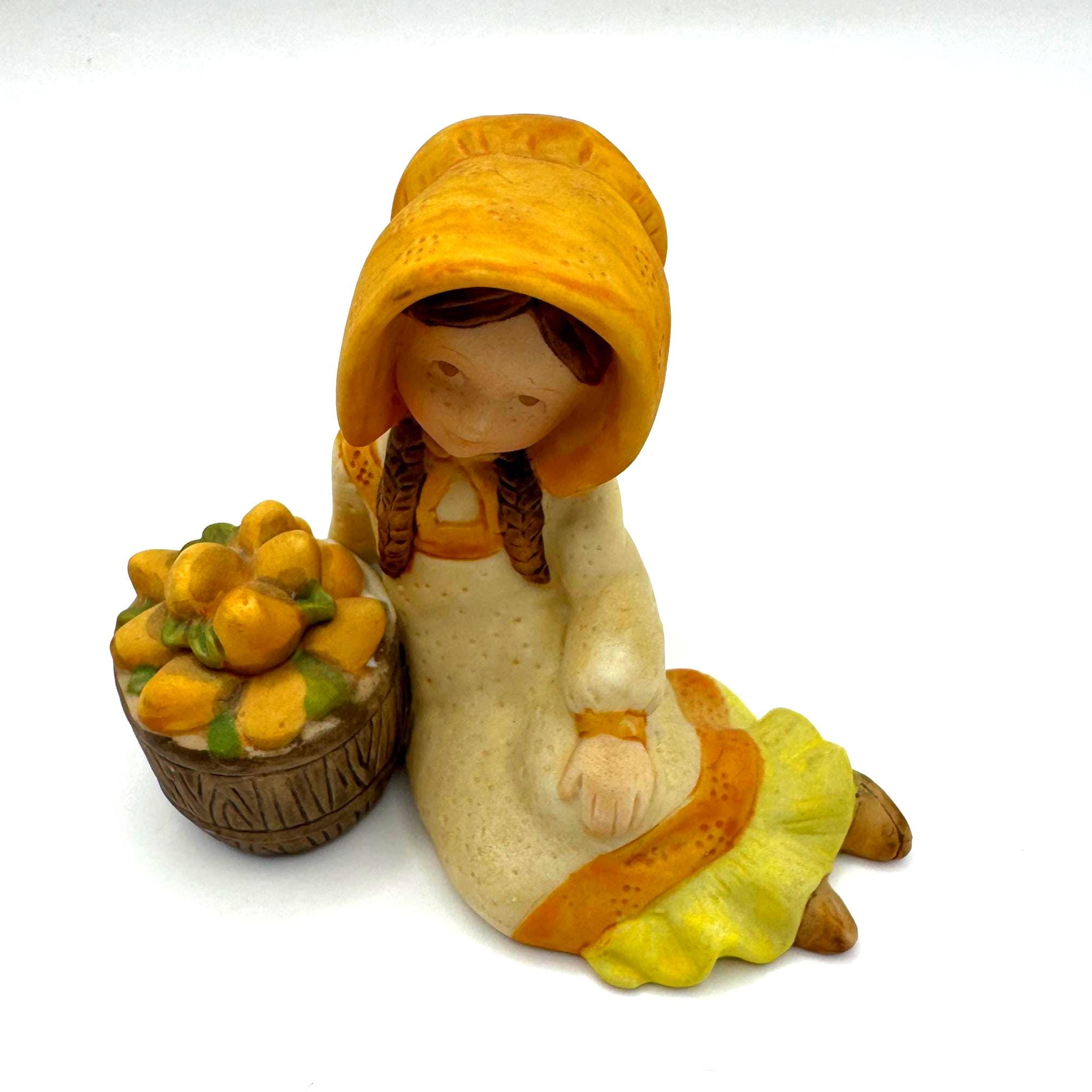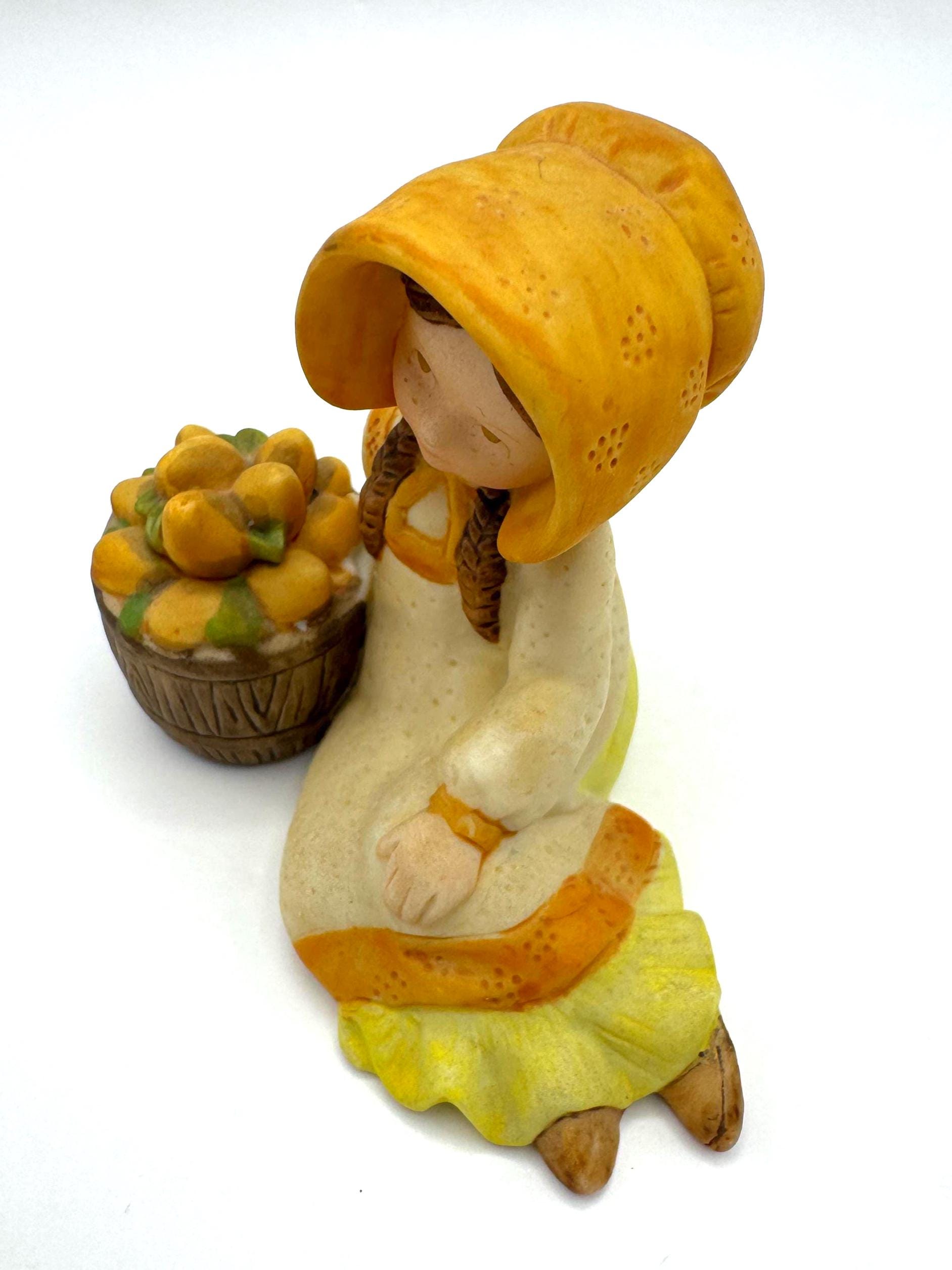 A charming vintage Holly Hobbie miniature titled “Bountiful Pleasure,” featuring a seated girl in a orange bonnet beside a basket of warm-toned harvest fruit. This sweet figurine reflects classic Holly Hobbie countryside charm, with soft facial features, braided hair, and delicate hand-painted details throughout.