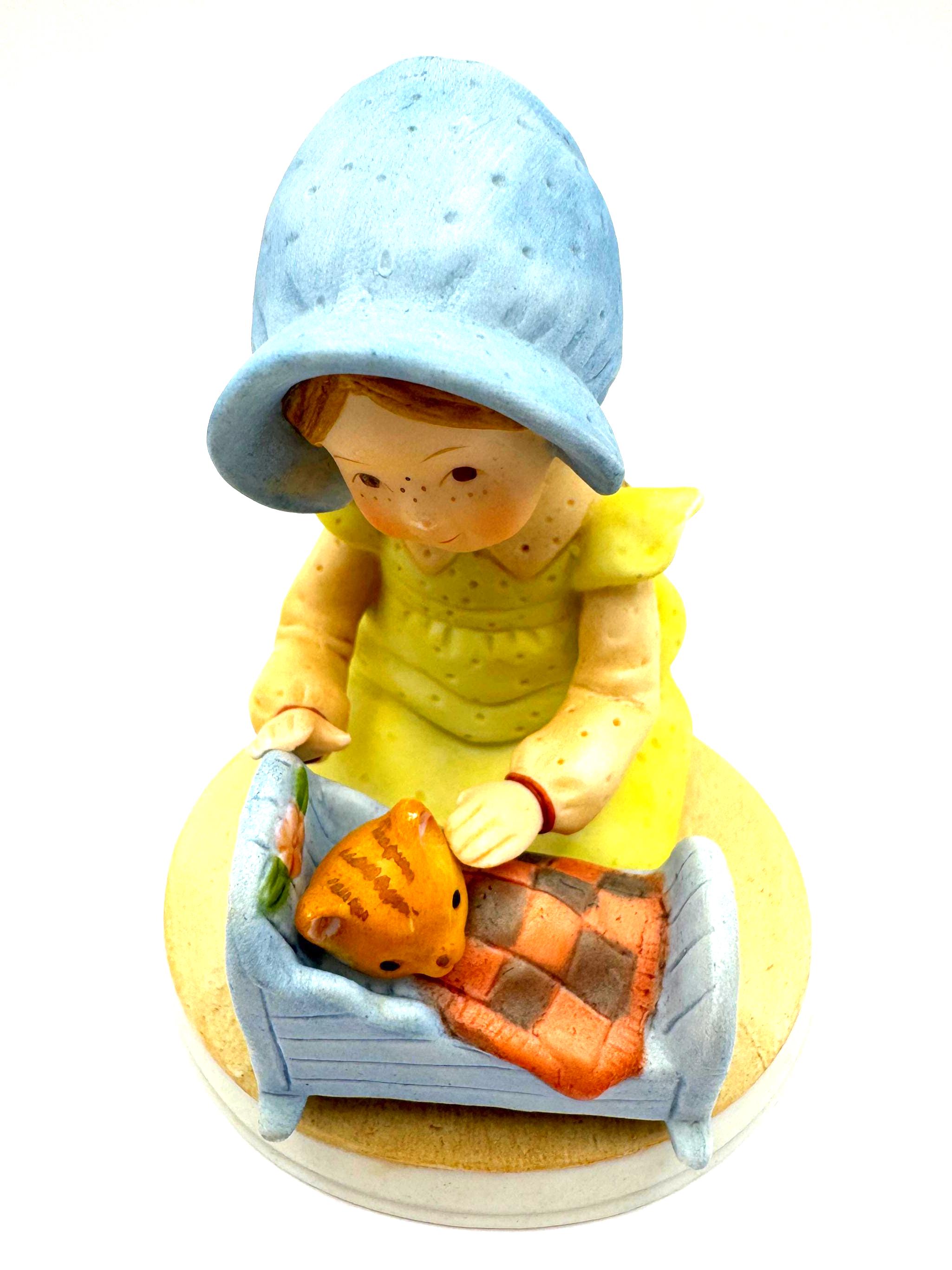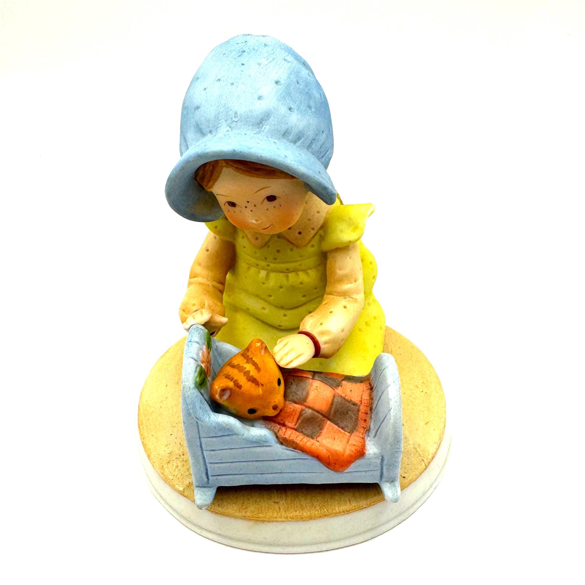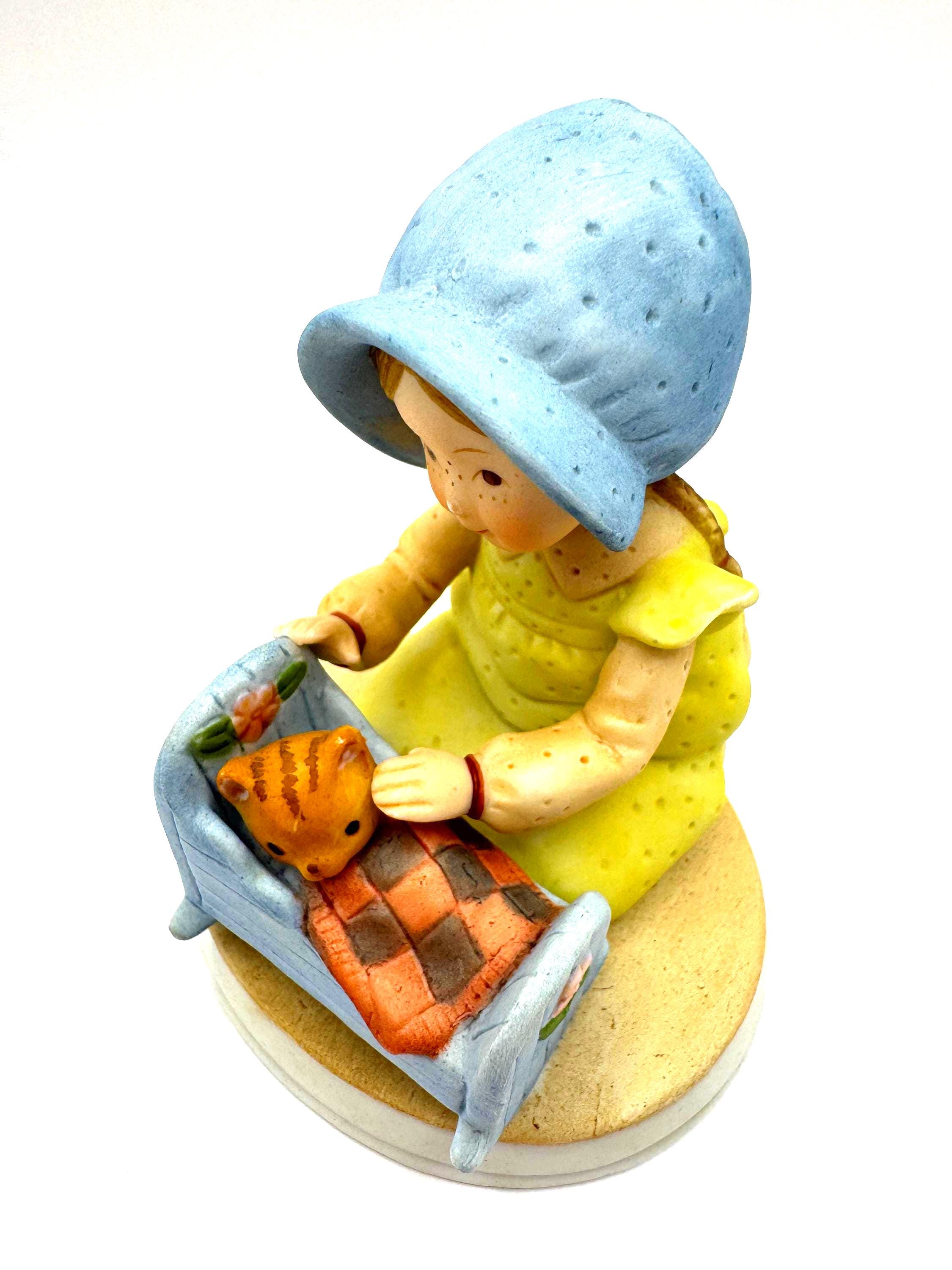 A sweet and nostalgic vintage Holly Hobbie figurine titled “Pleasant Dreams,” featuring a young girl gently tucking a kitten into a small blue cradle. The soft pastel colors, freckled face, and tender bedtime scene capture the gentle charm Holly Hobbie is loved for.