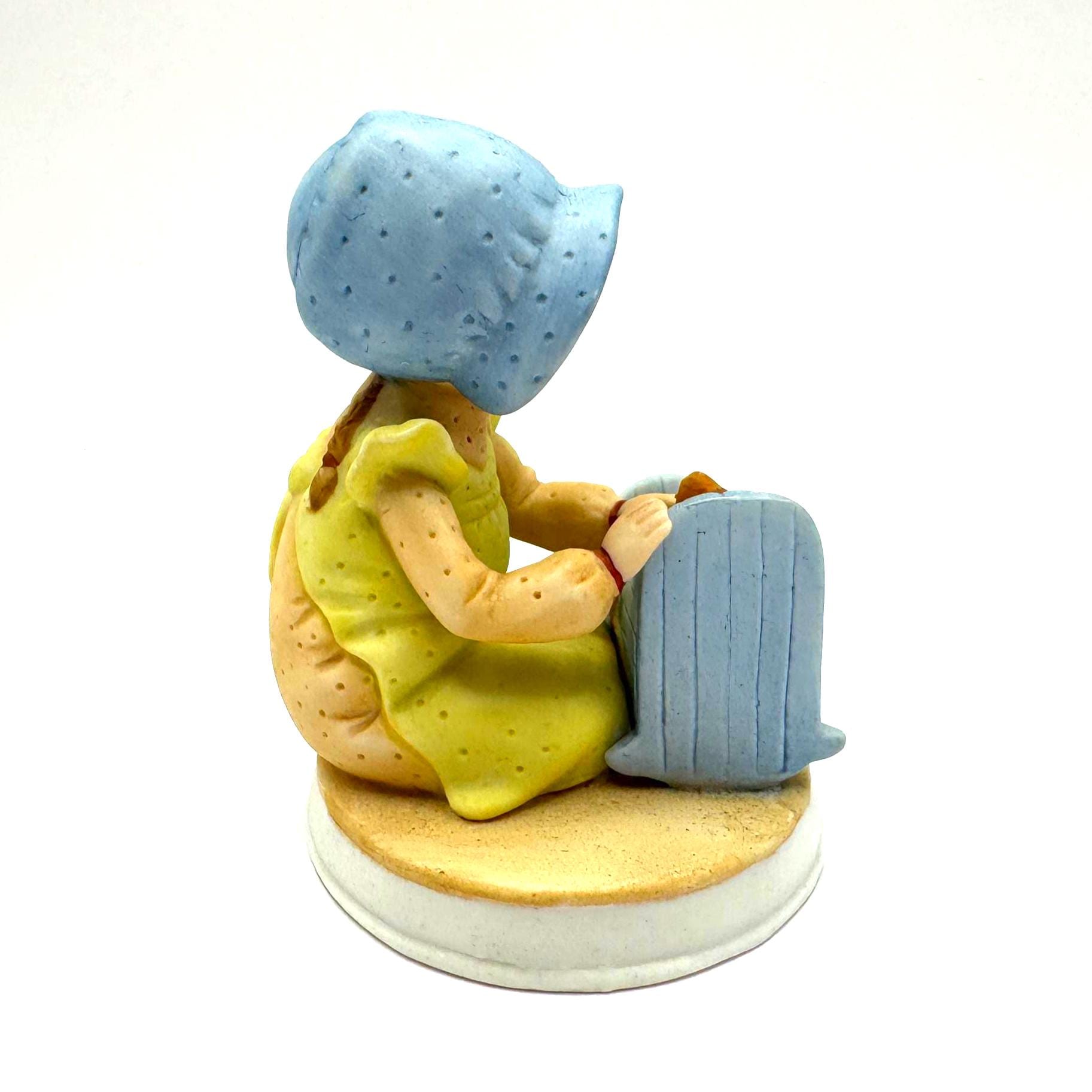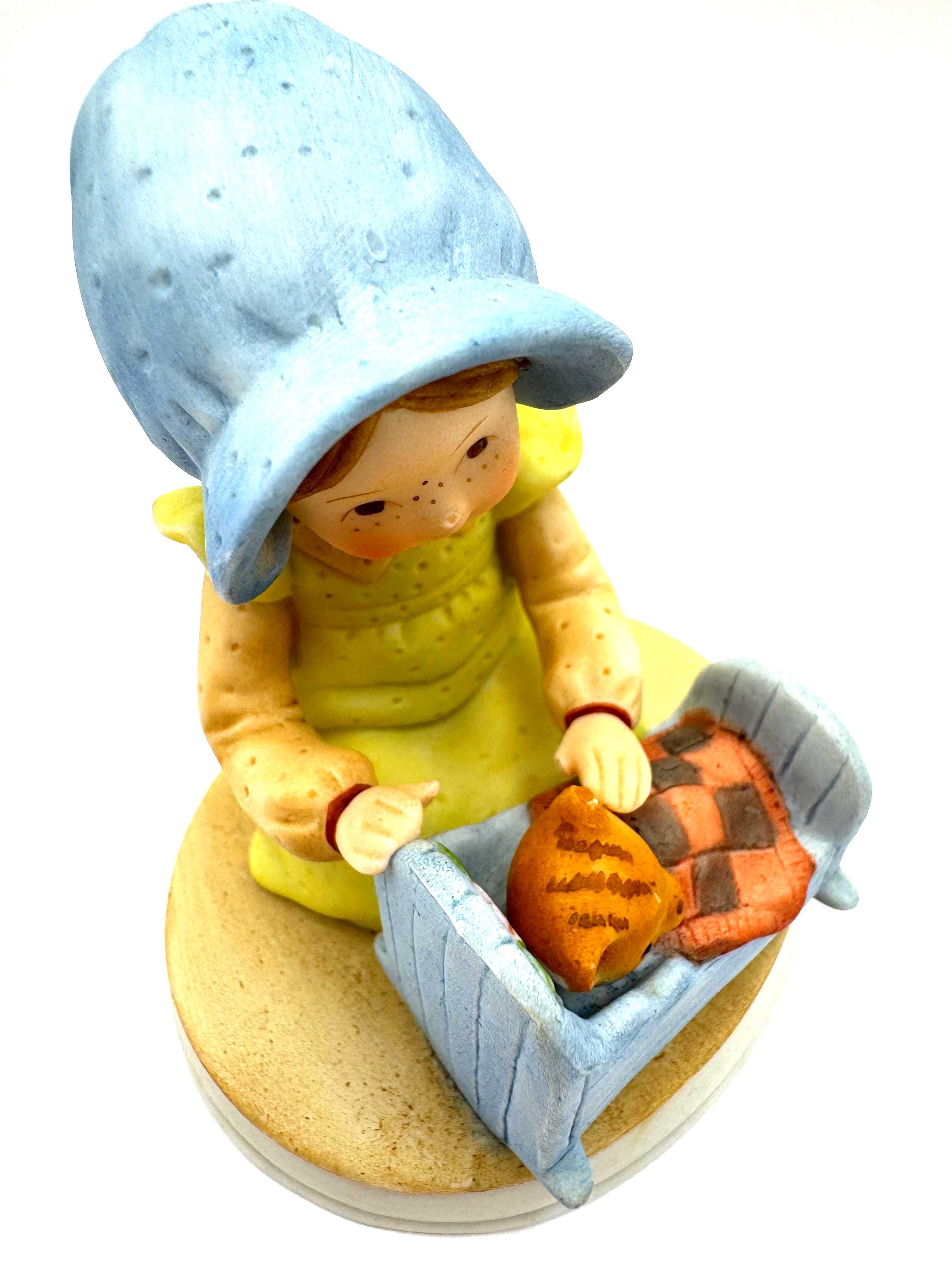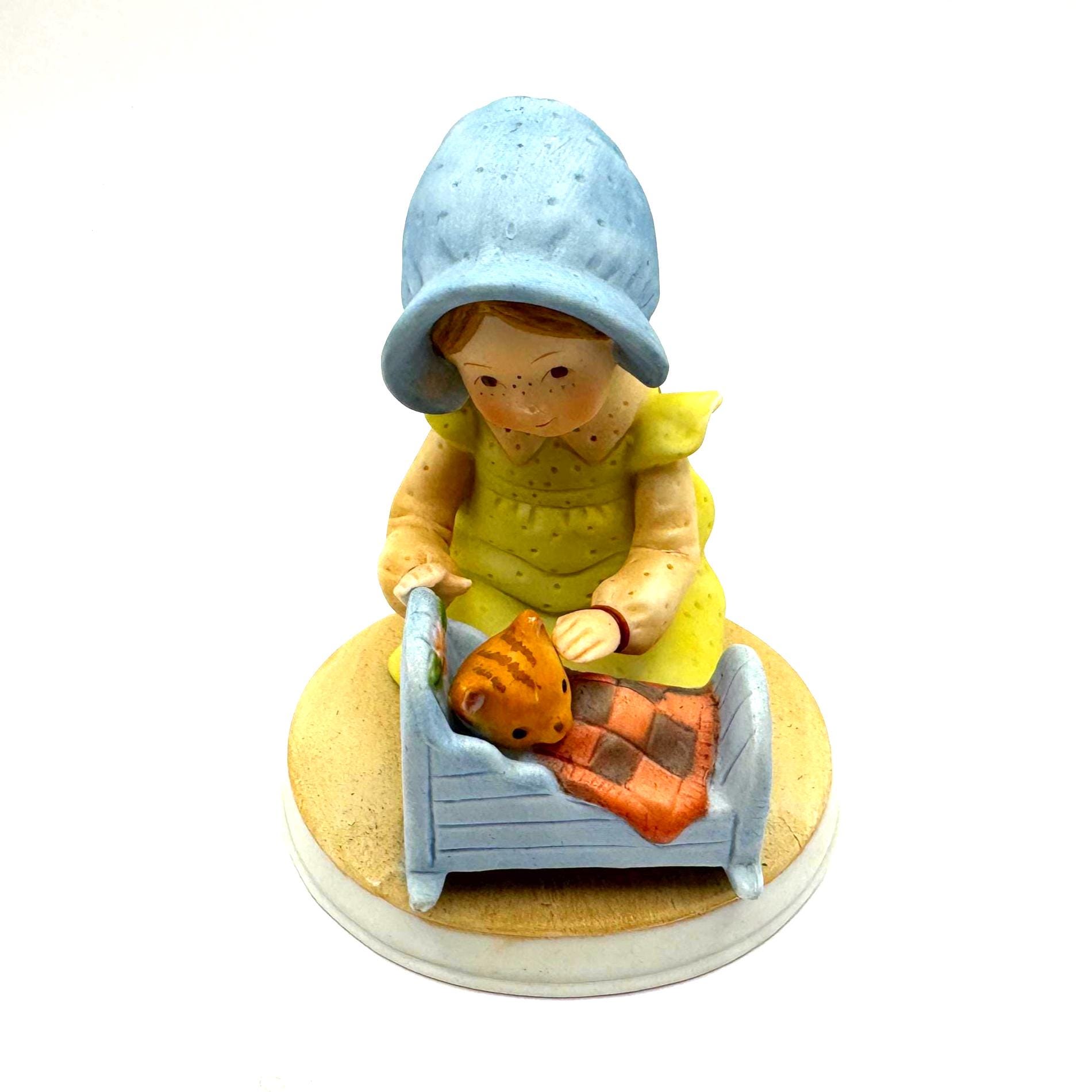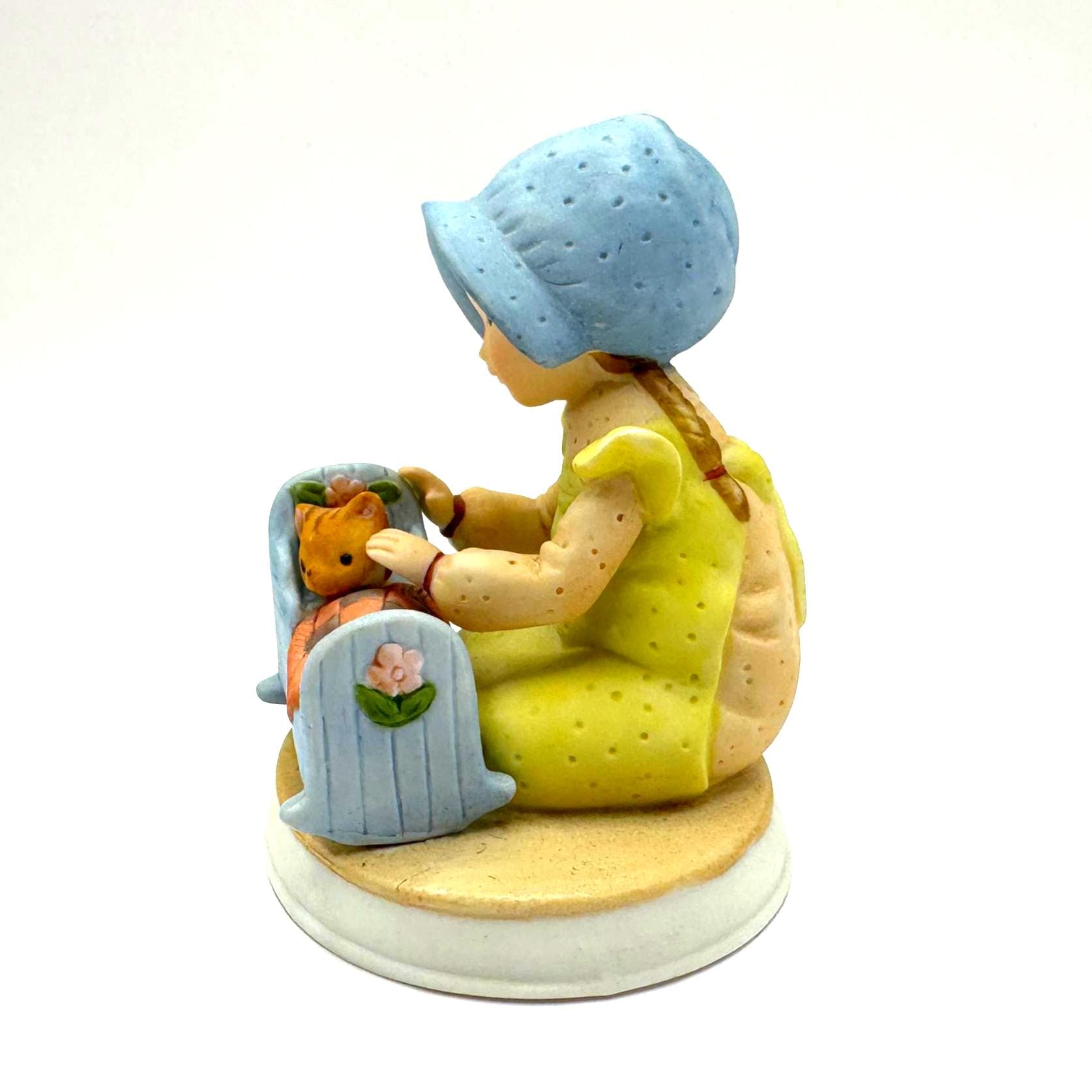 A sweet and nostalgic vintage Holly Hobbie figurine titled “Pleasant Dreams,” featuring a young girl gently tucking a kitten into a small blue cradle. The soft pastel colors, freckled face, and tender bedtime scene capture the gentle charm Holly Hobbie is loved for.