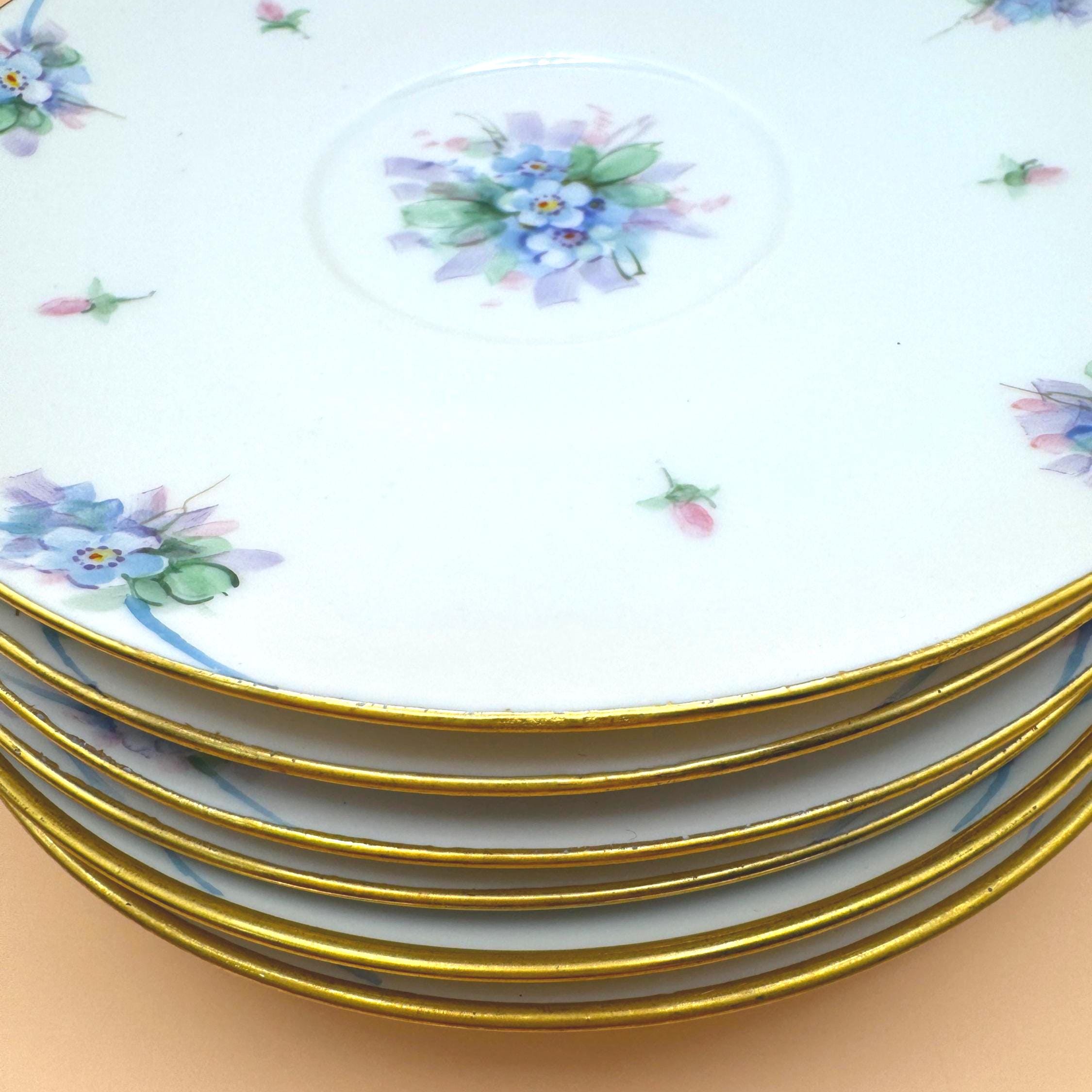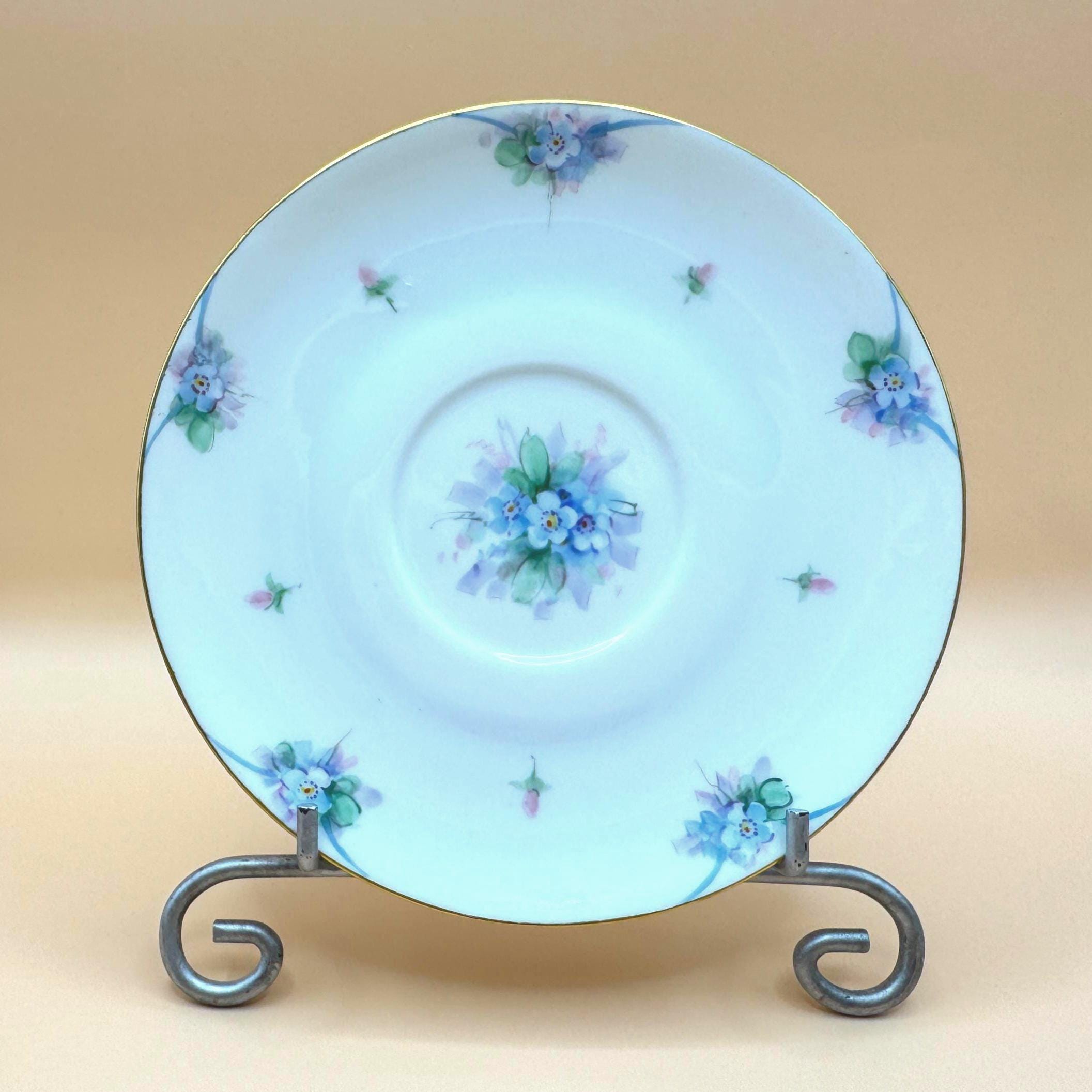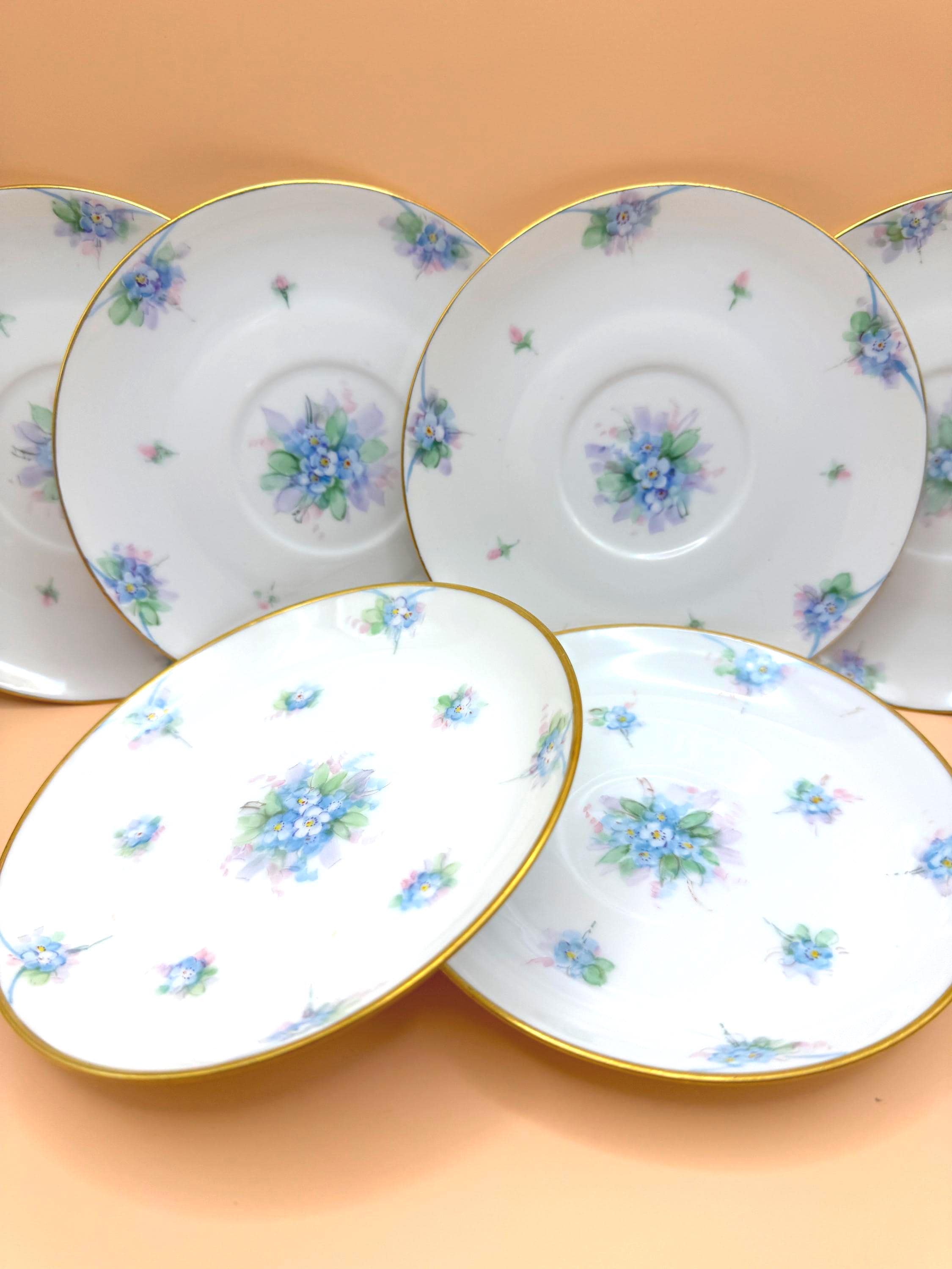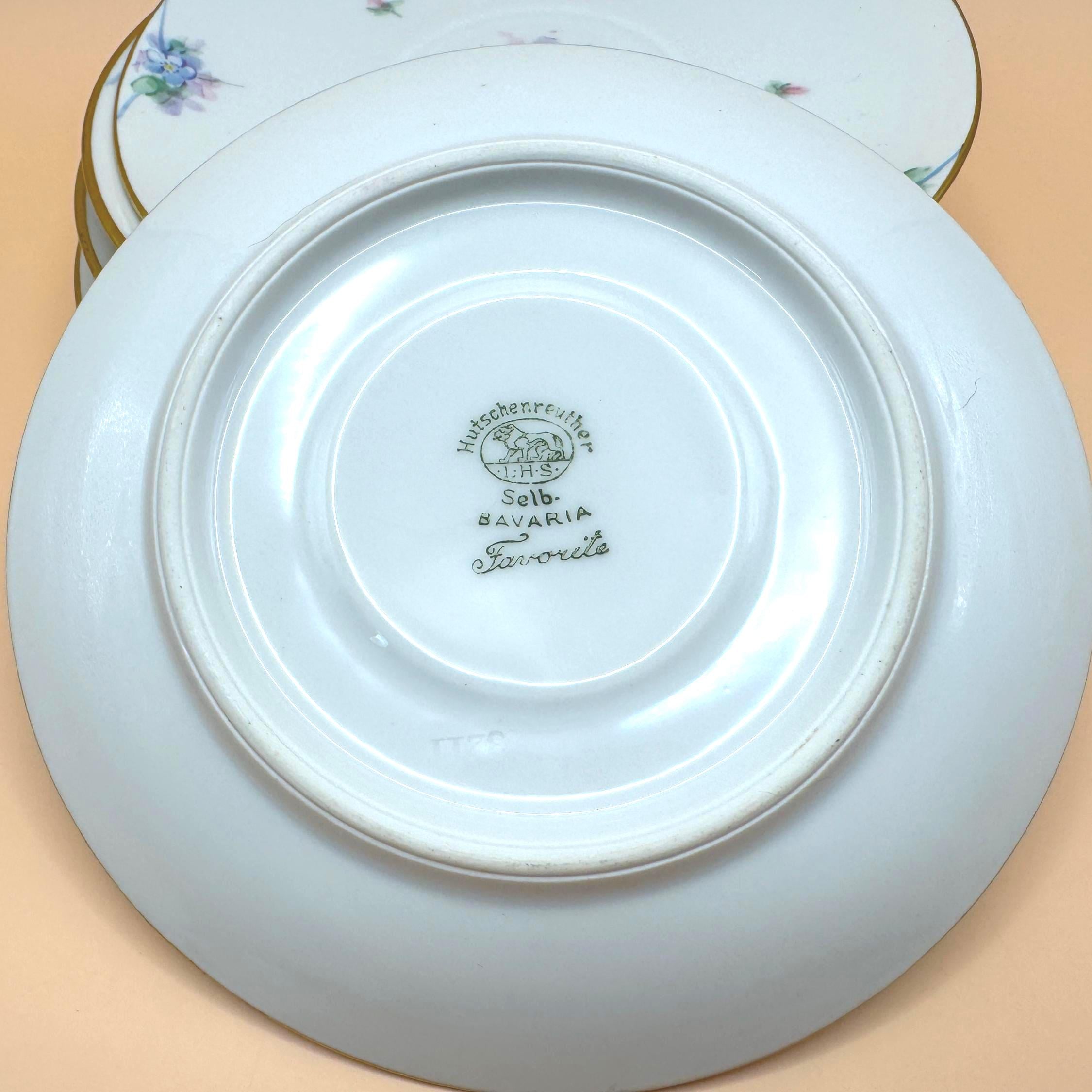 Elegant vintage porcelain saucers by Hutschenreuther, made in Selb, Bavaria, Germany. These saucers feature a white porcelain body decorated with soft blue floral bouquets, delicate accent florals, and a gold-trimmed rim for a refined, classic look.